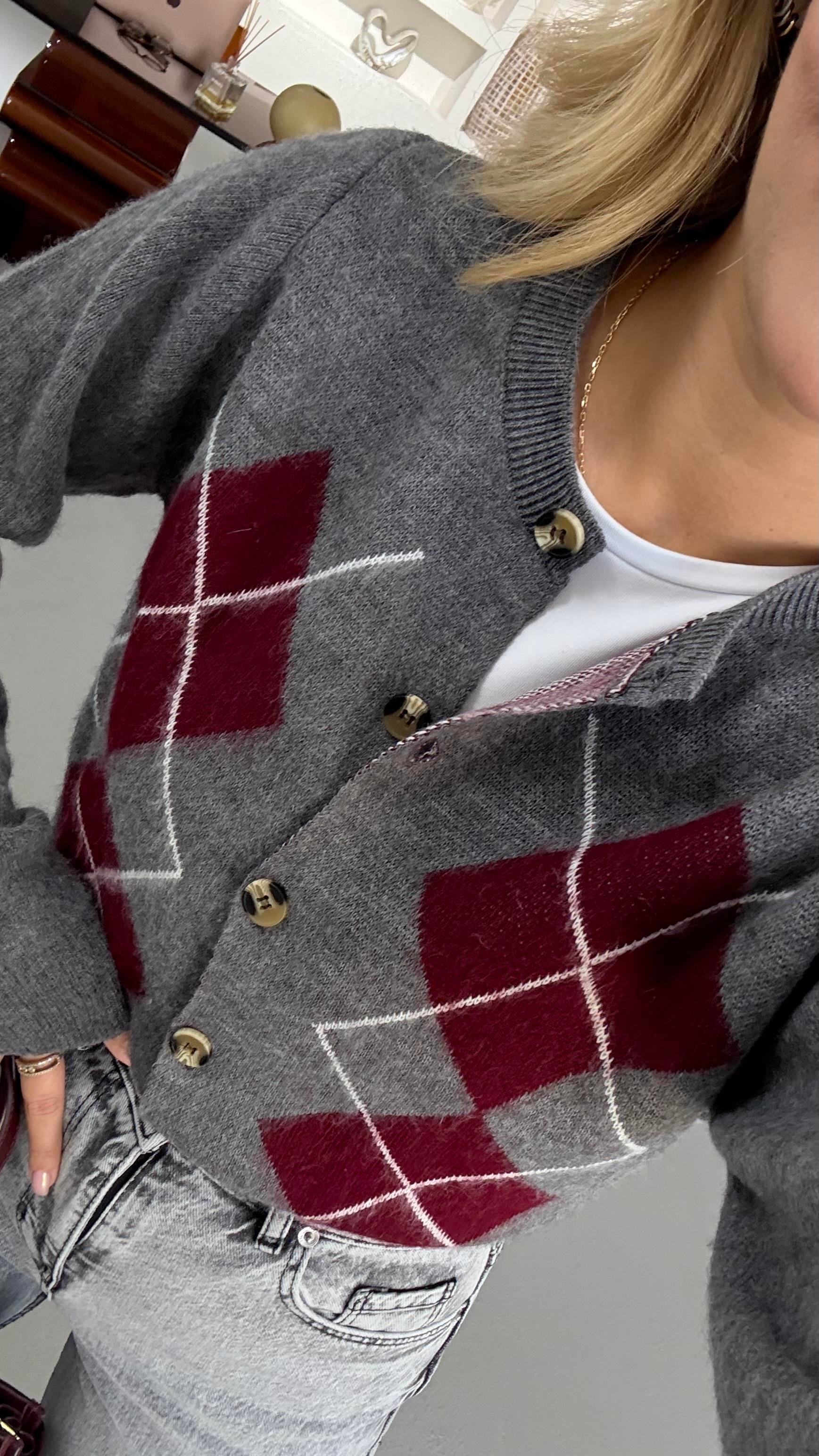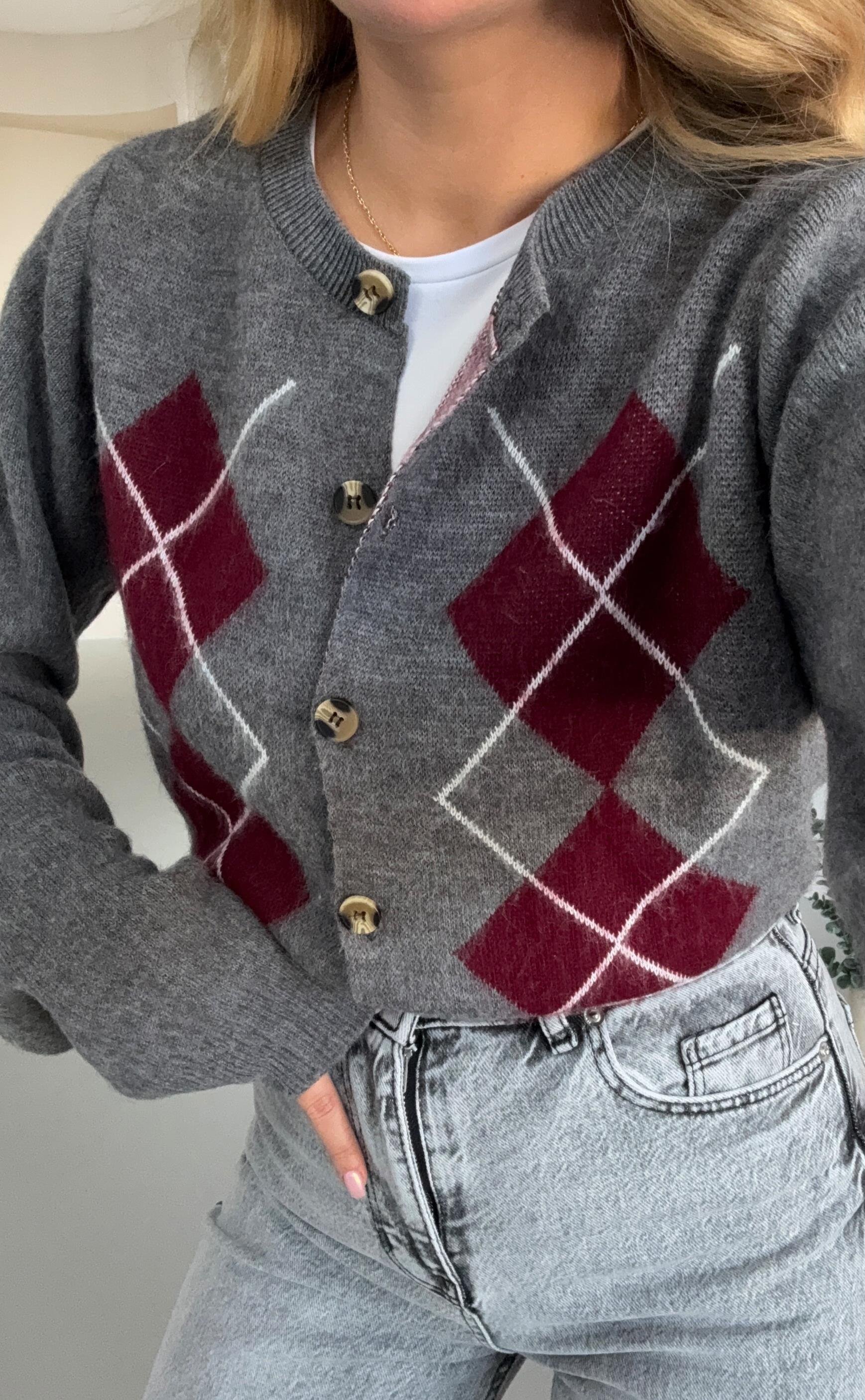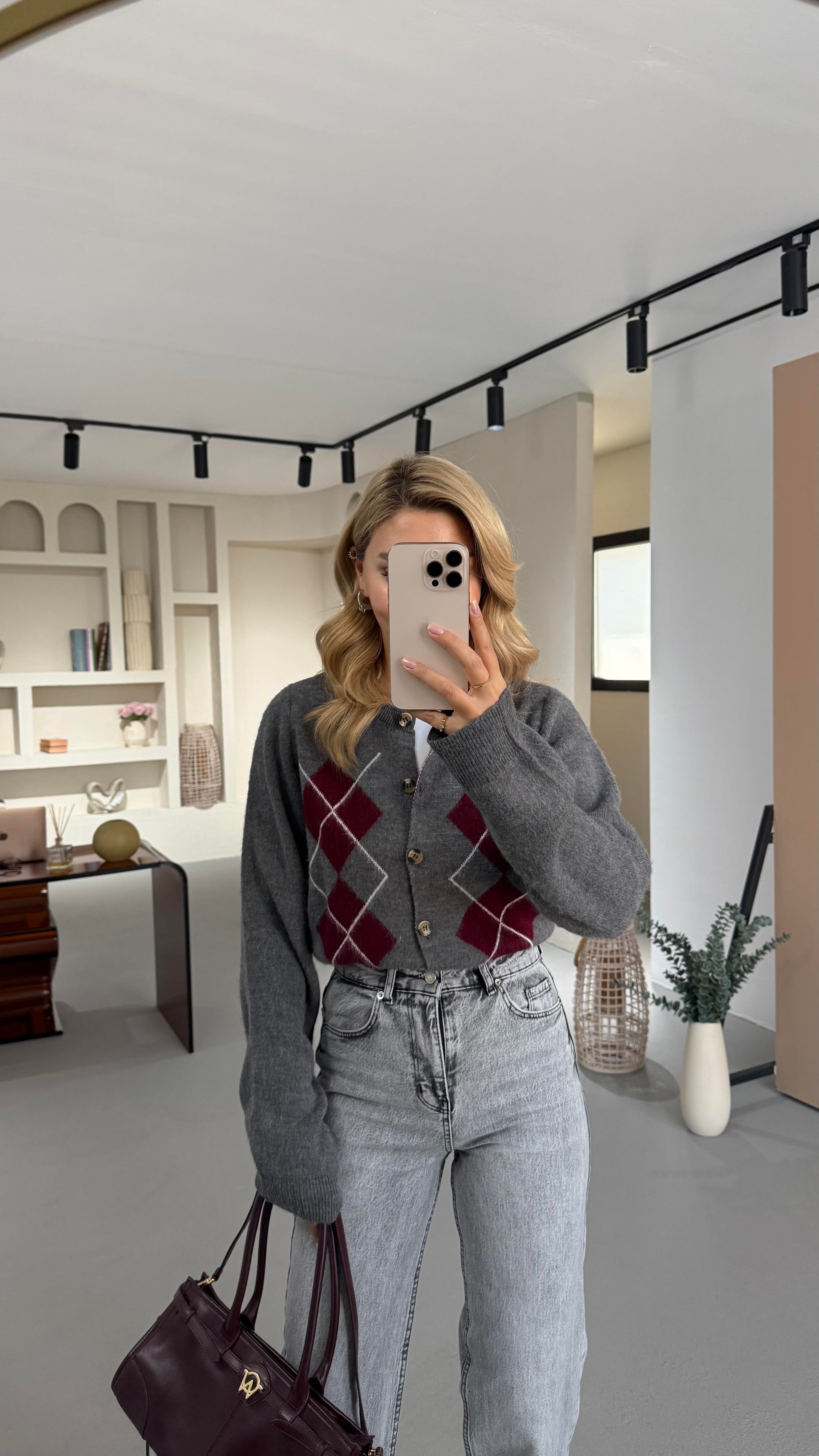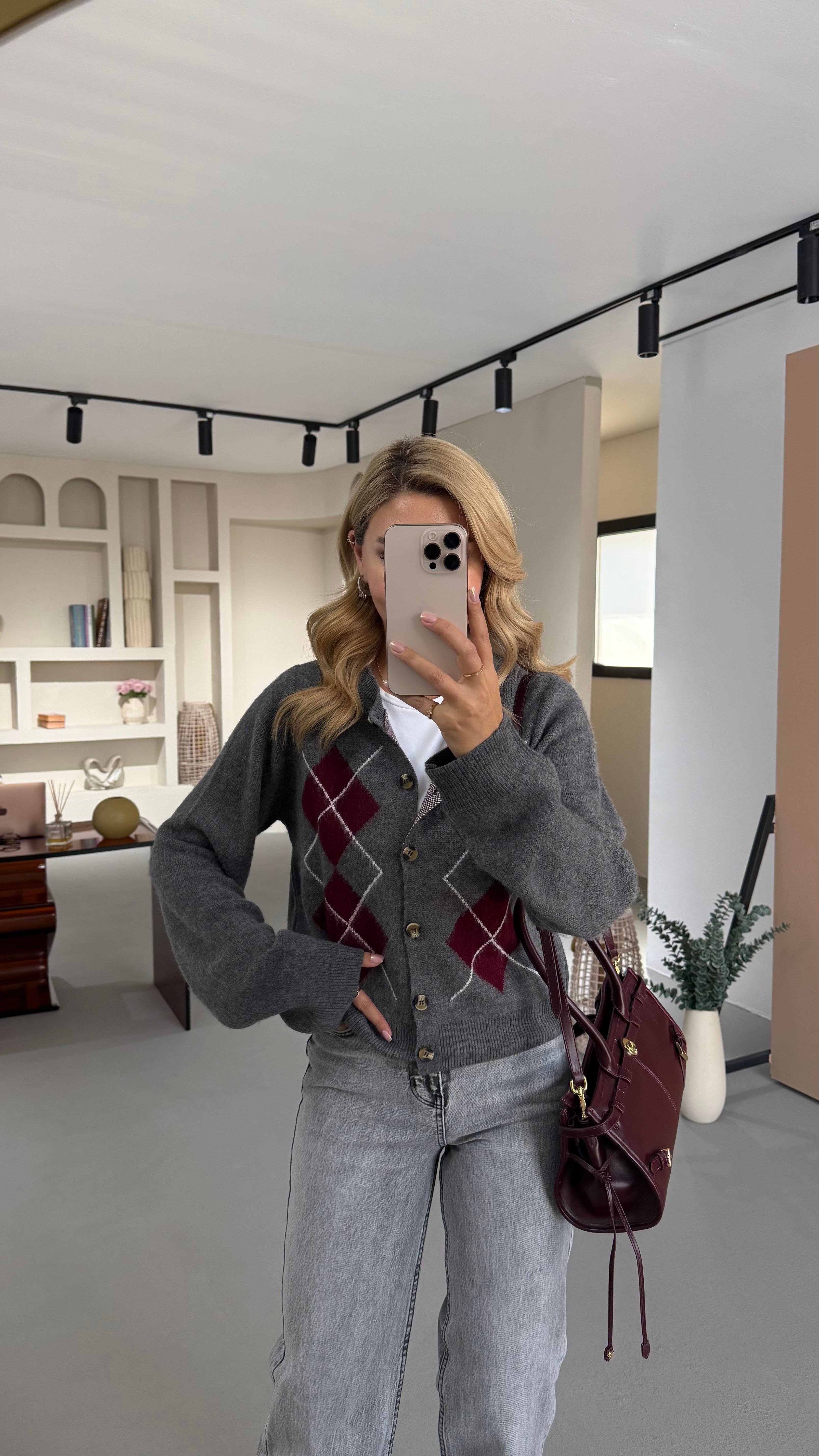 Baklava Desen Kemik Düğmeli Antrasit Yumoş Hırka