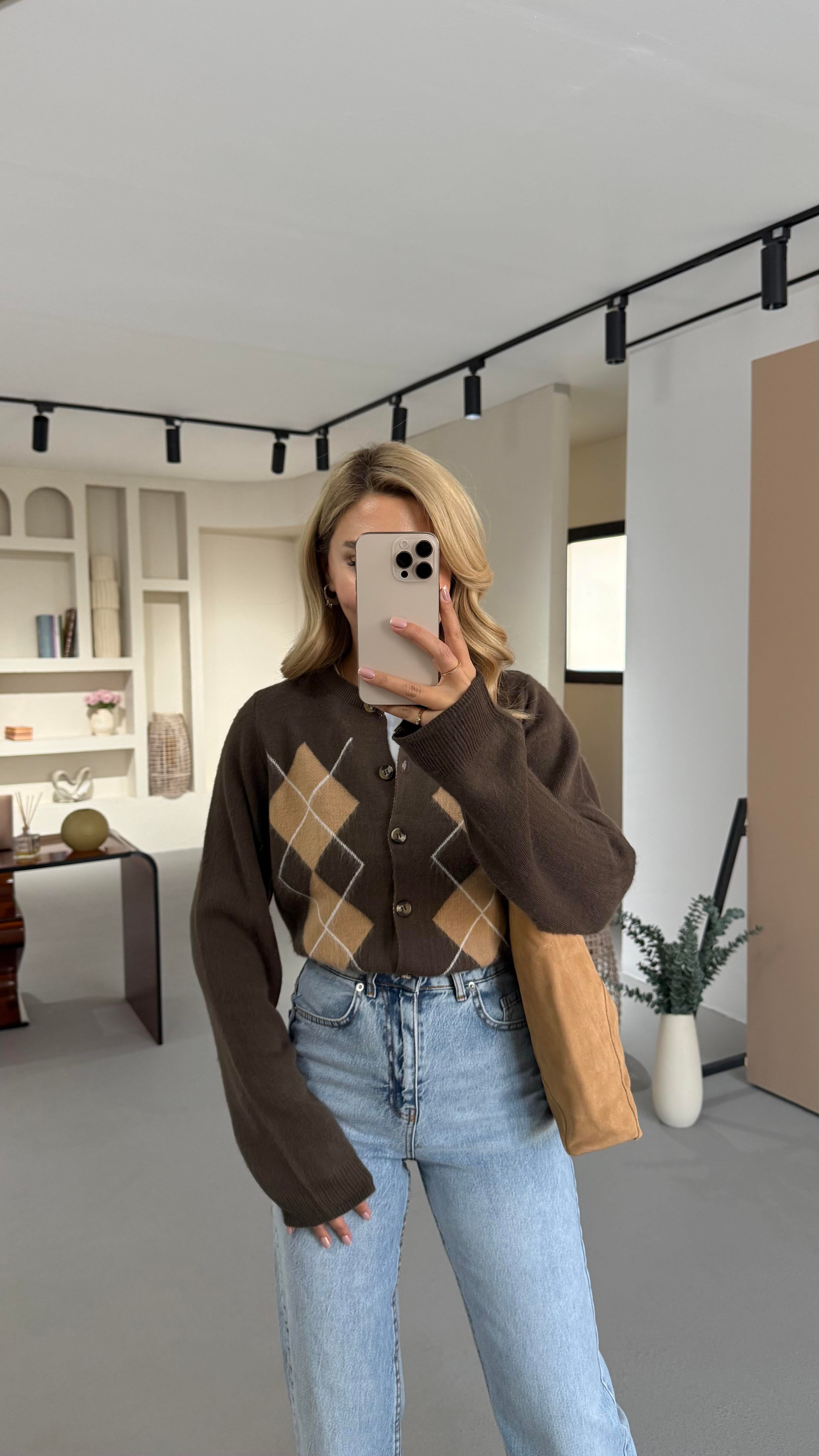 Baklava Desen Kemik Düğmeli Kahve Yumoş Hırka