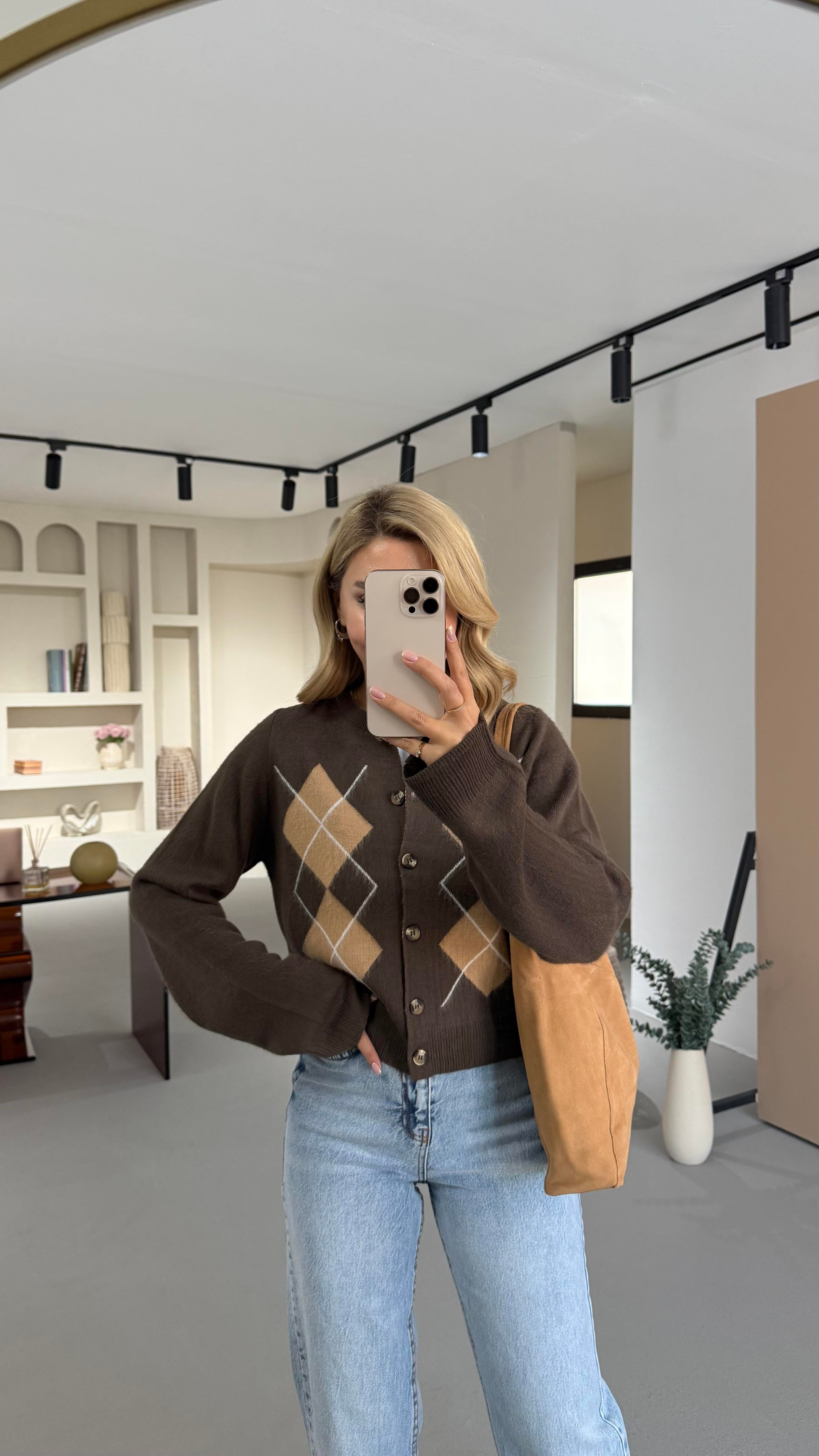 Baklava Desen Kemik Düğmeli Kahve Yumoş Hırka (HRK-0080-KHV)