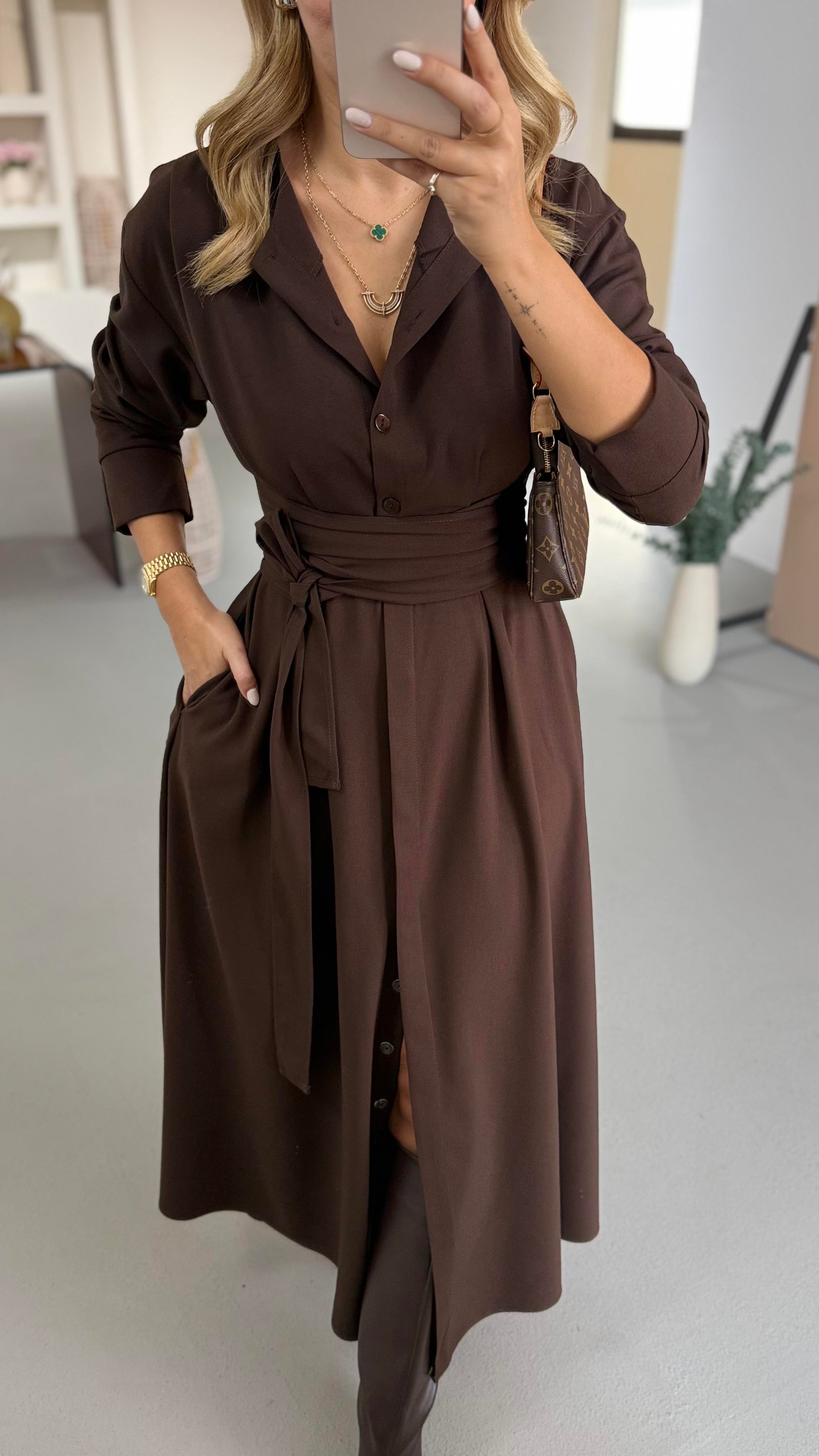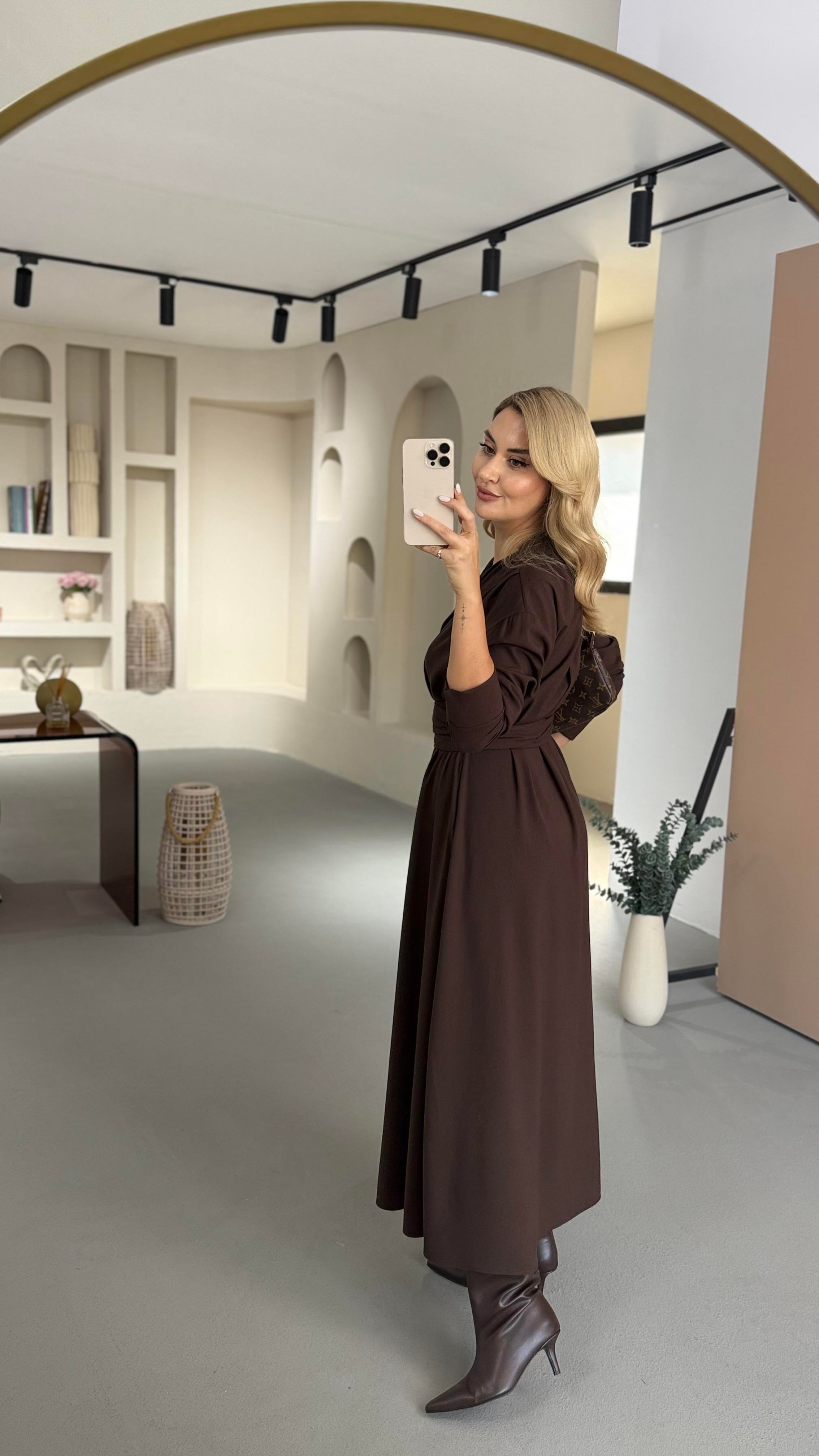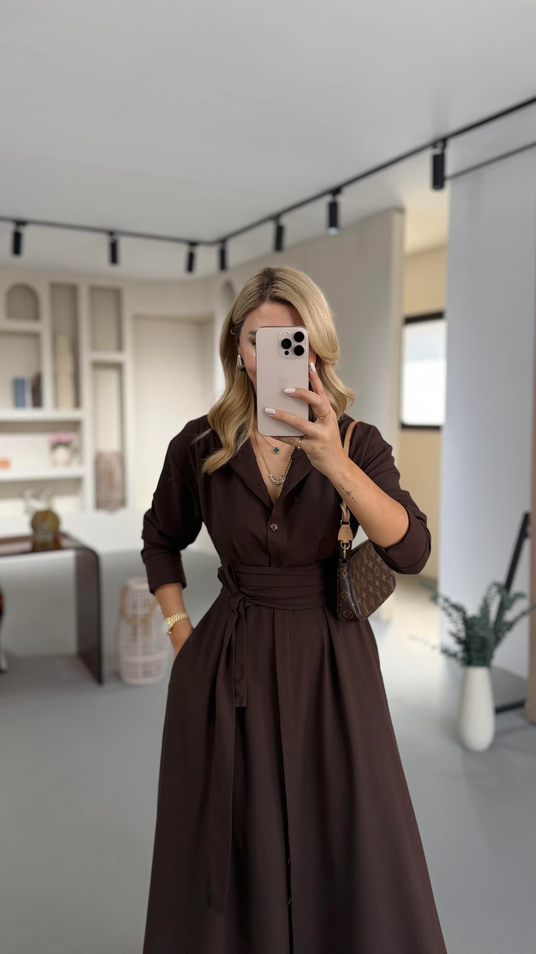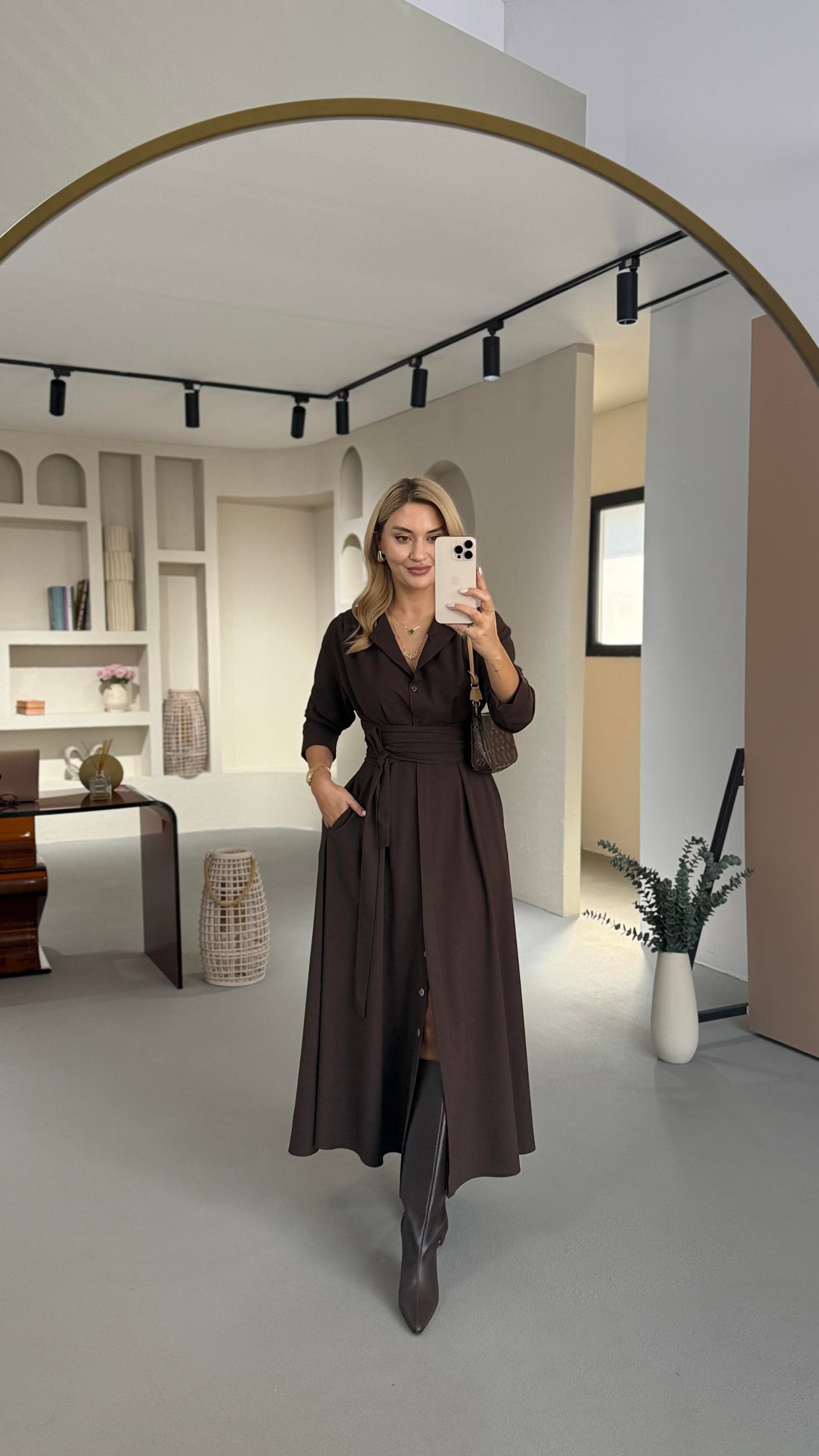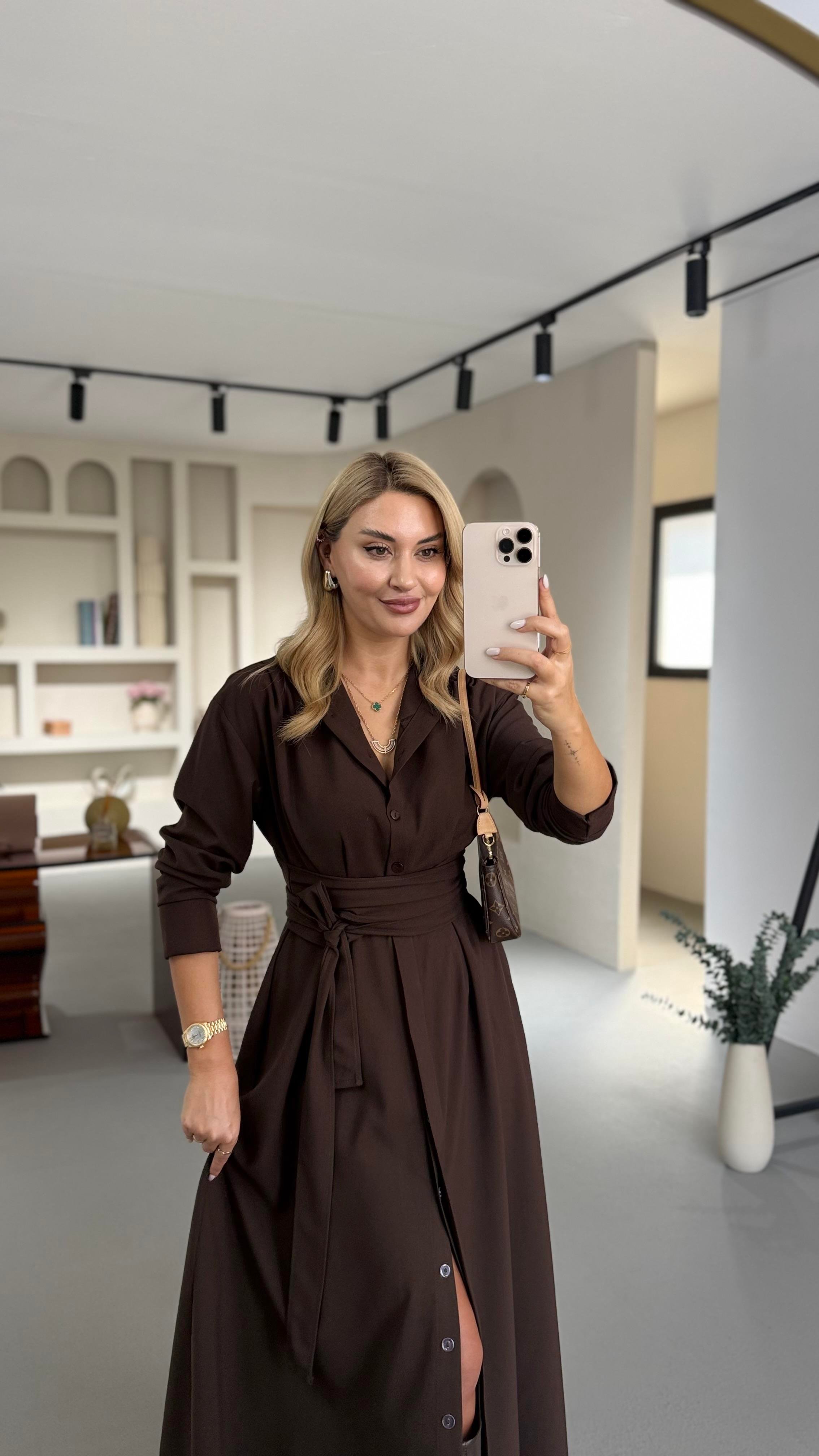 Bel Bağlama Detay Boydan Düğmeli Kahve Çan Elbise (ELB-0754-KHV)