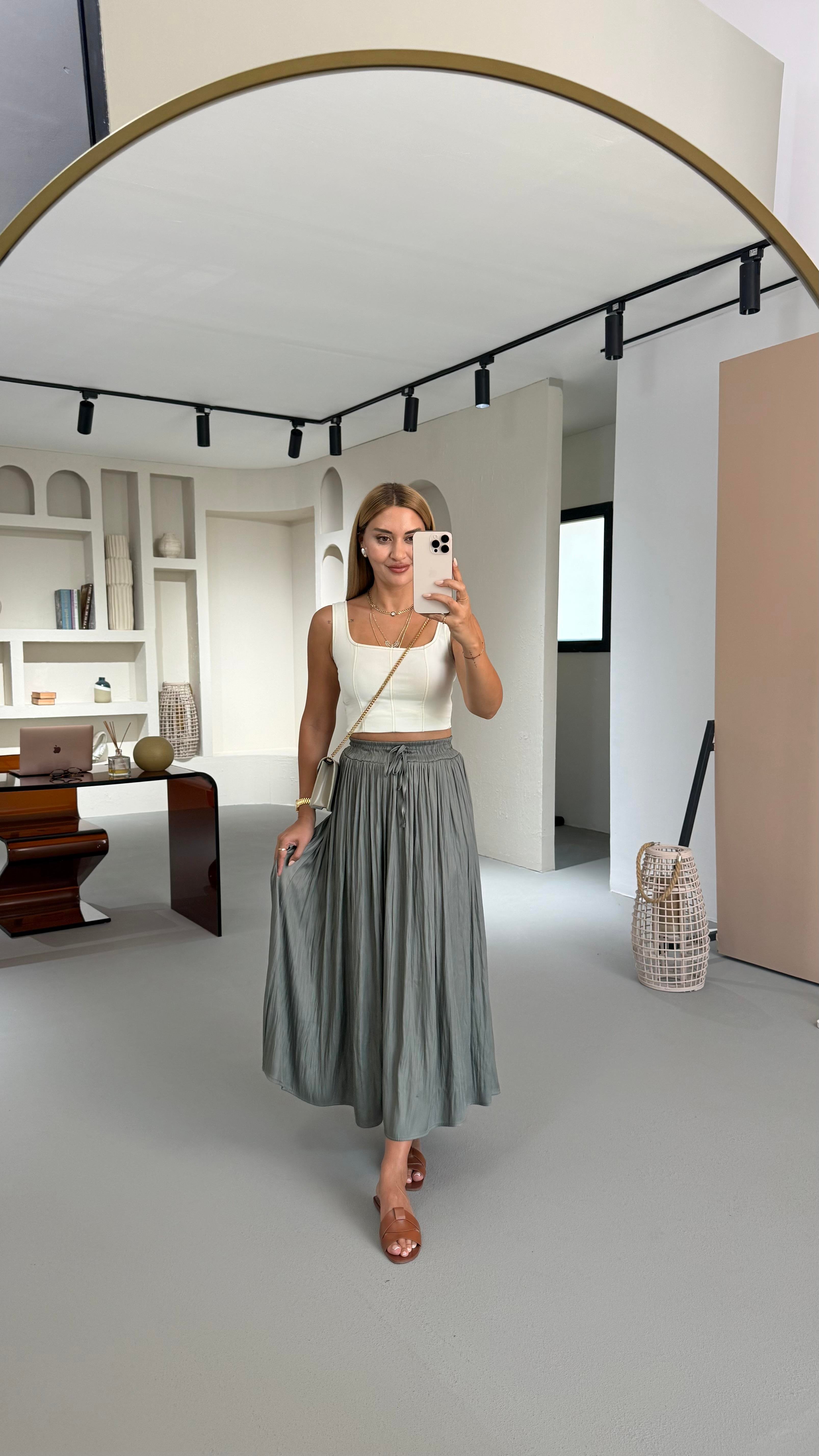 Bel Lastikli Kırışık Doku Saten Midi Haki Etek