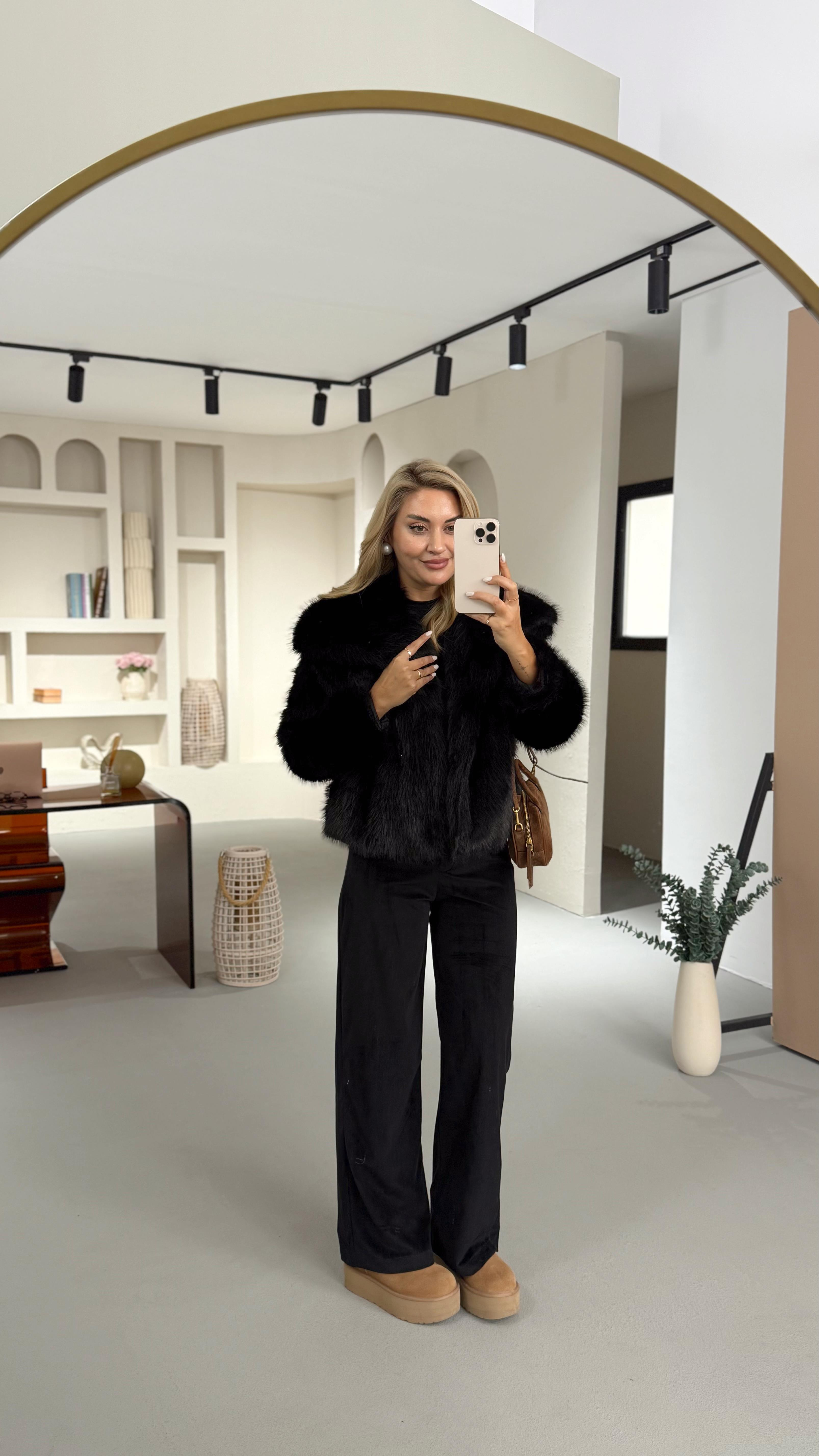 Belden Lastikli Kemer Detay Siyah Kadife Pantolon (PNT-0566-SYH)