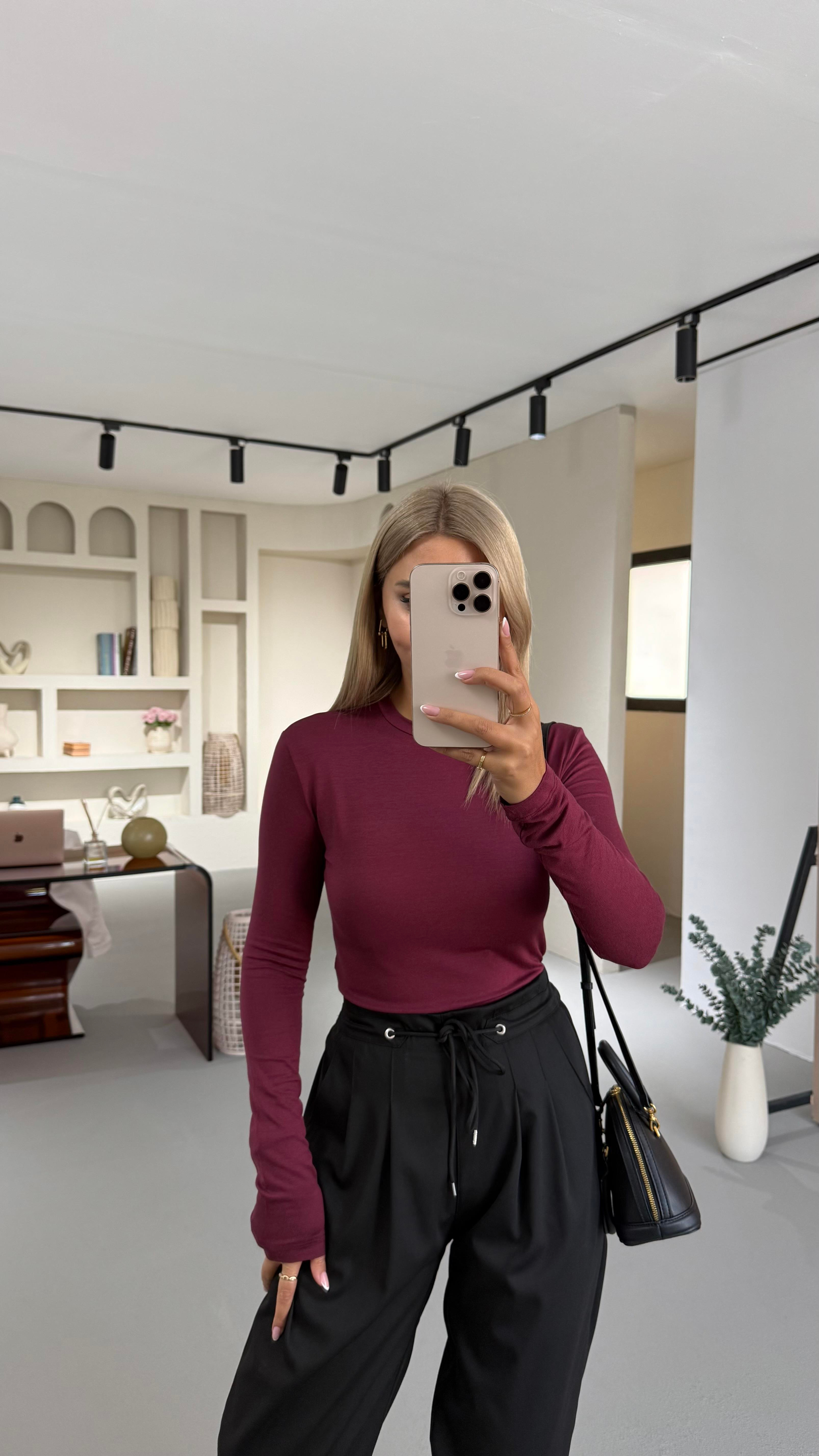 Bisiklet Yaka Uzun Kol Bordo Basic Tshirt