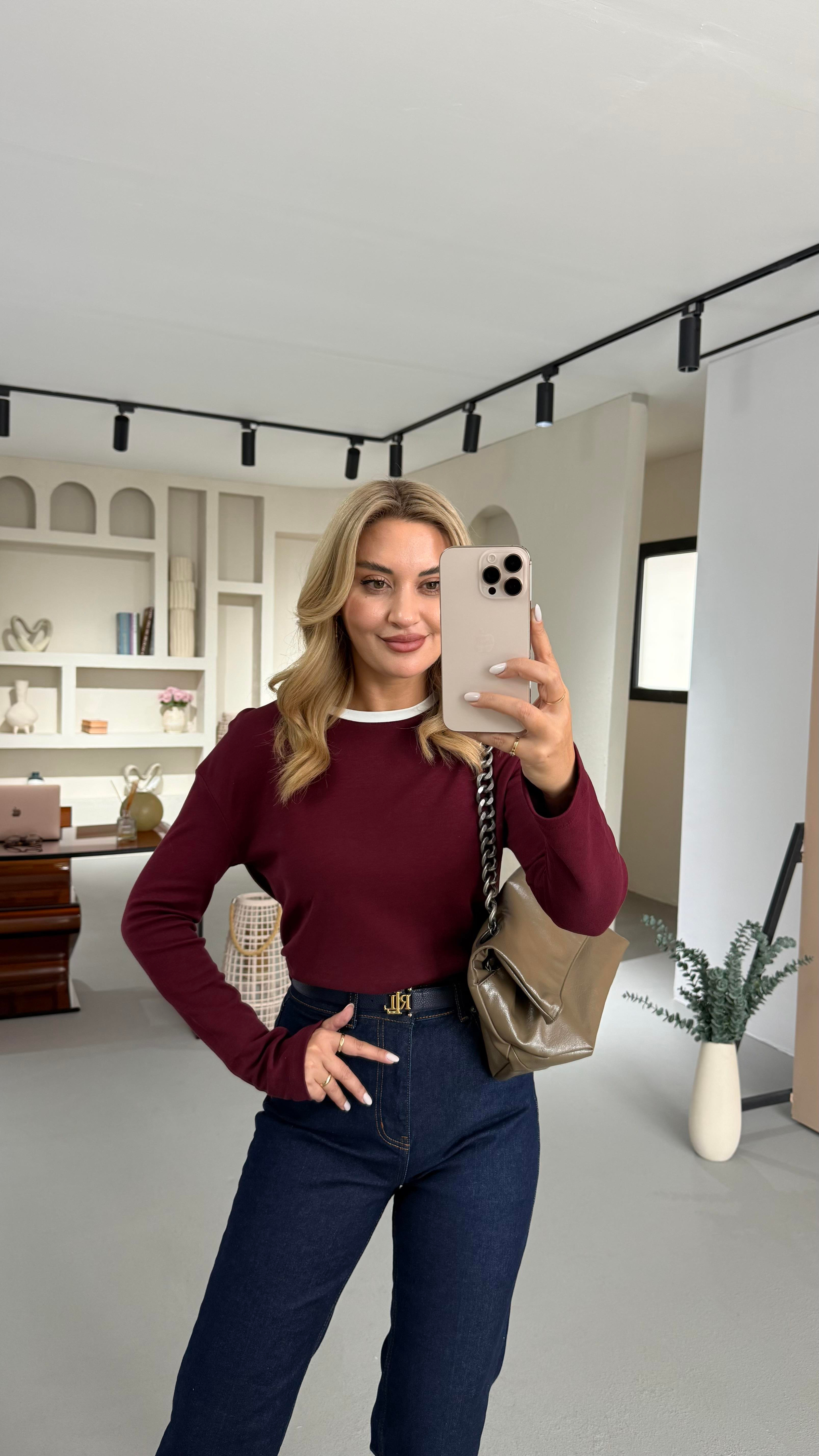 Biye Detay Bordo Uzun Kol Basic Sweat
