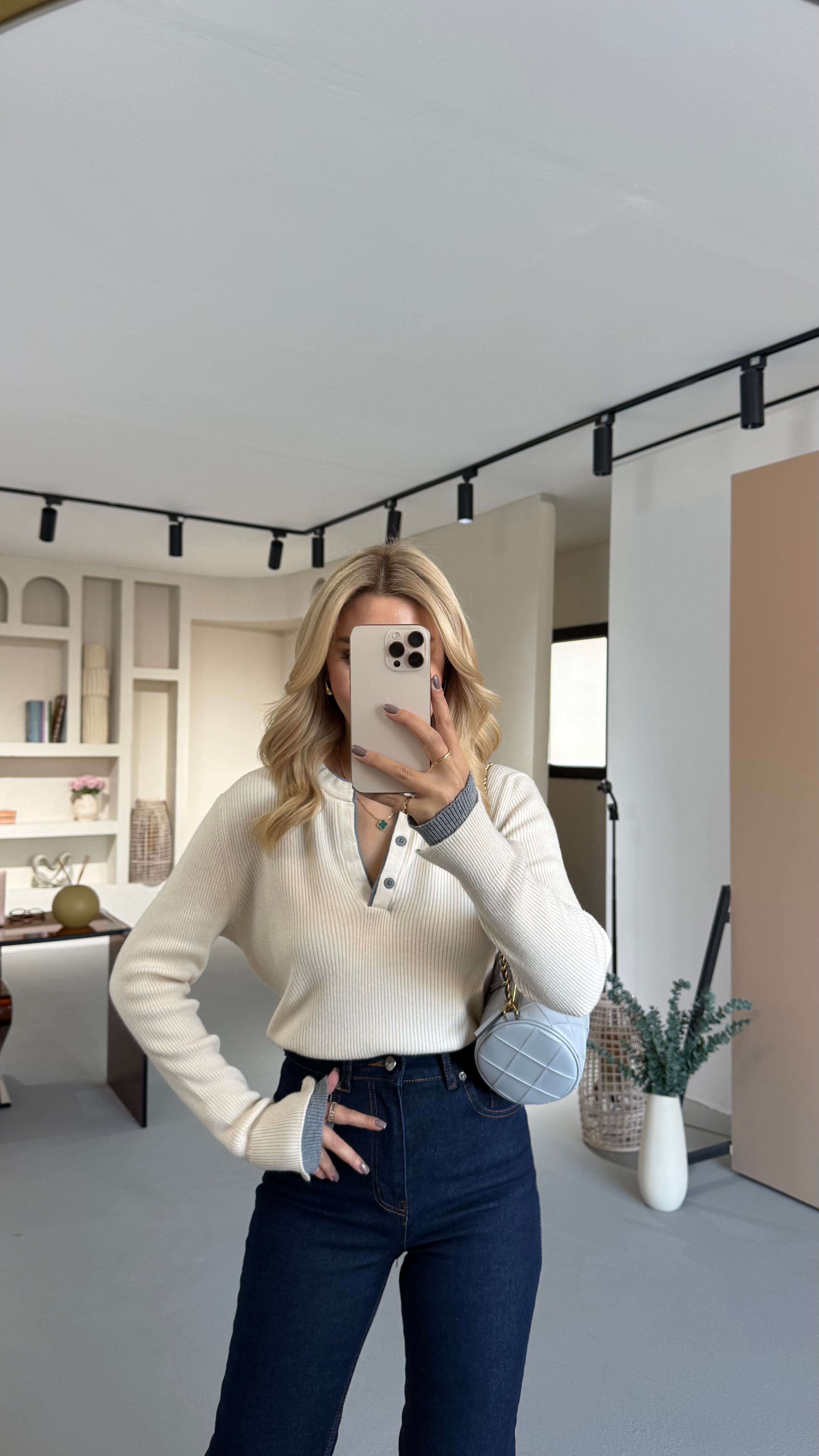 Biye Detay Düğmeli Krem Triko