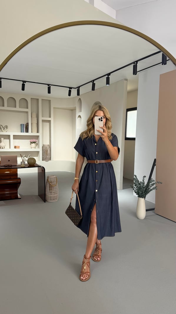 Boydan Düğmeli Kemer Detay Lacivert Tensel Denim Elbise (ELB-0744-LCV)