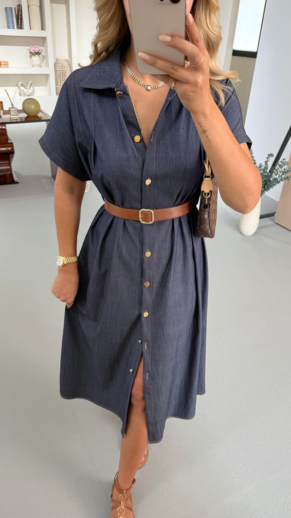 Boydan Düğmeli Kemer Detay Lacivert Tensel Denim Elbise