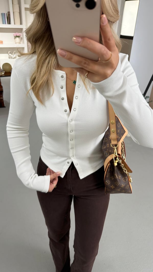 Boydan Pat Düğmeli Fitilli Beyaz Basic Bluz