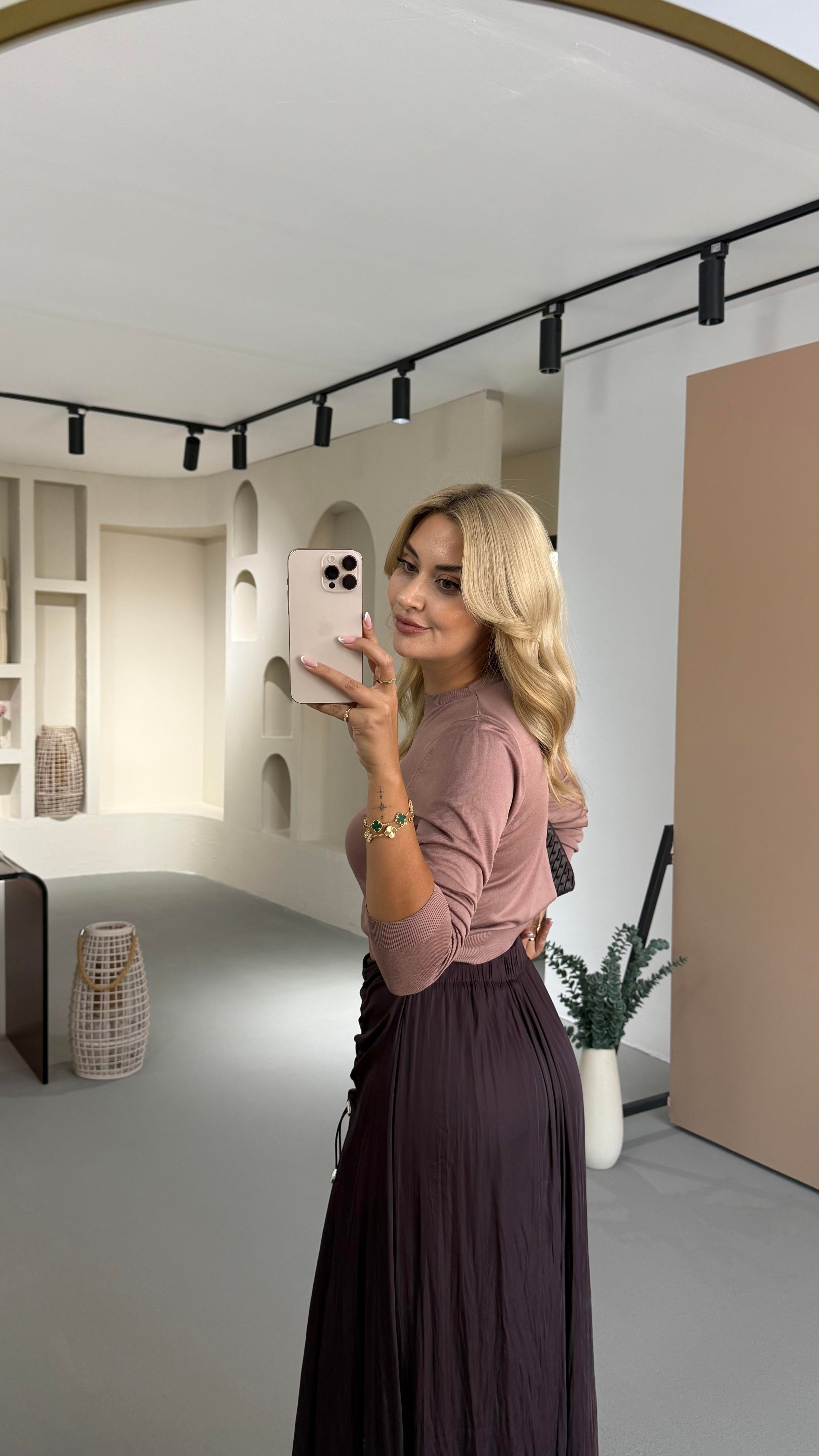 Büzgü Detay Bel Lastikli Kırışık Efekt Mürdüm Saten Etek