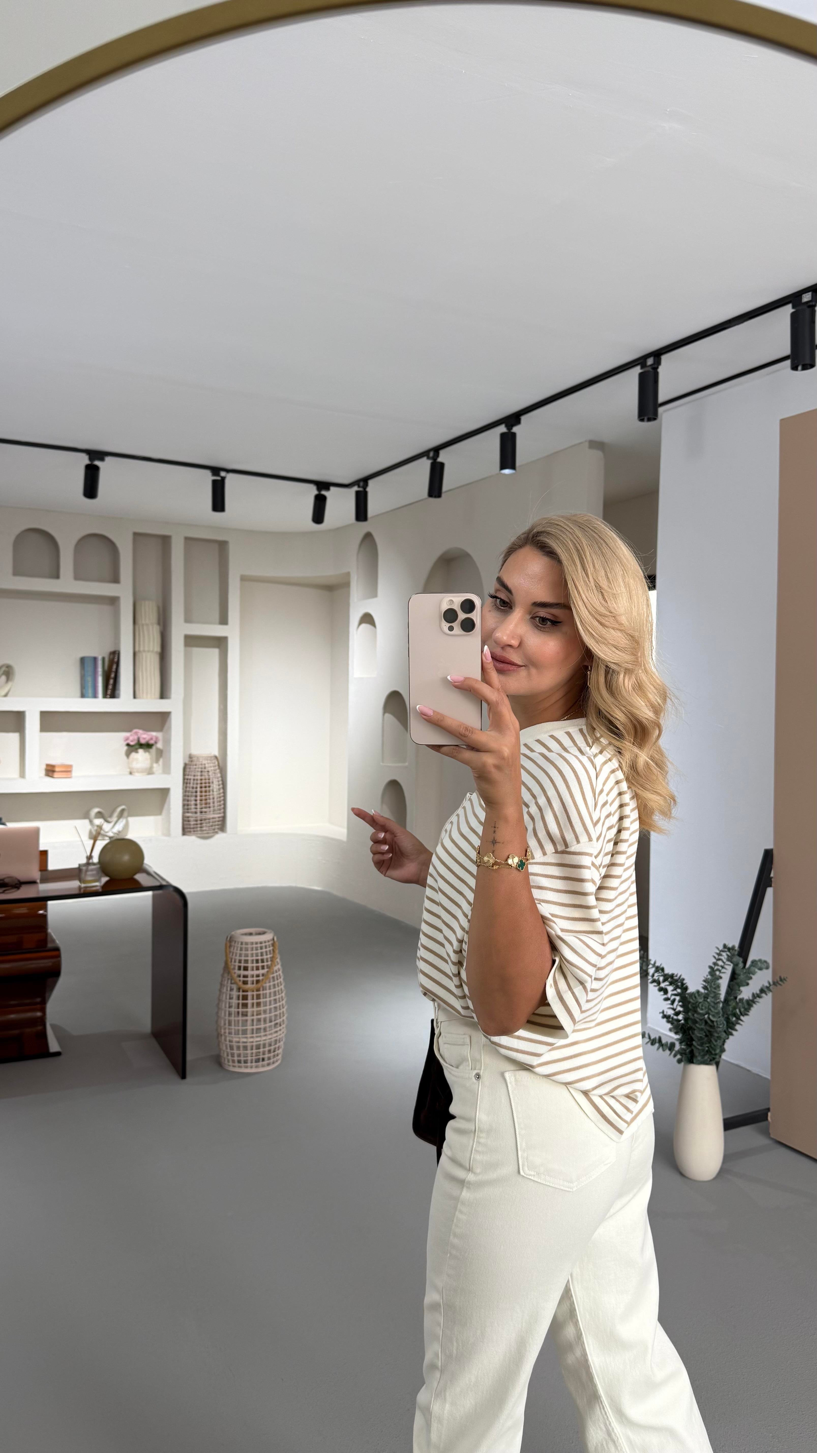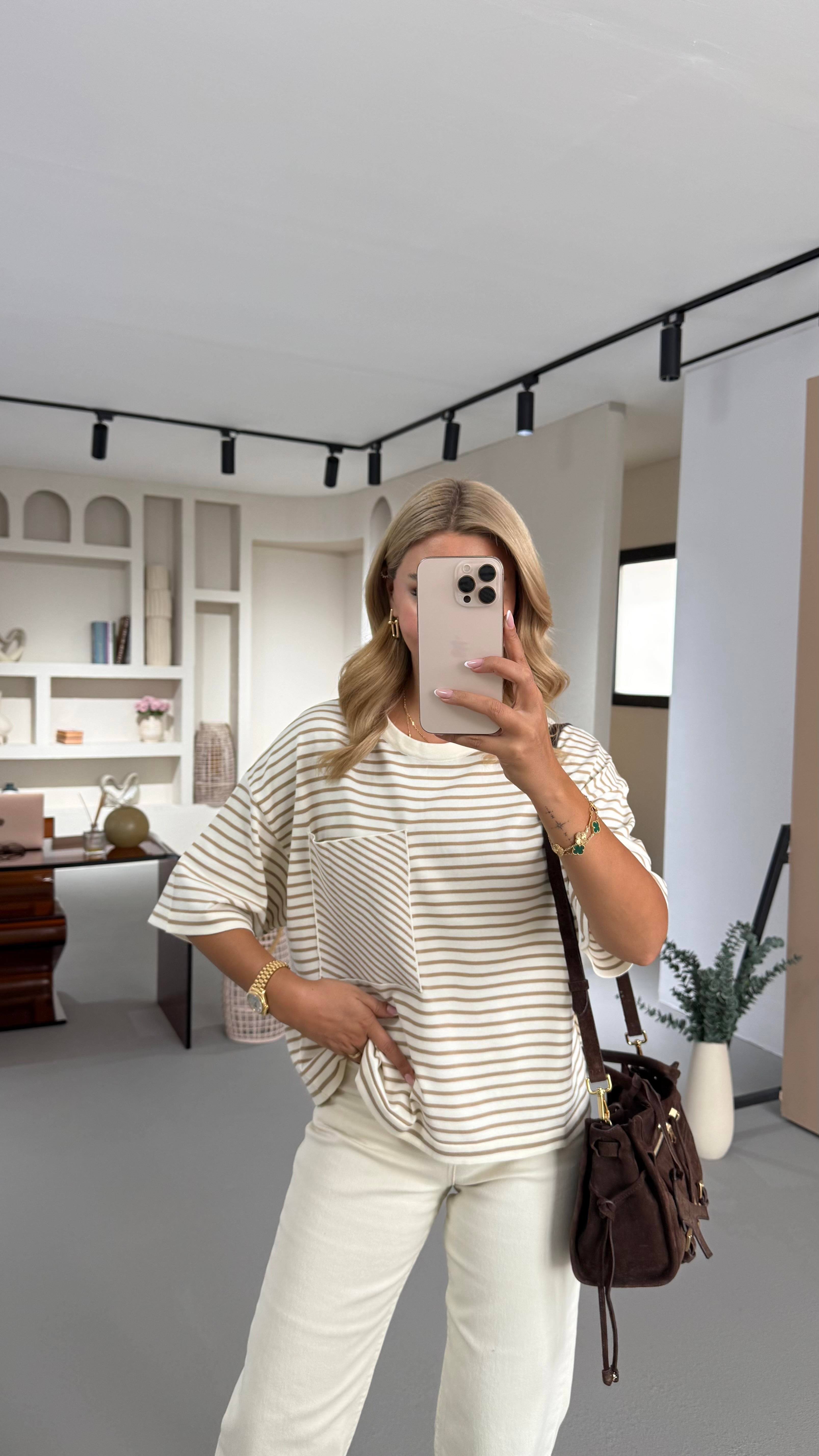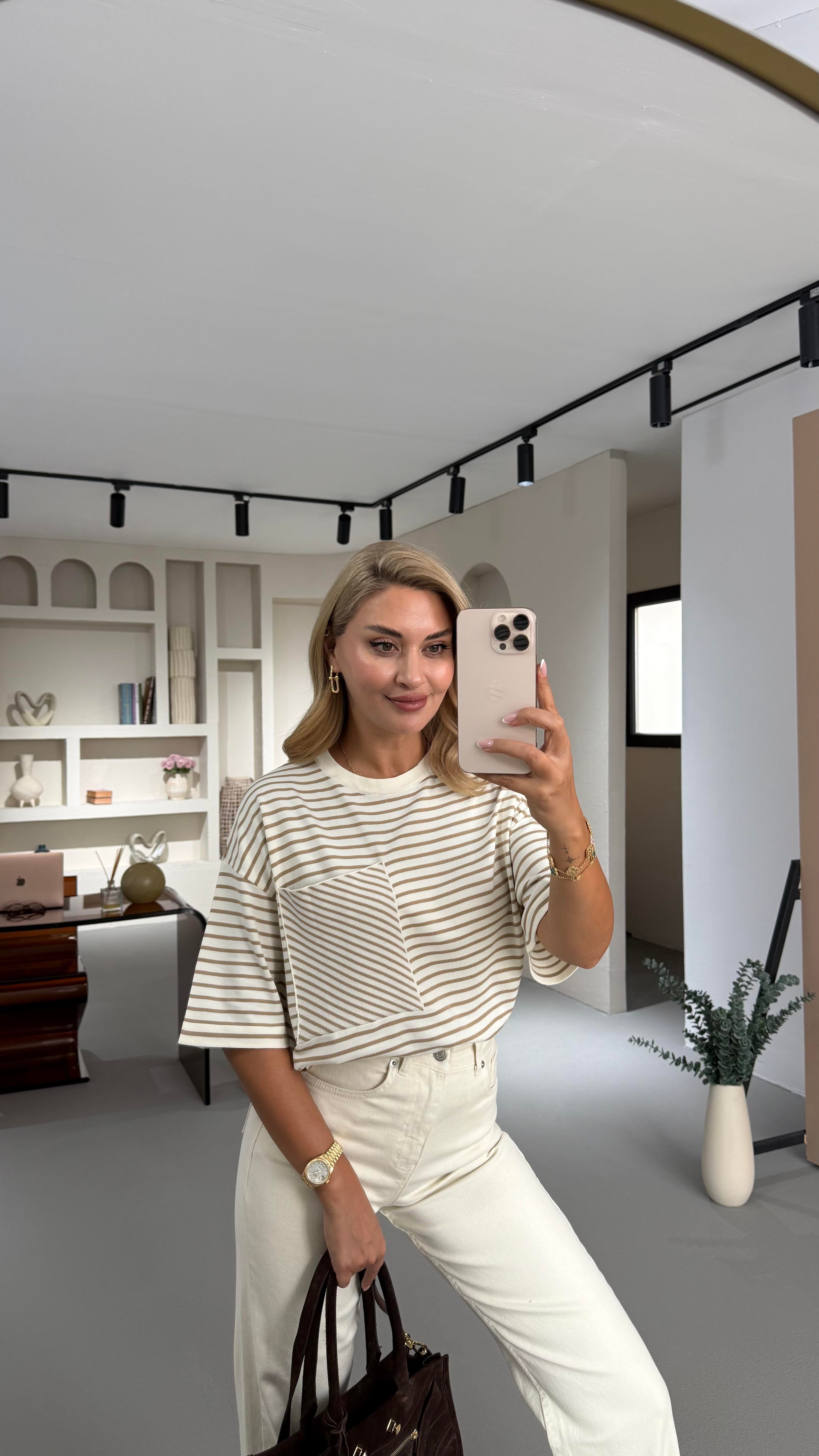 Cep Detay Camel Çizgili Oversize Triko (TRK-0156-CML)