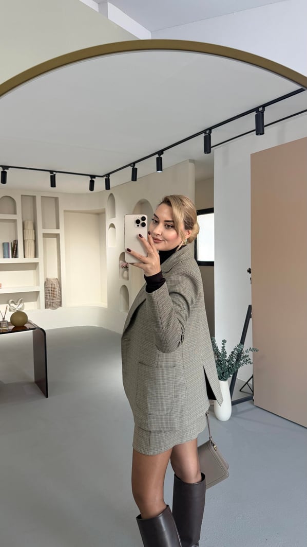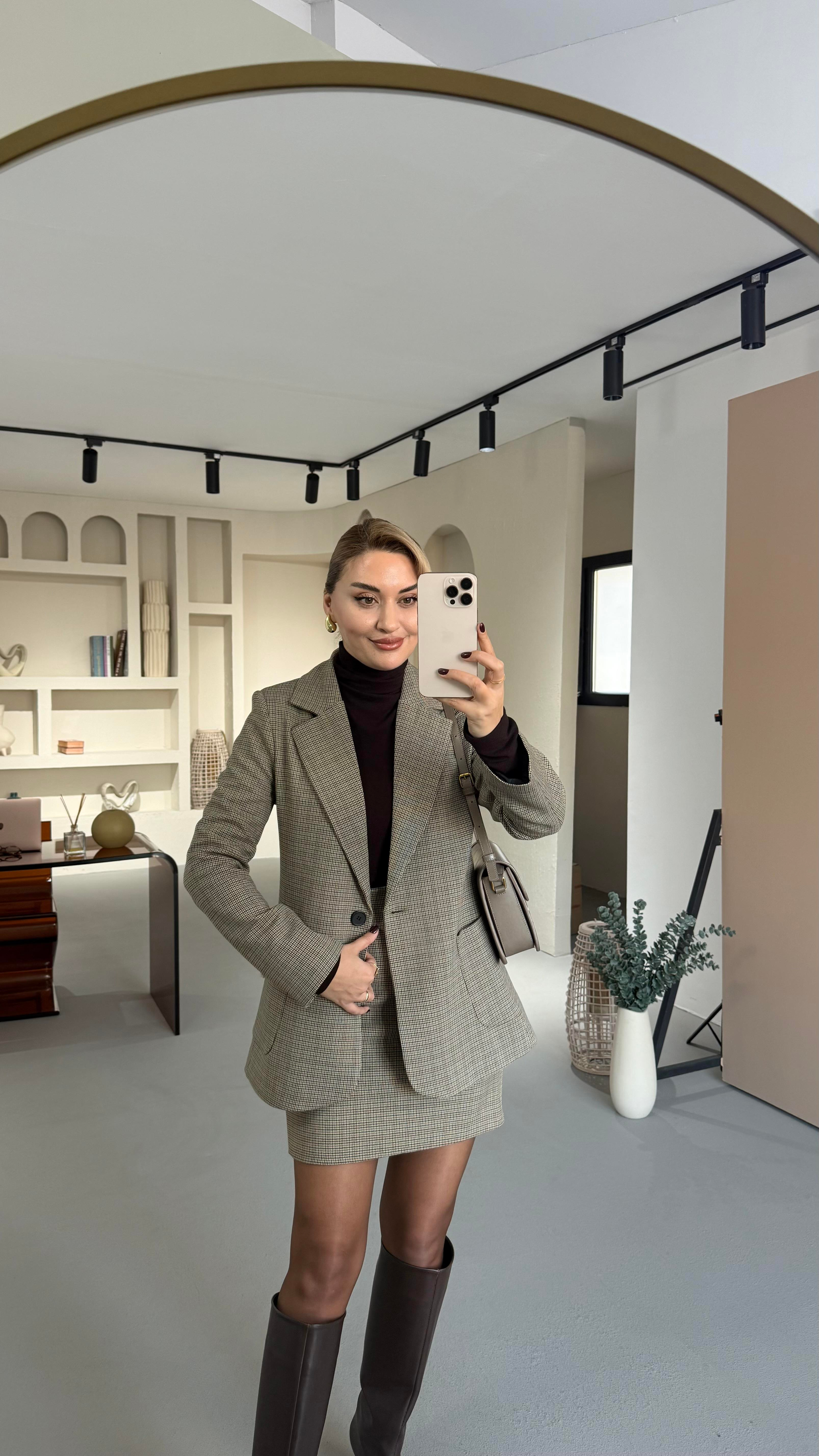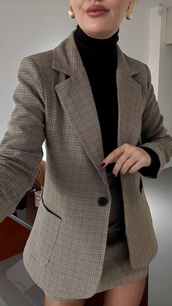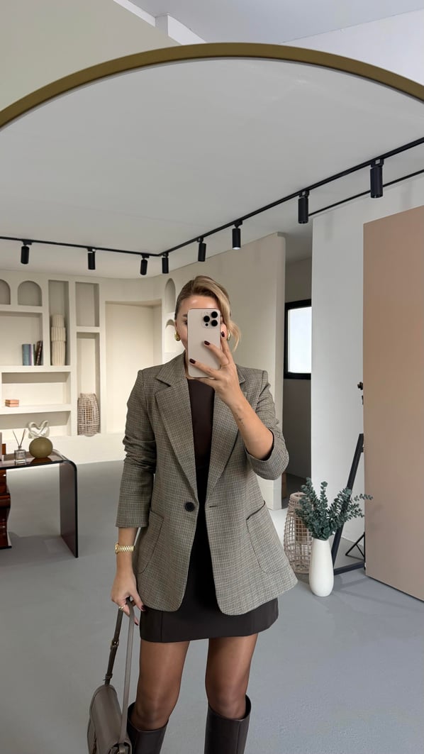Cep Detay Tek Düğmeli Kahve Kaz Ayağı Desen Ceket