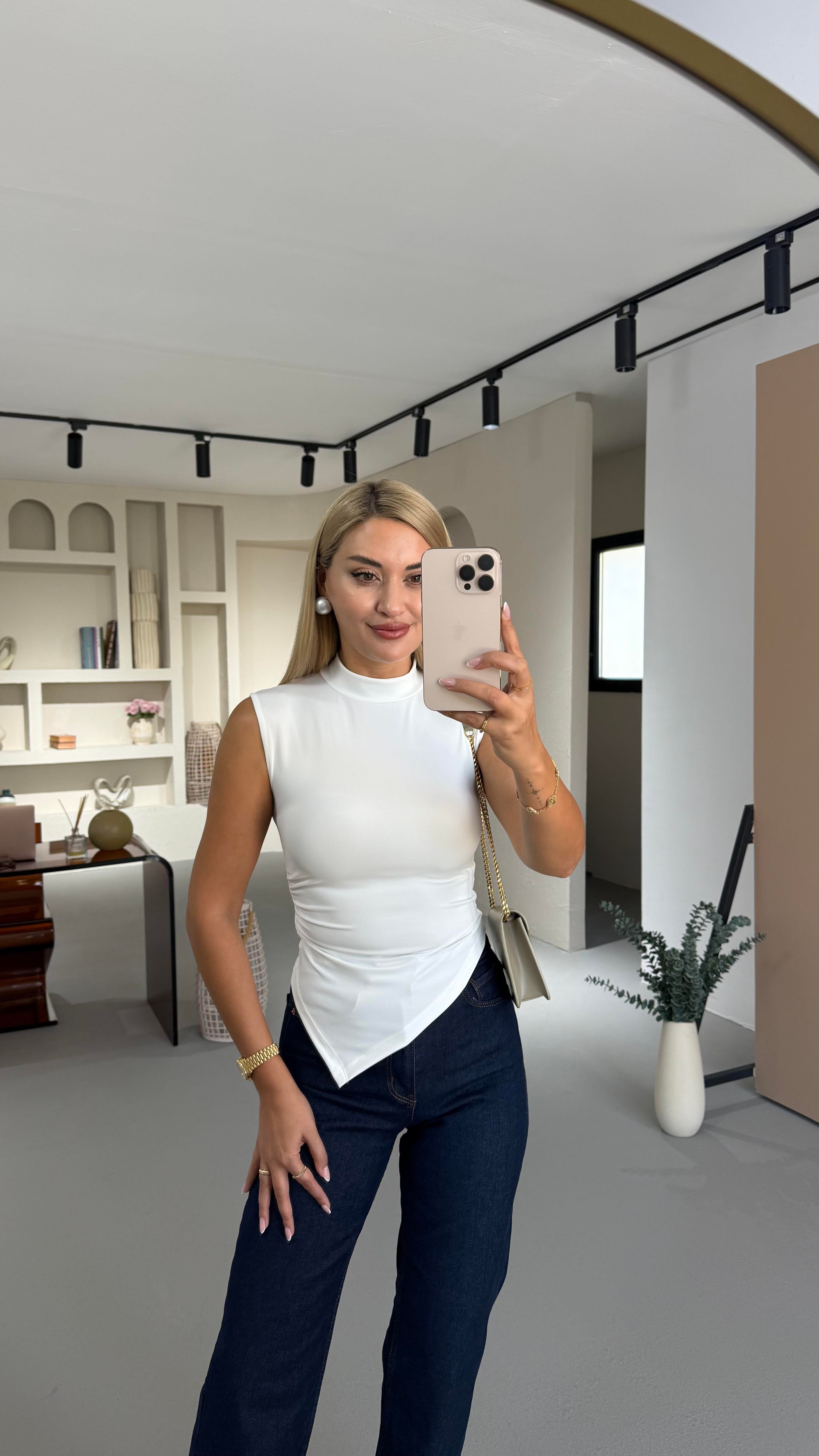 Dik Yaka Drape Detay Ekru Asimetrik Kesim Bluz