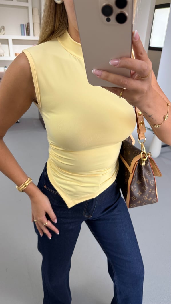 Dik Yaka Drape Detay Sarı Asimetrik Kesim Bluz