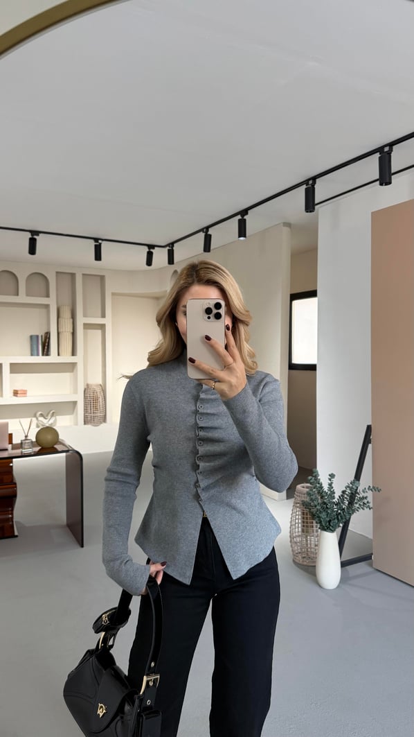 Dik Yaka Drapeli Gri Triko Hırka (HRK-0091-GRİ)