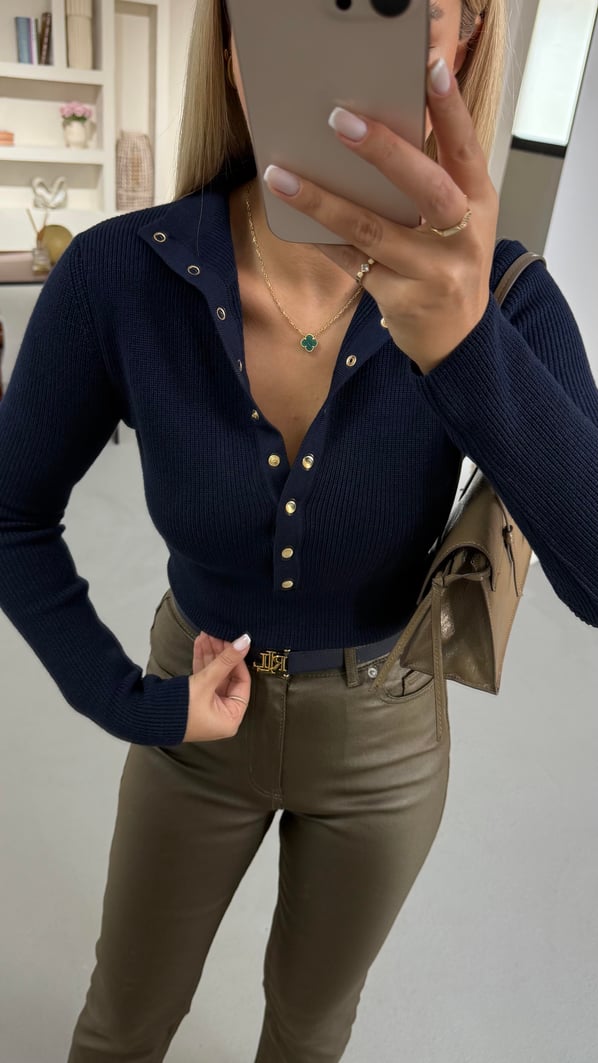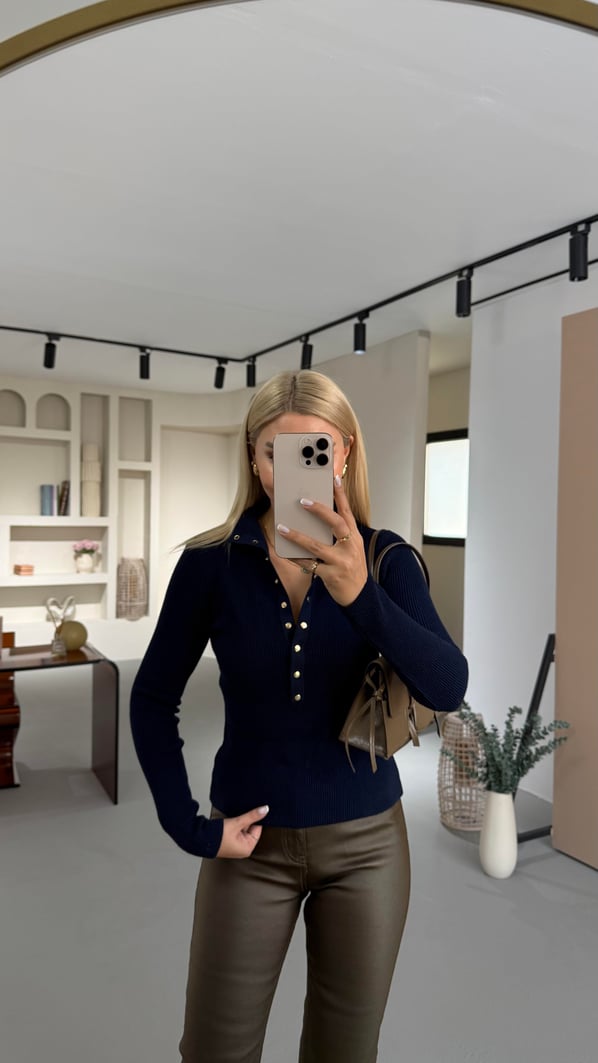 Dik Yaka Pat Düğmeli Lacivert Çelik Triko (TRK-0160-LCV)