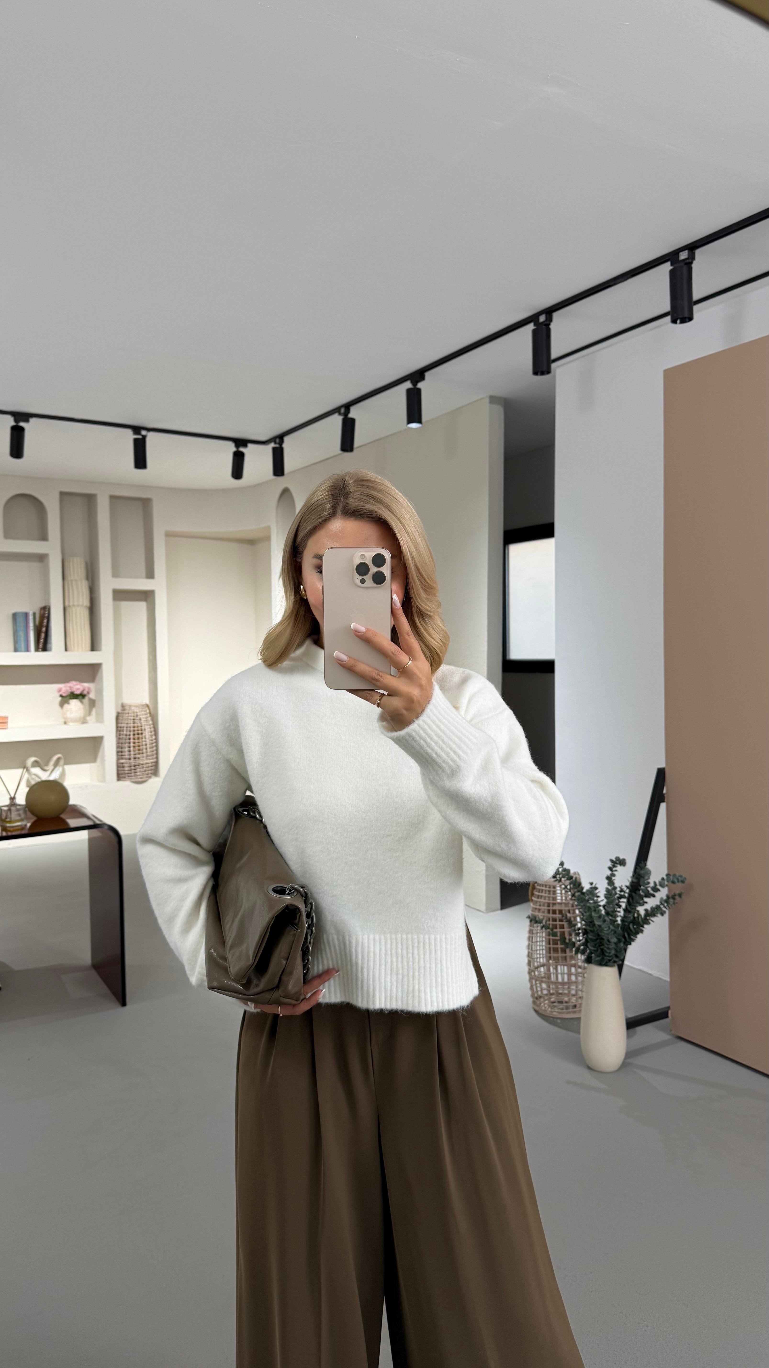 Dik Yaka Yırtmaç Detay Yumoş Dokulu Beyaz Kazak (KZK-0127-BYZ)