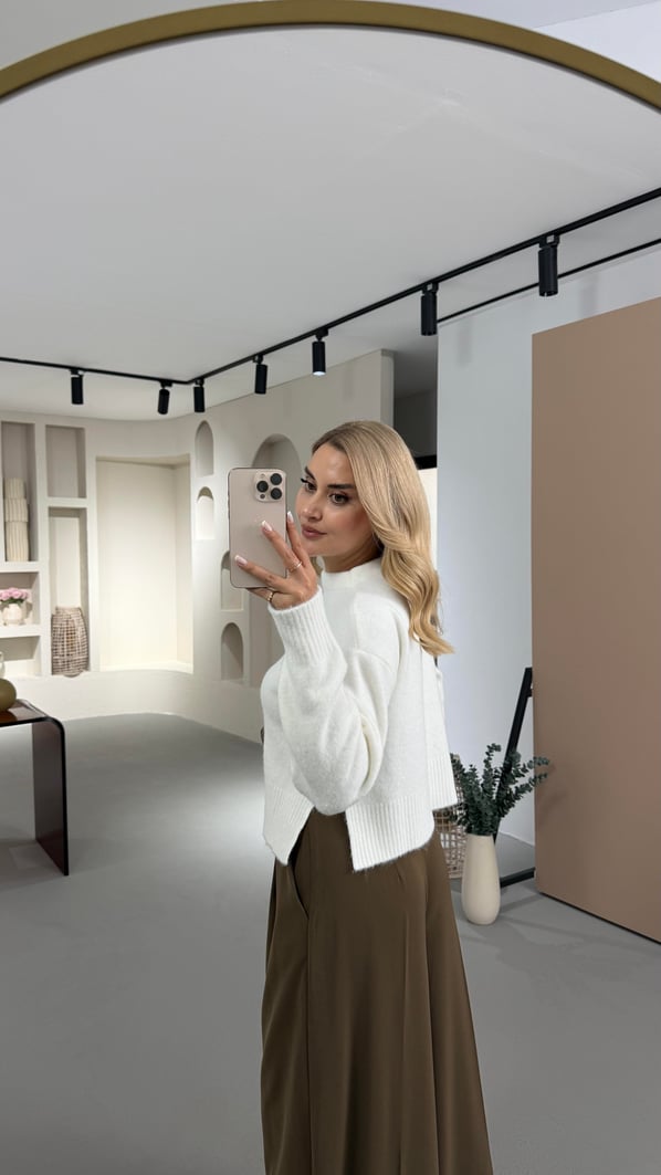 Dik Yaka Yırtmaç Detay Yumoş Dokulu Beyaz Kazak