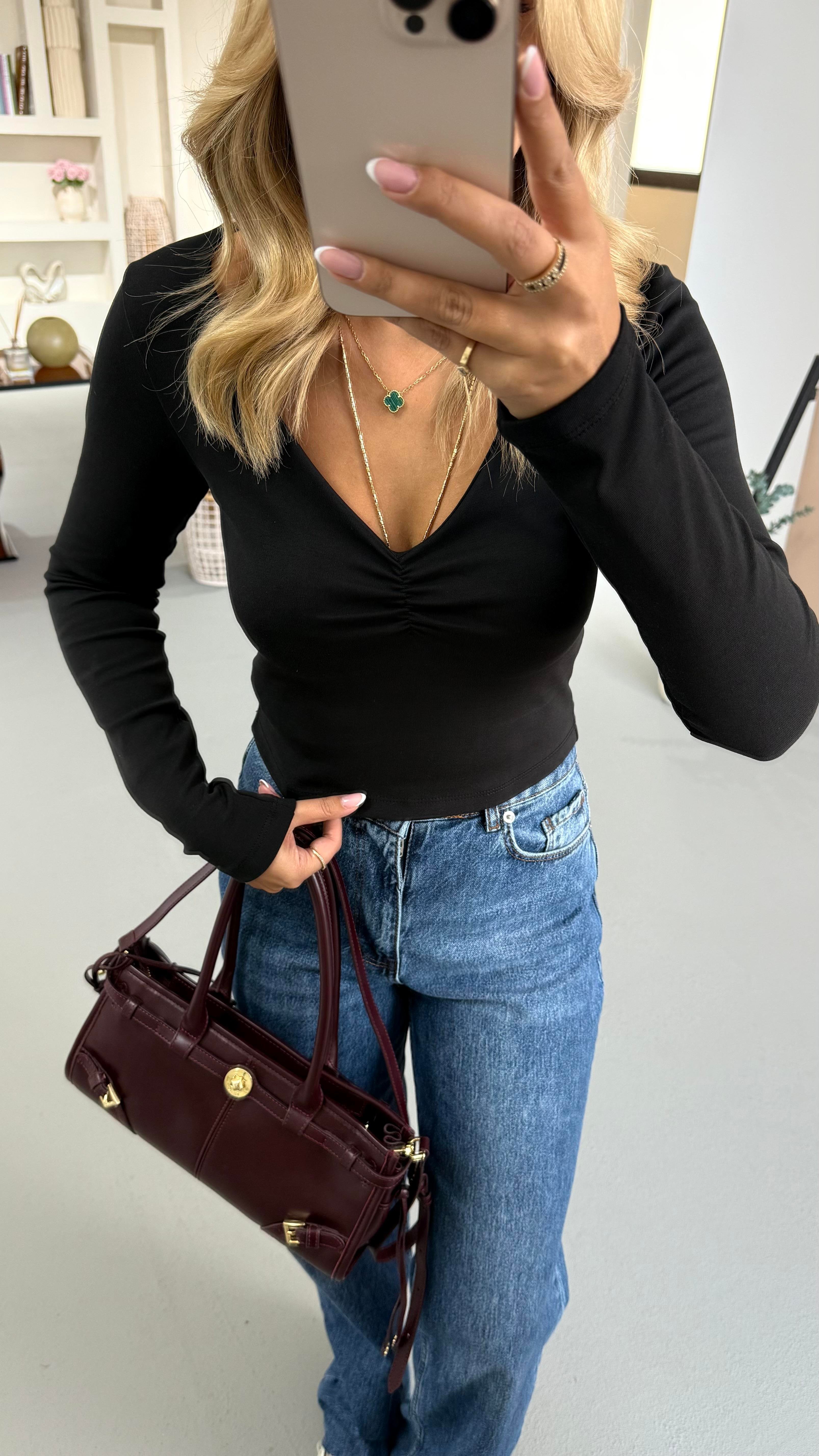 Drape Detay V Yaka Siyah Bluz (BLZ-0214-SYH)
