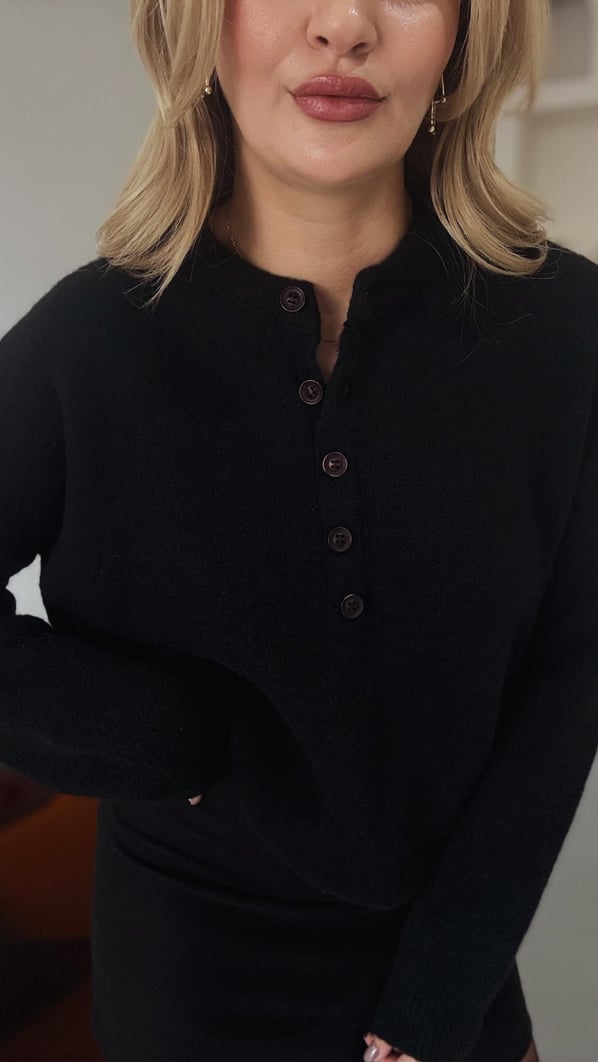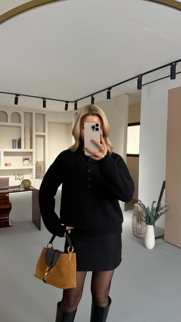 Düğme Detay Yumuşak Dokulu Siyah Kazak (KZK-0130-SYH)