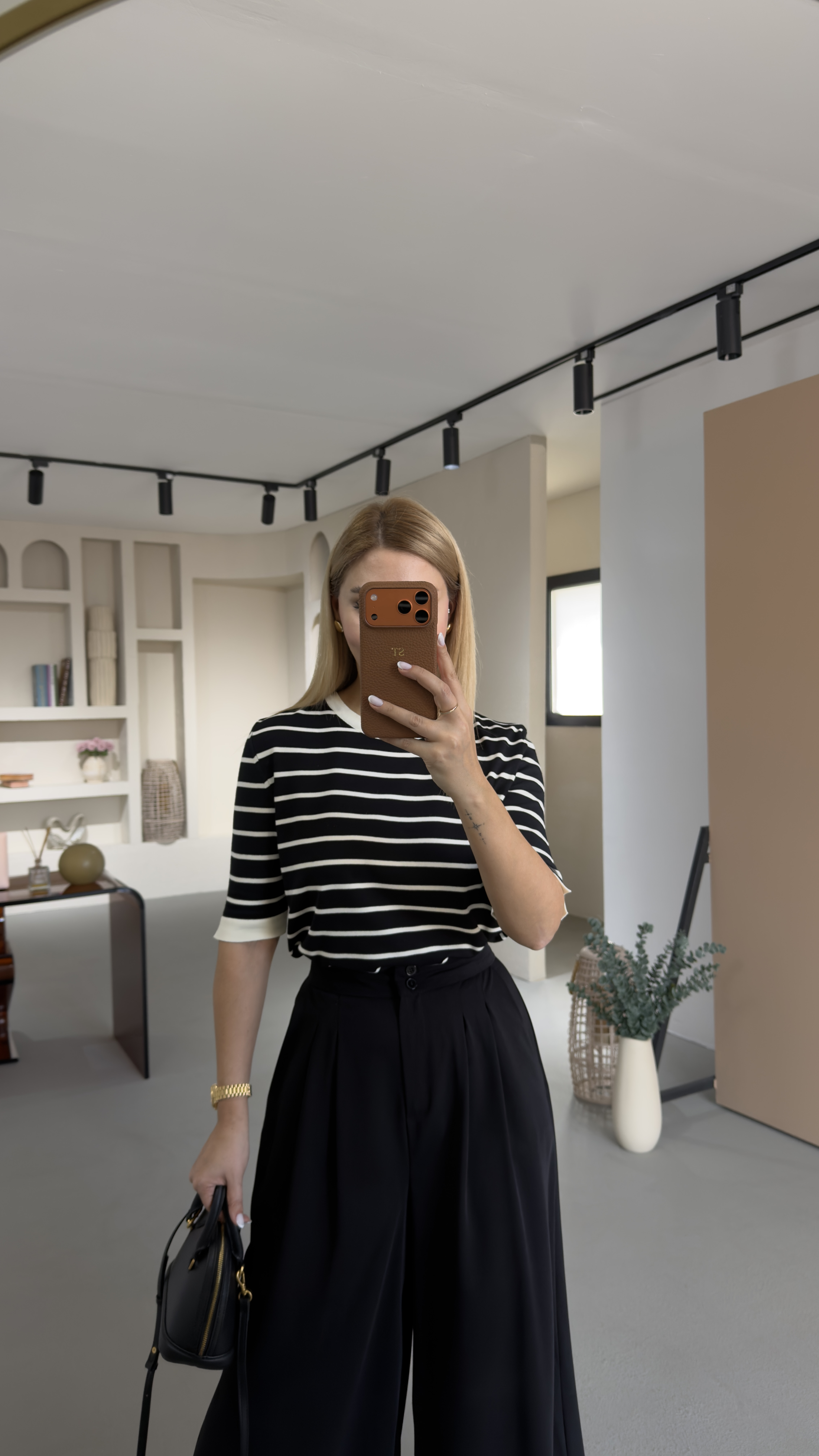 Ekru Çizgili Siyah Kısa Kol Triko