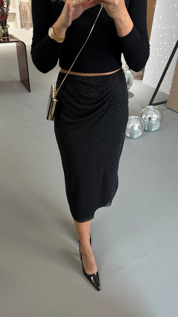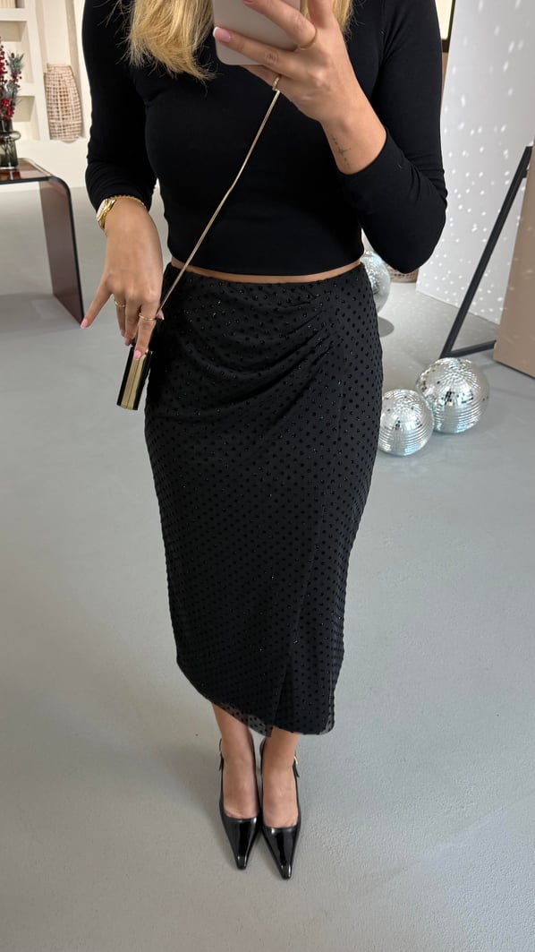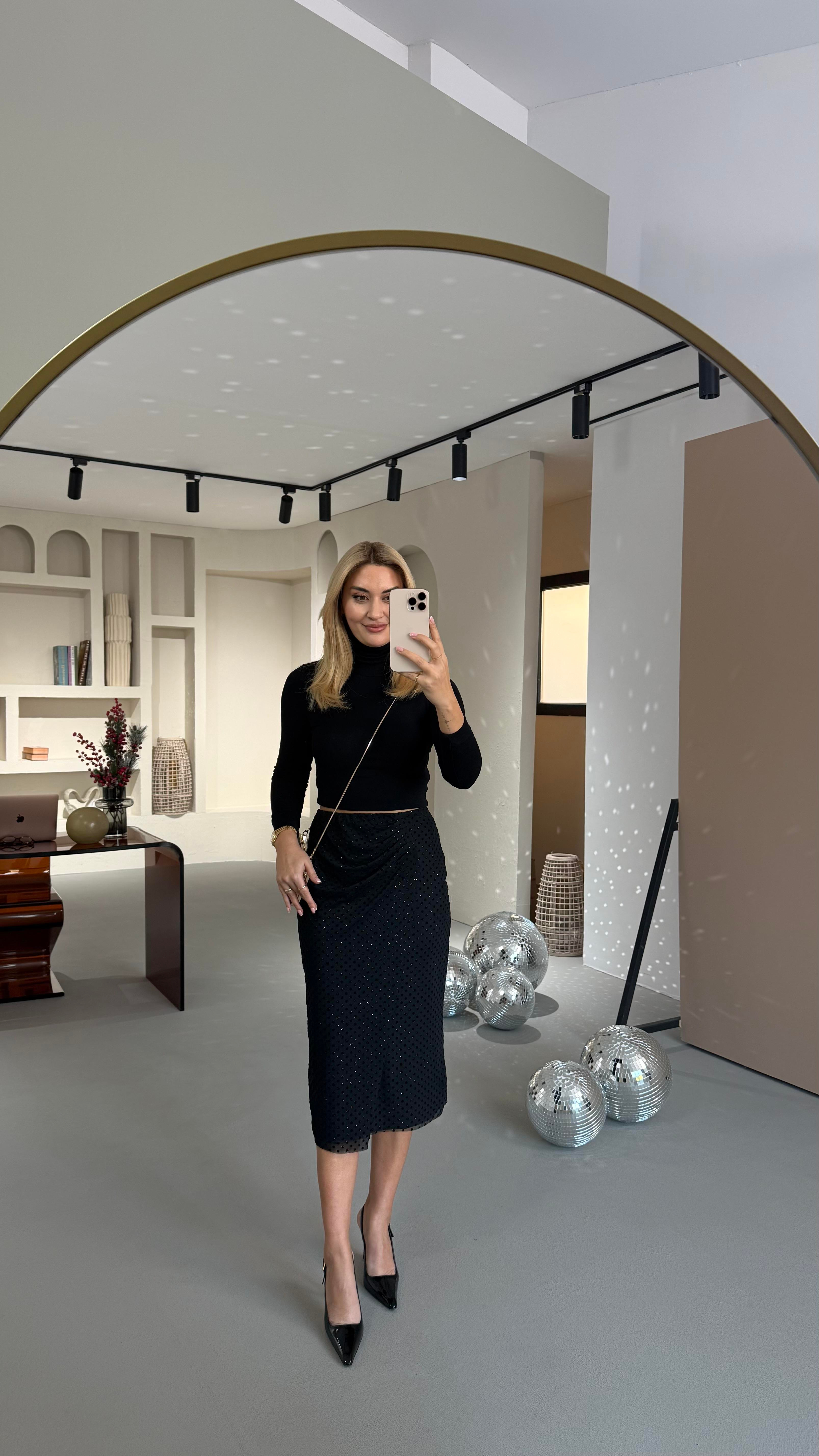 Bel Drapeli Simli Puantiye Detay Siyah Tül Etek