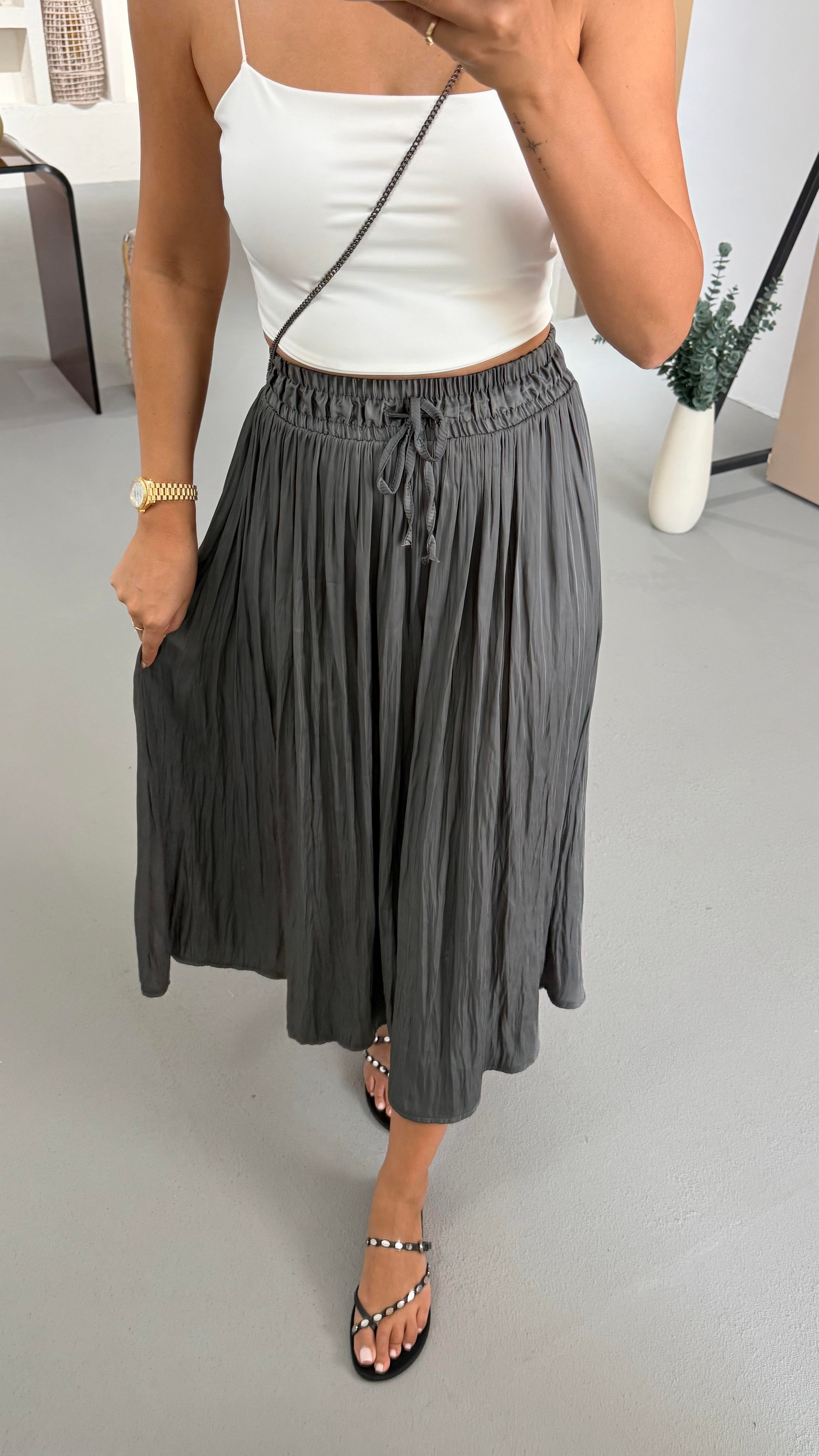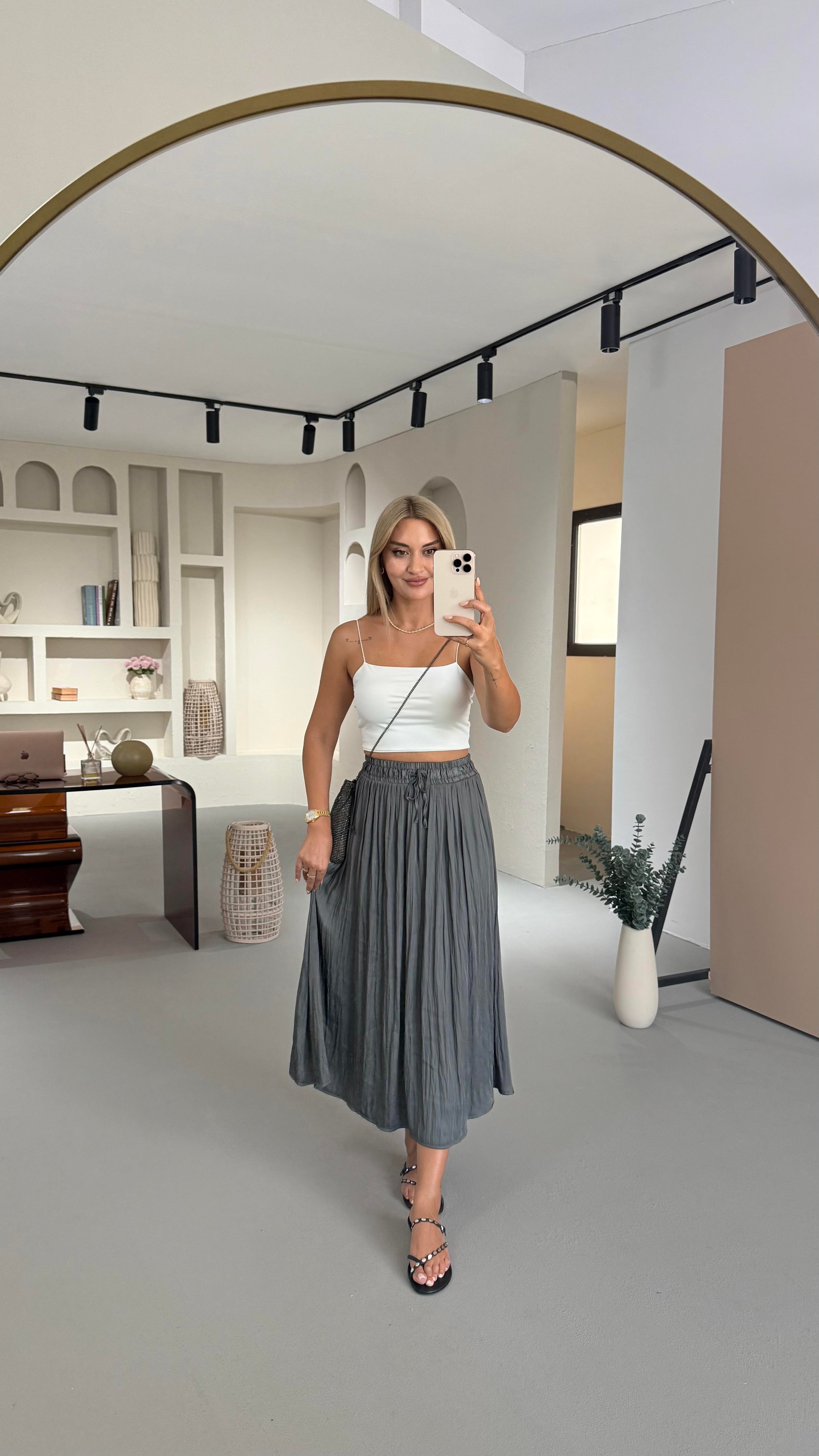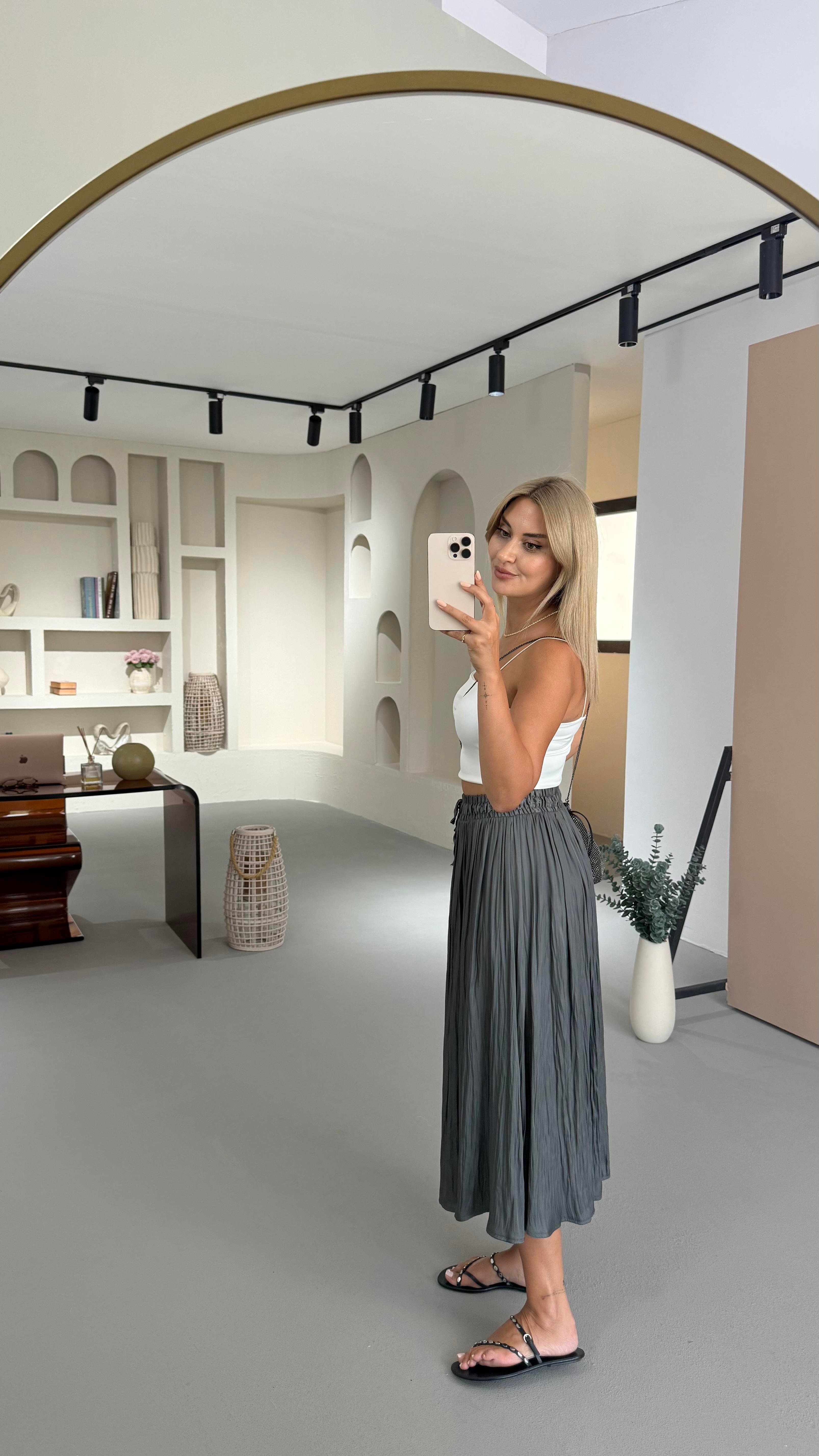 Bel Lastikli Kırışık Doku Saten Midi Füme Etek