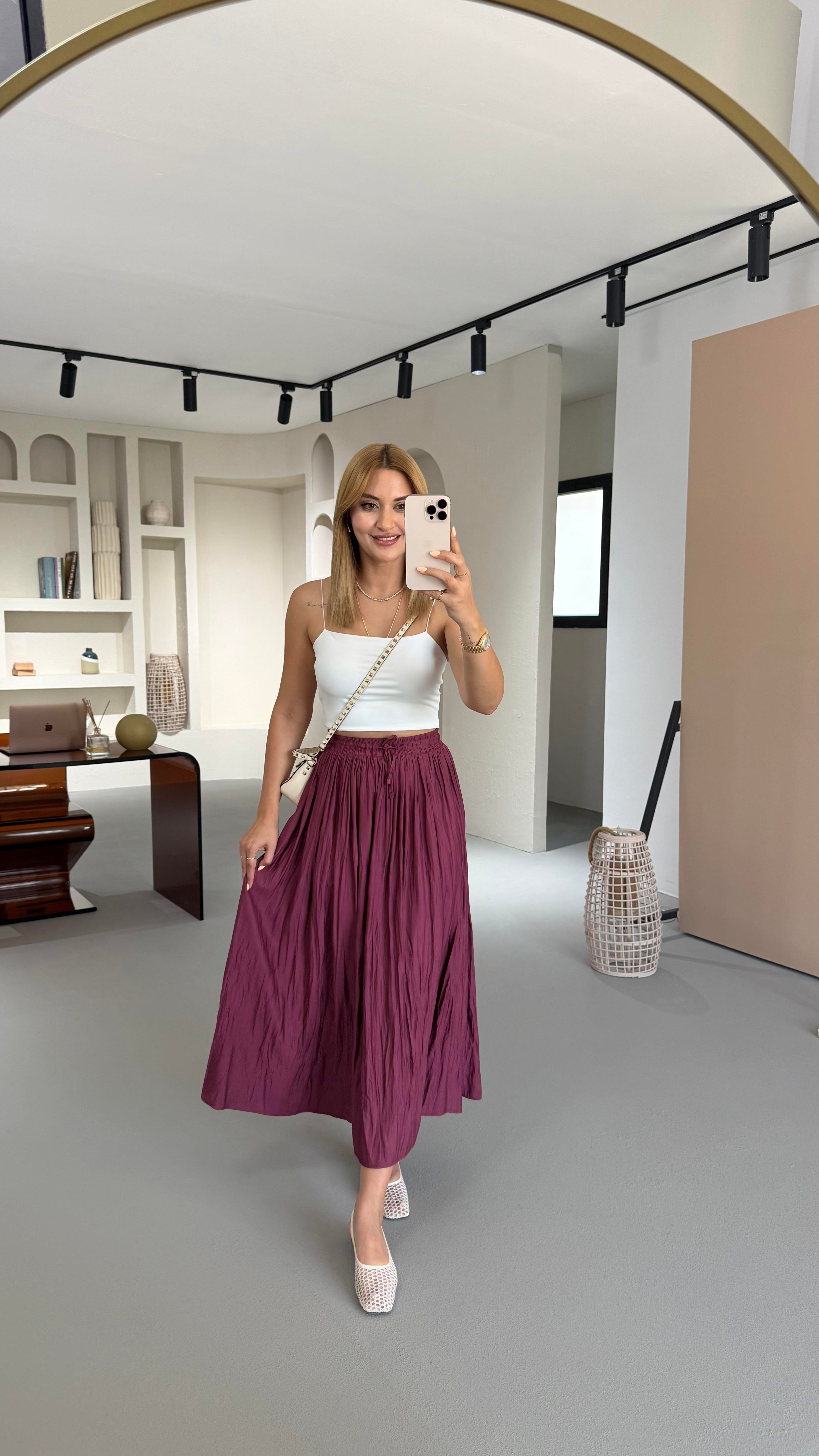 Bel Lastikli Kırışık Doku Saten Midi Mürdüm Etek (ETK-0229-MRD)