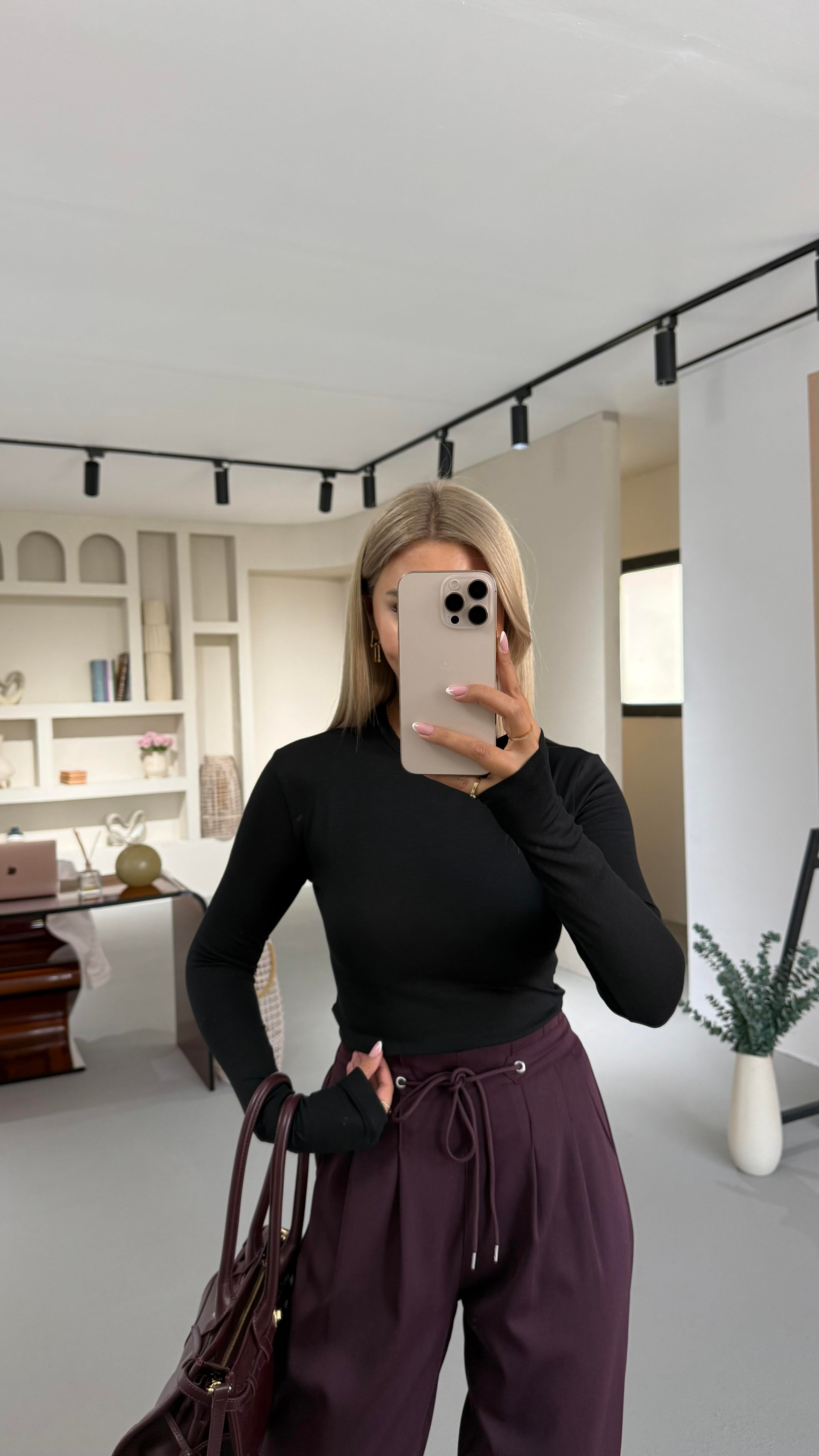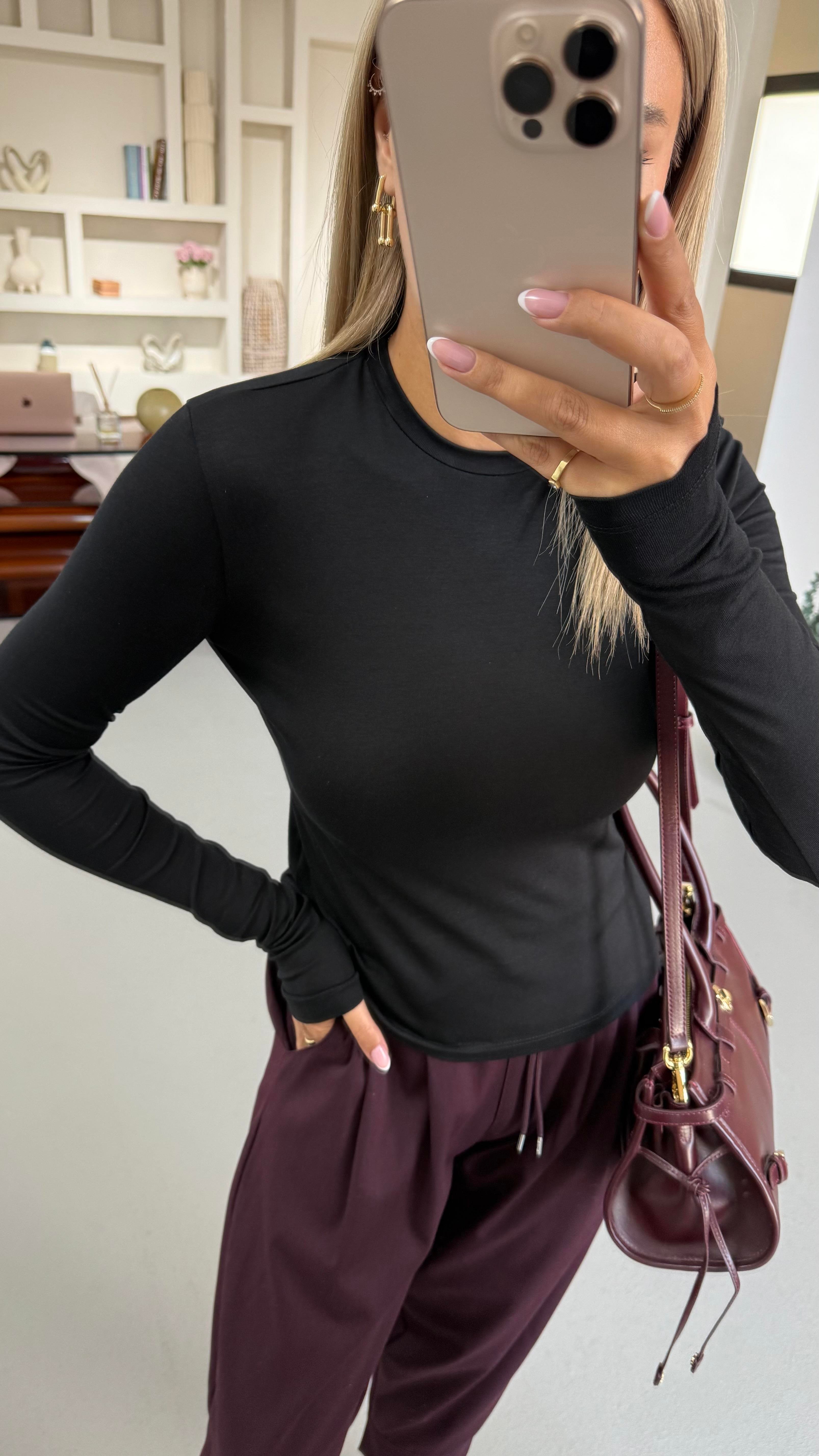 Bisiklet Yaka Uzun Kol Siyah Basic Tshirt
