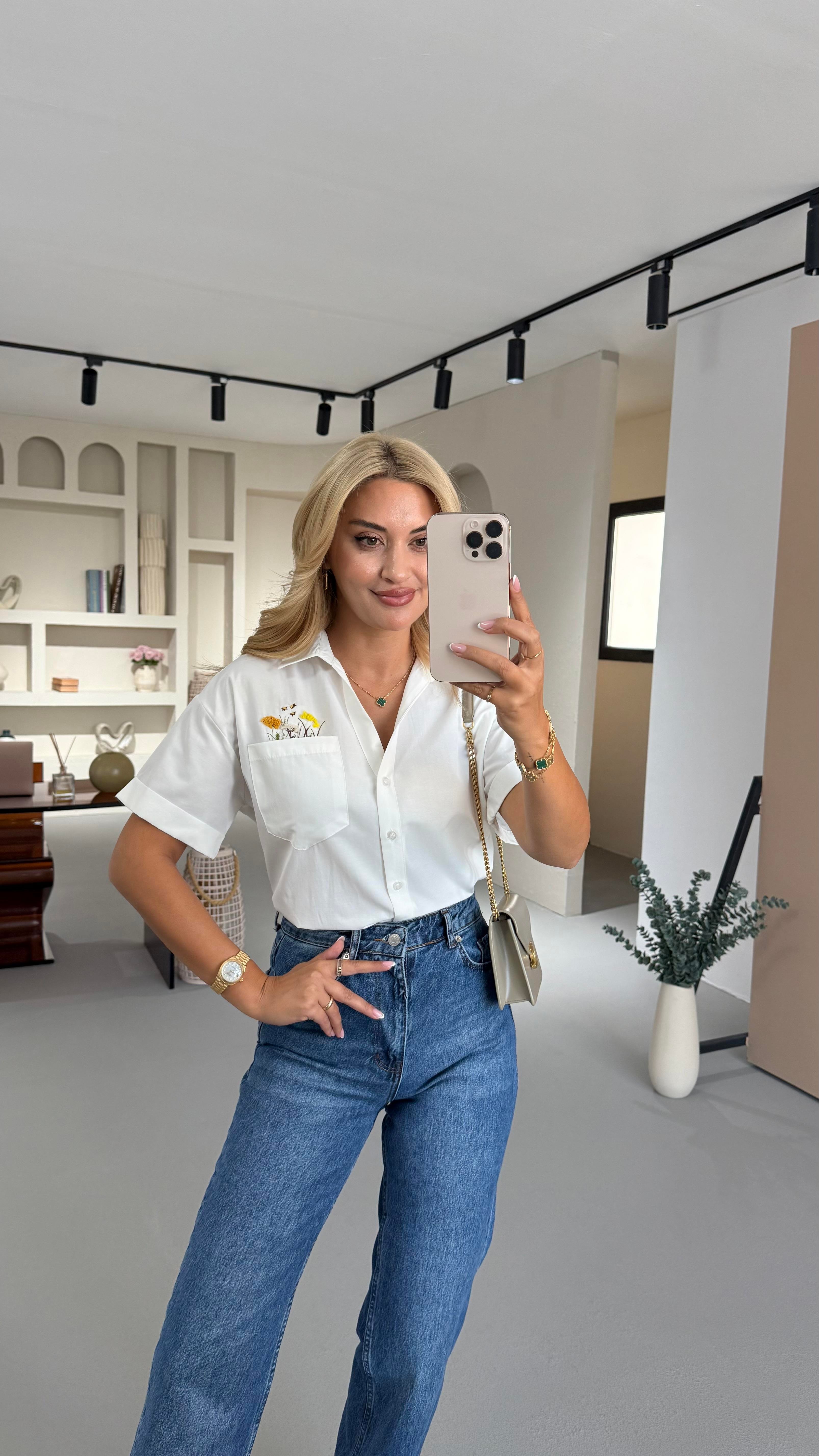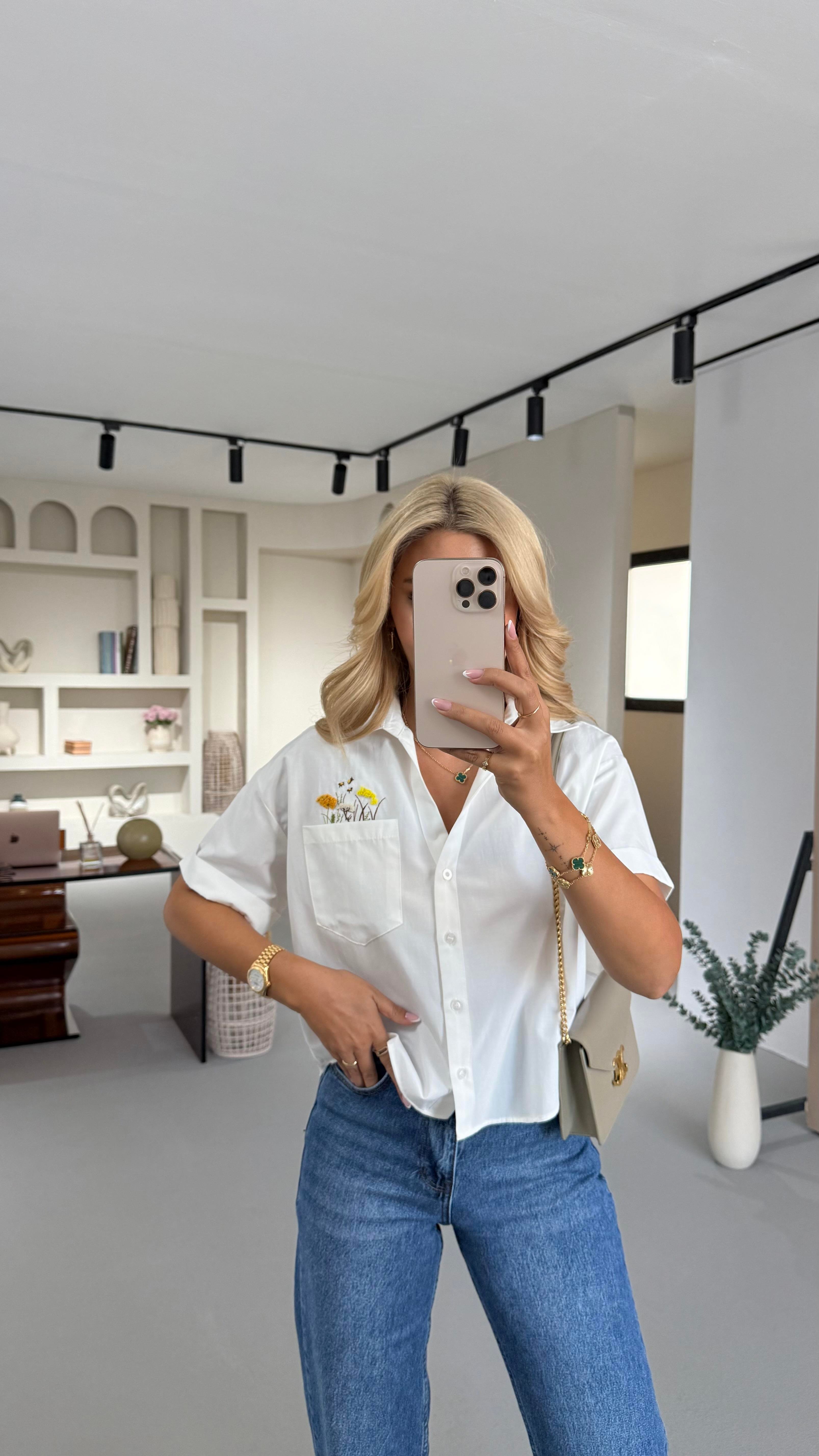 Çiçek Nakış Detay Beyaz Kısa Kol Poplin Gömlek