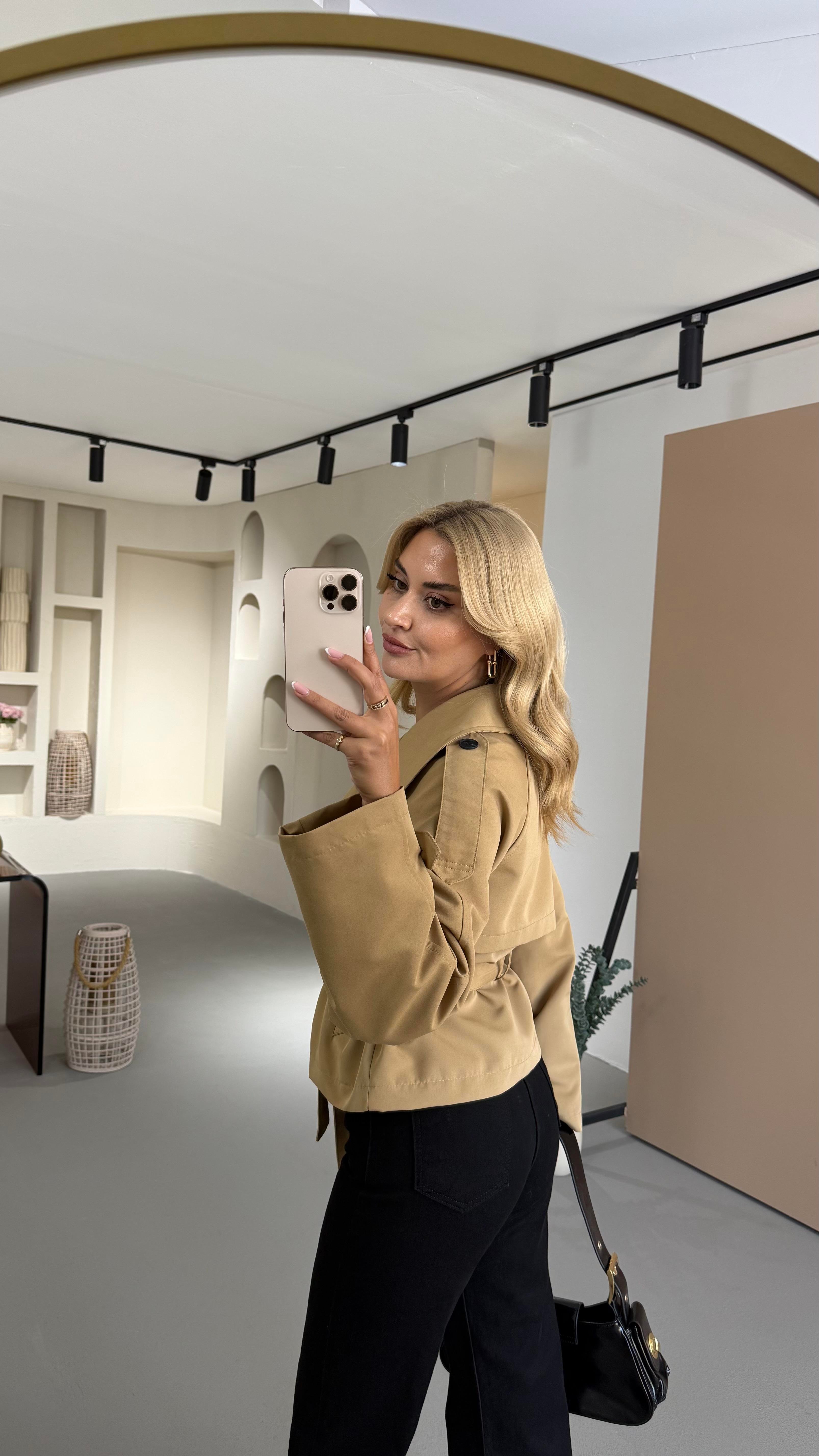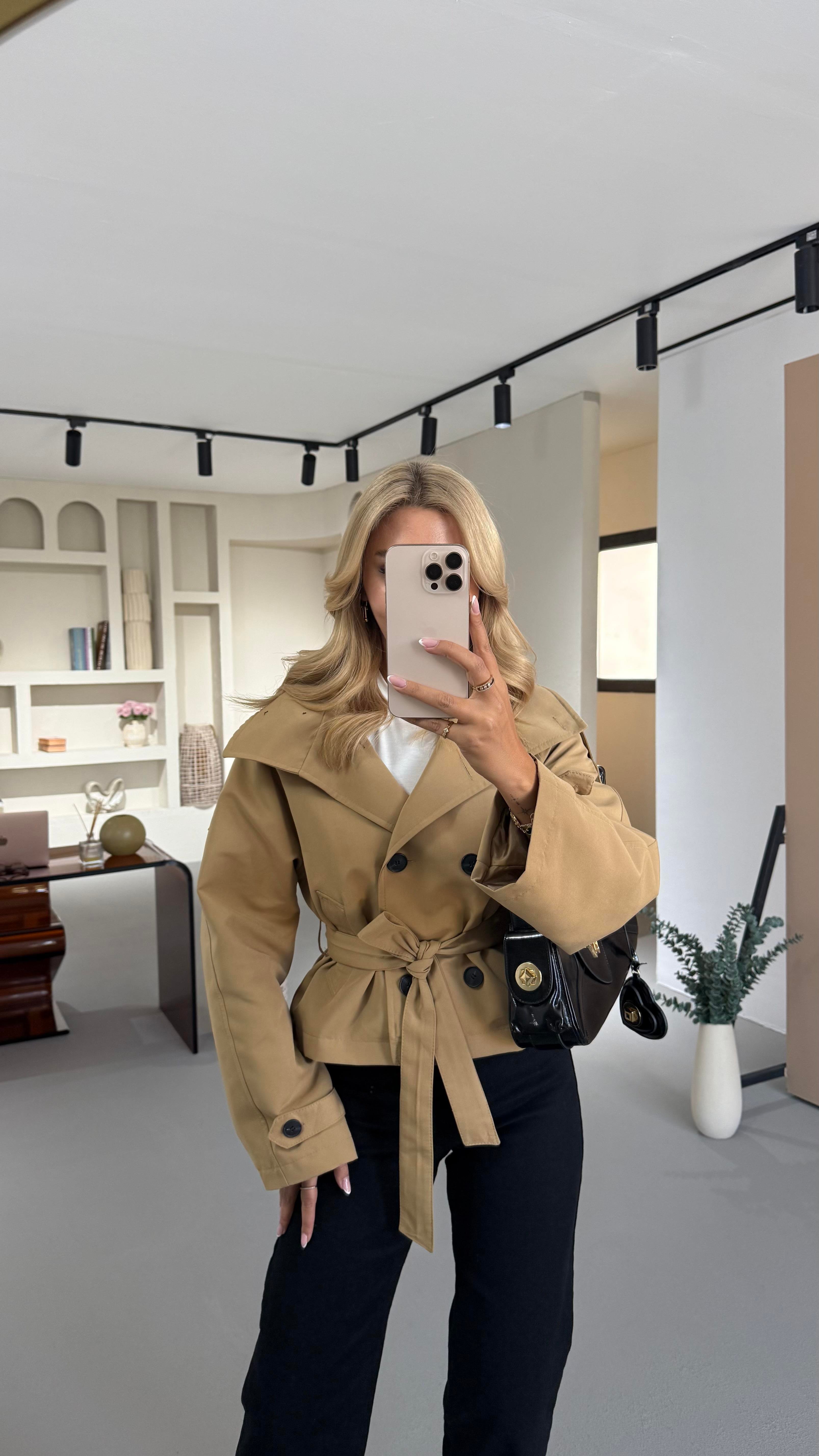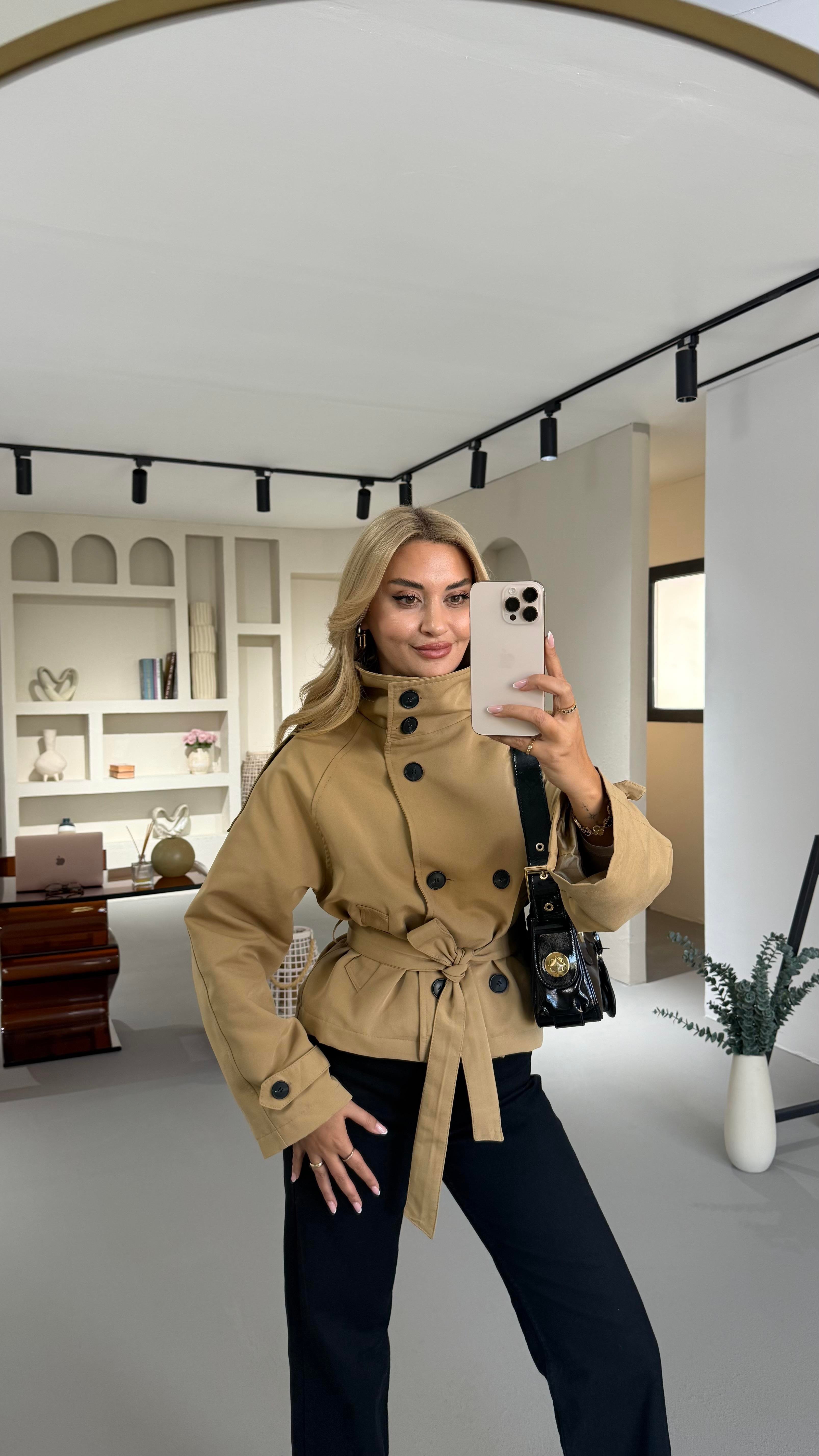 Dik Yaka Apoletli Camel Kısa Trenç (TRNÇ-0010-CML)