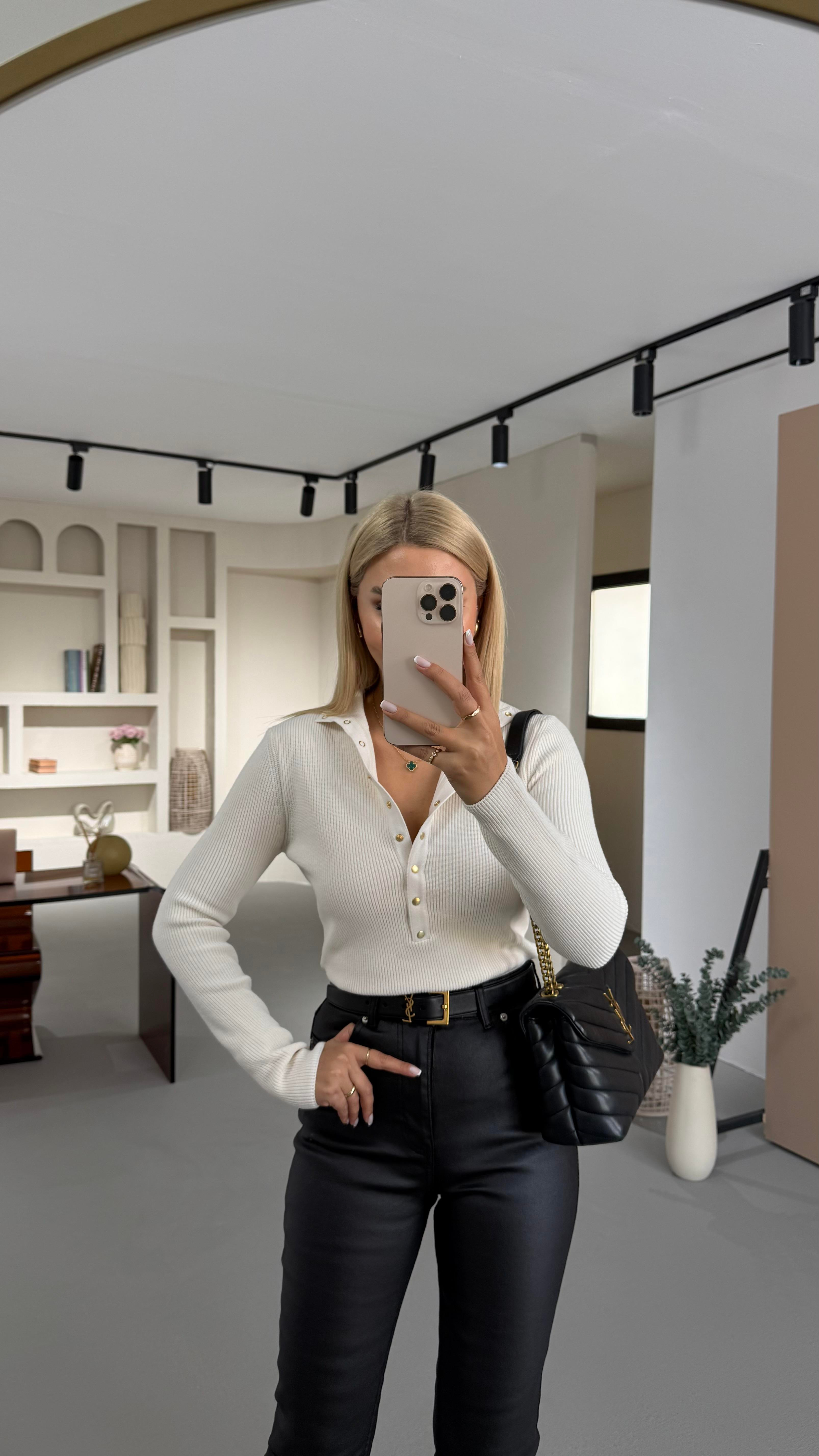 Dik Yaka Pat Düğmeli Ekru Çelik Triko