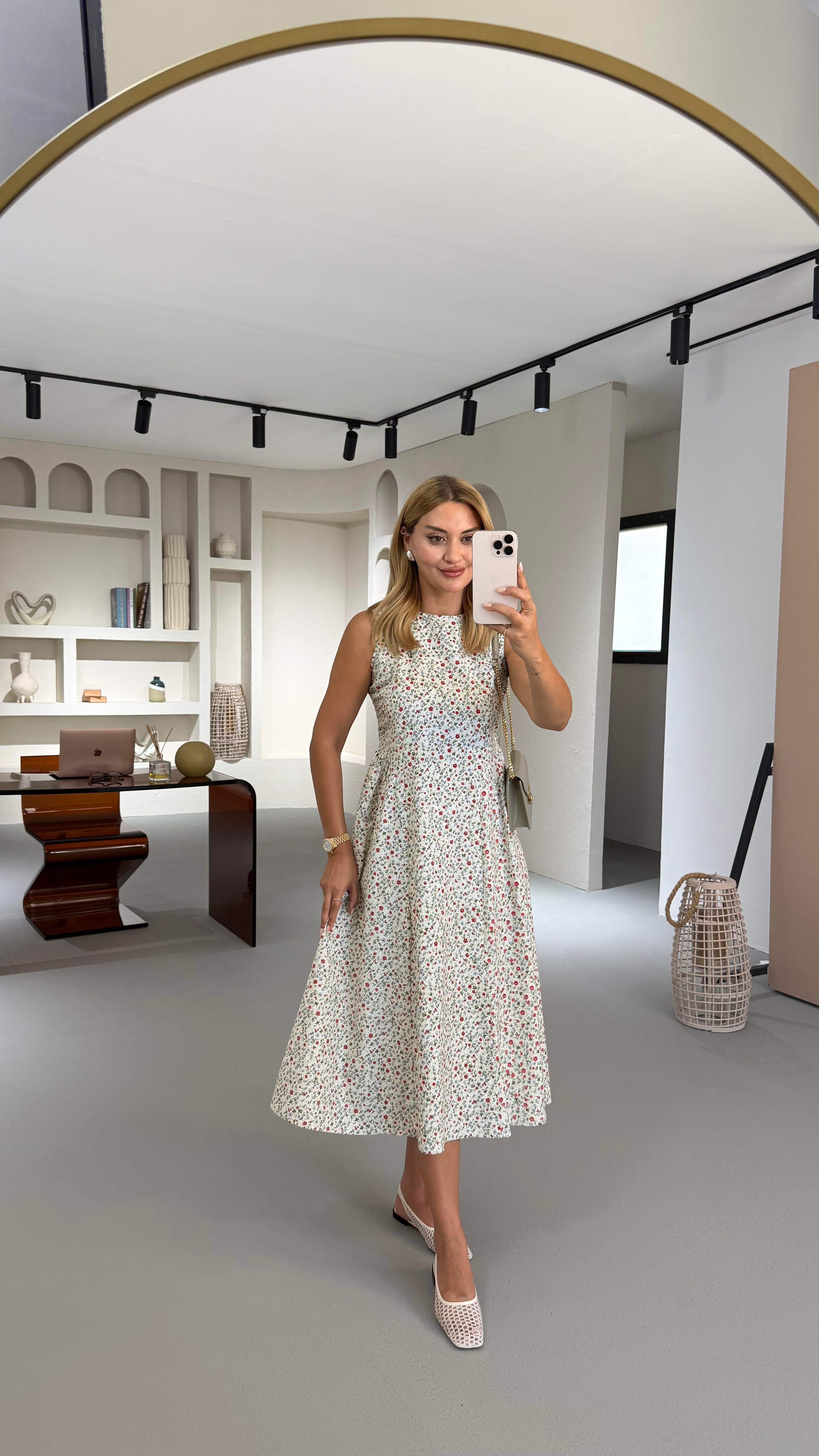 Drape Detay Çıtır Desen Ekru Poplin Elbise (ELB-0717-EKR)