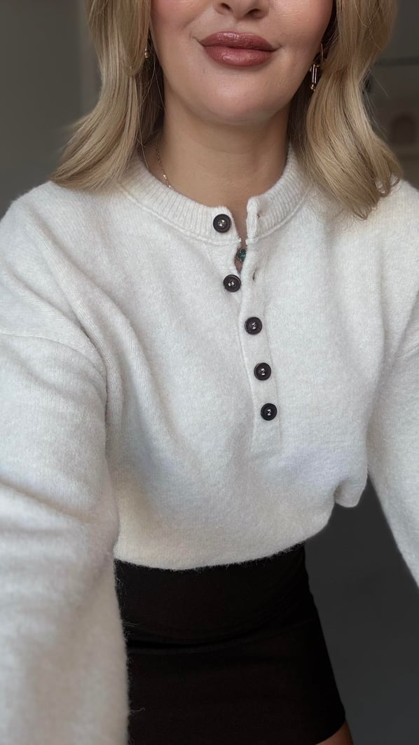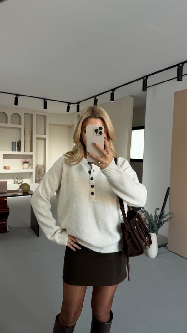 Düğme Detay Yumuşak Dokulu Ekru Kazak