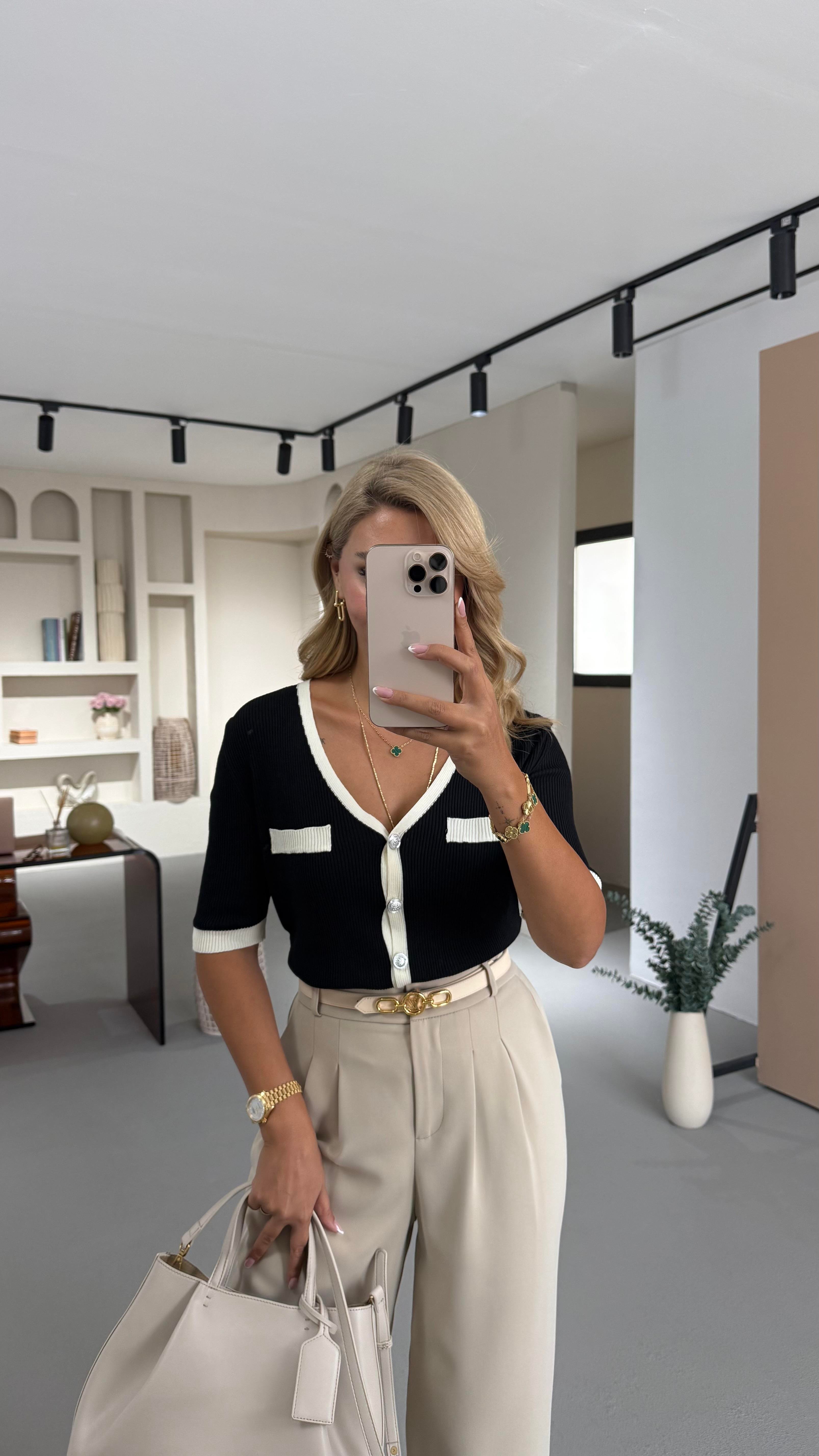Ekru Biyeli Düğme Detay Siyah Triko (TRK-0157-SYH)
