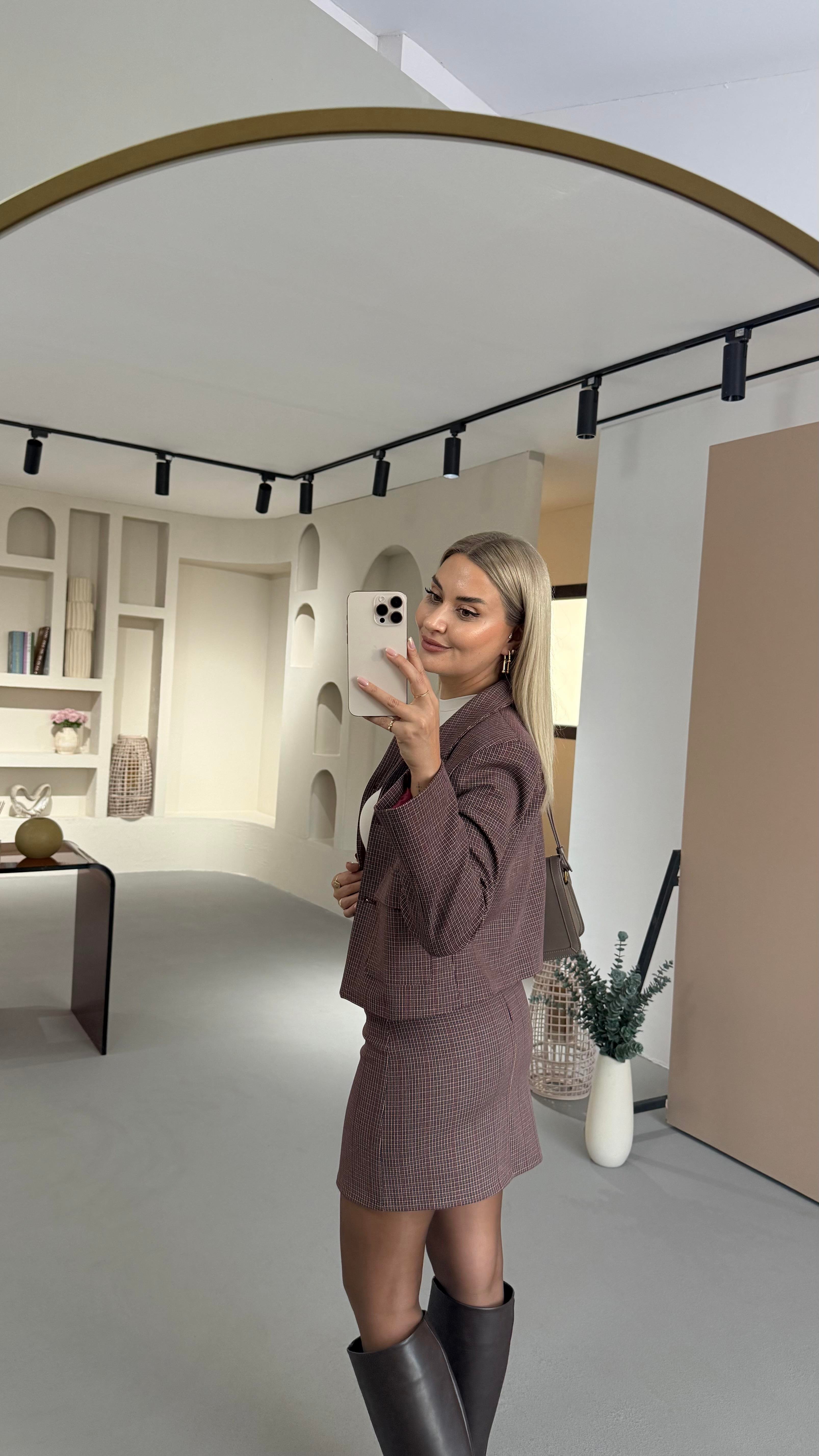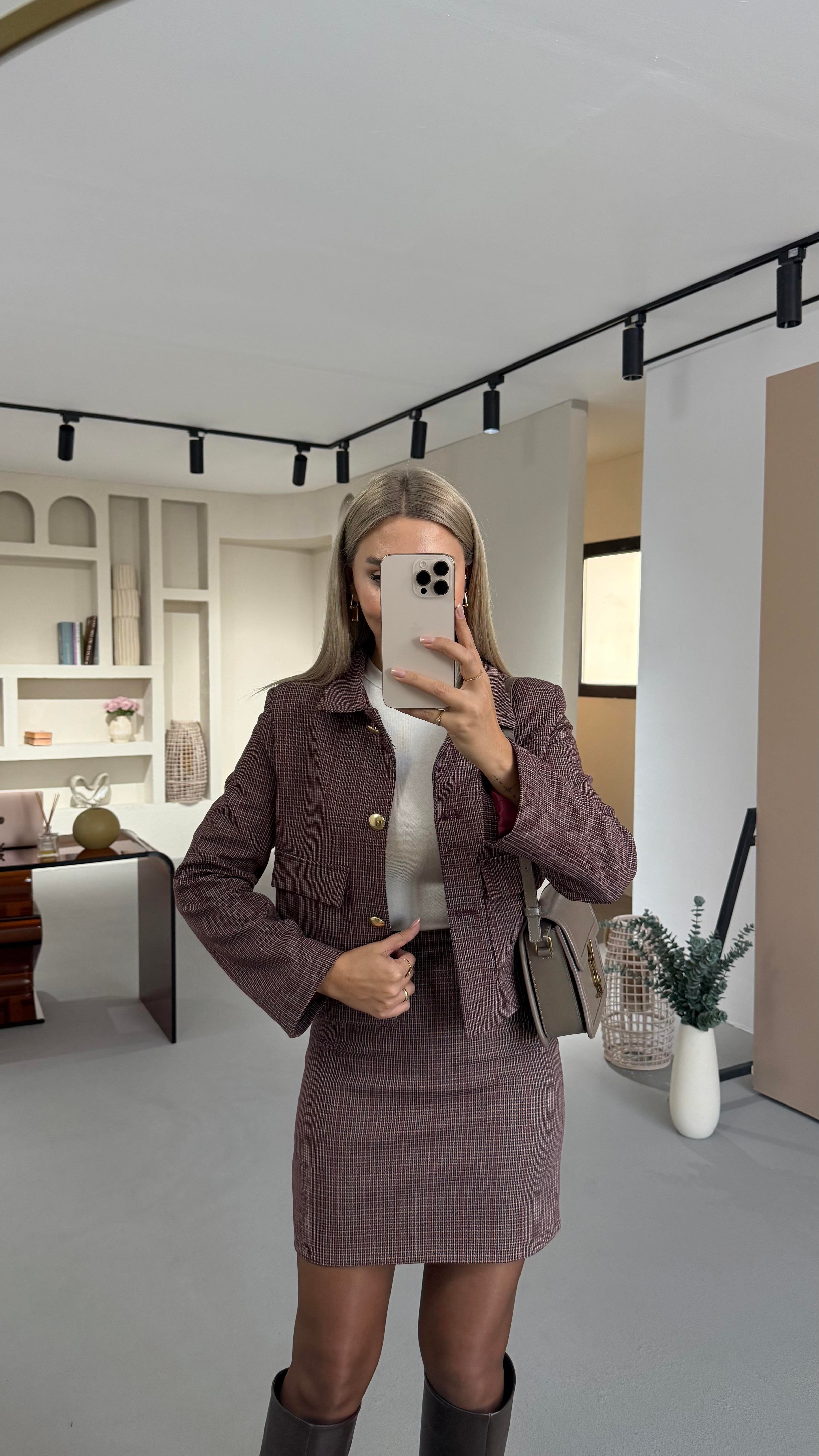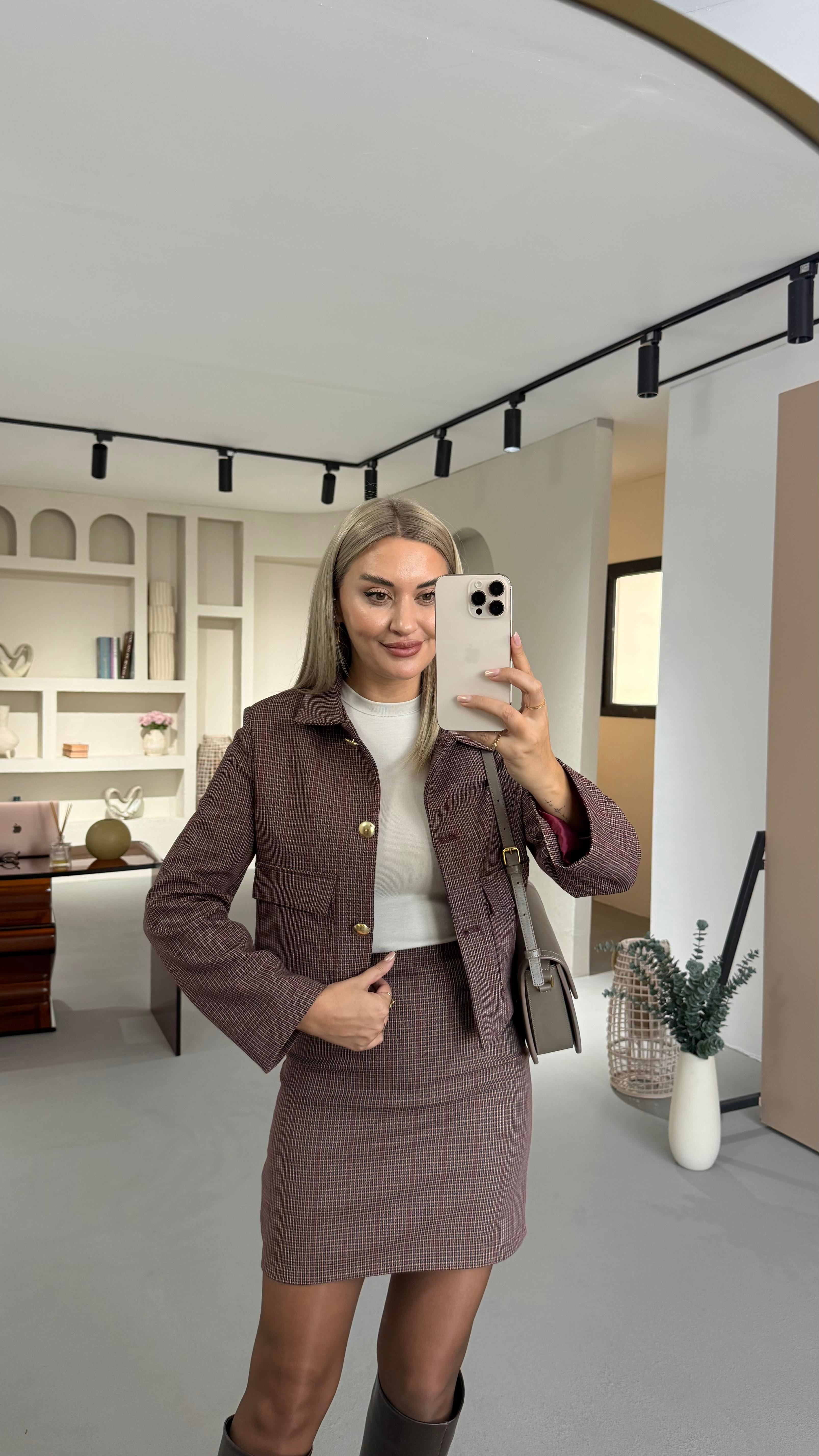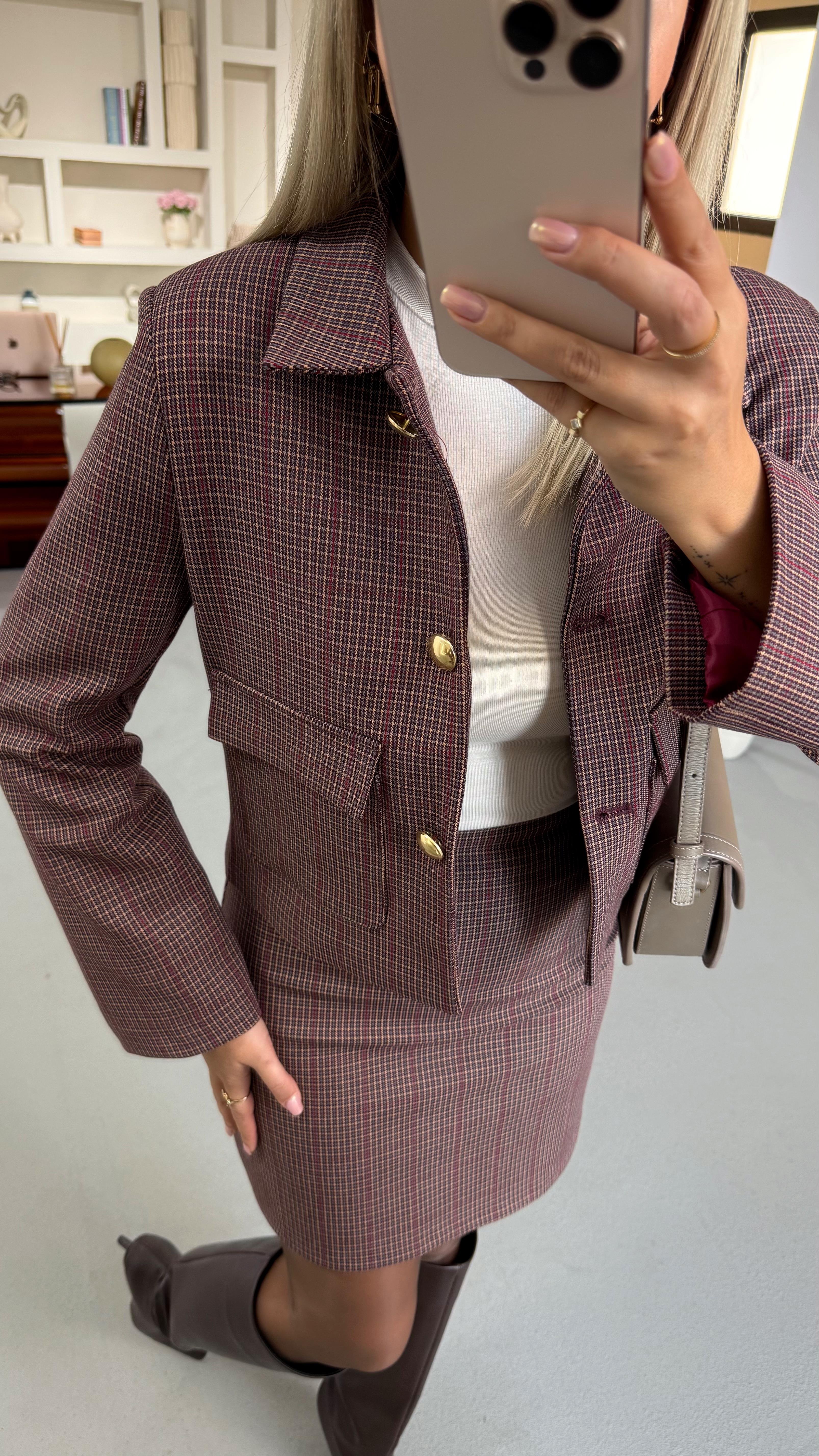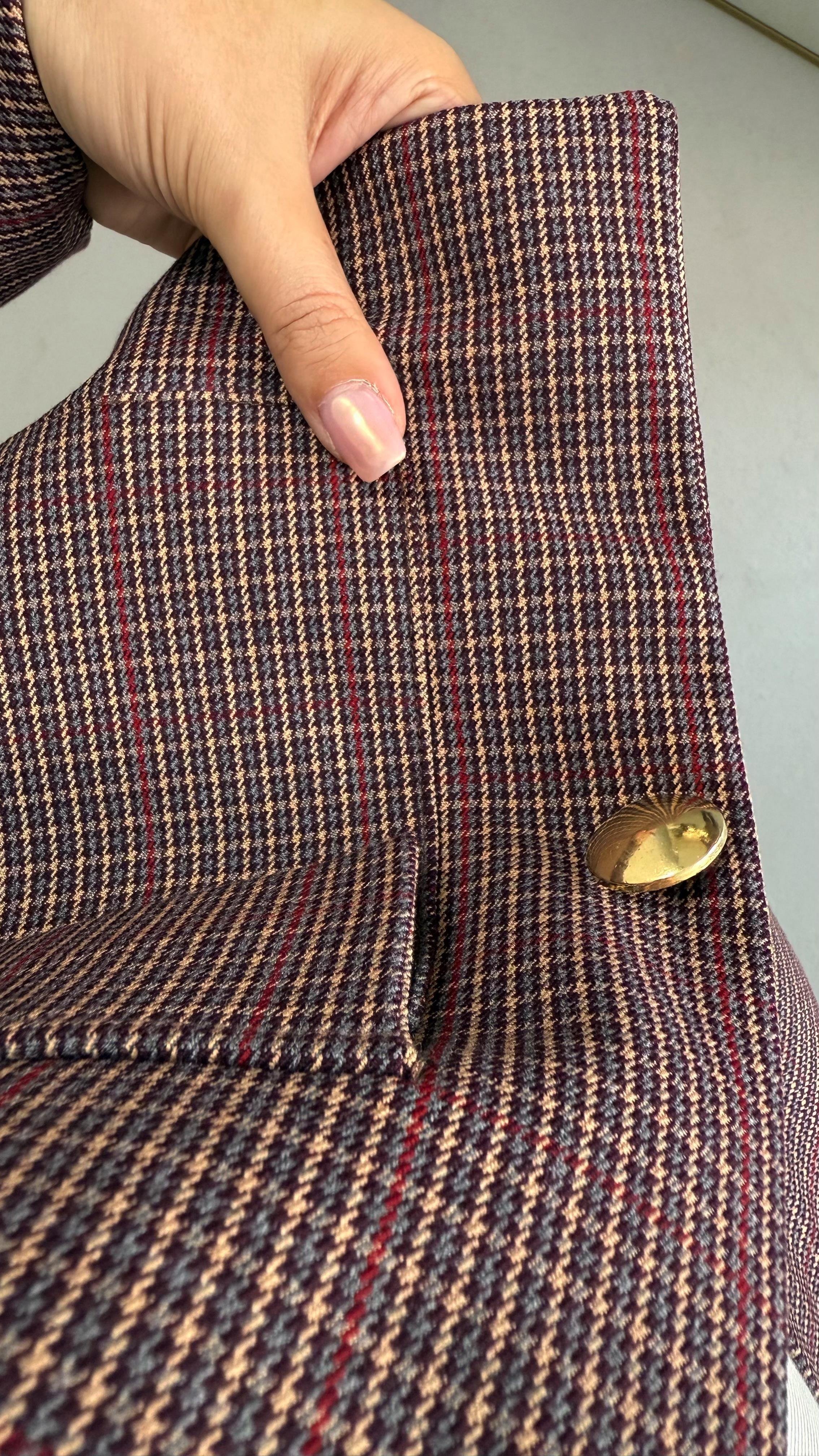 Gold Düğme Detay Bordo Kazayağı Desen Ceket