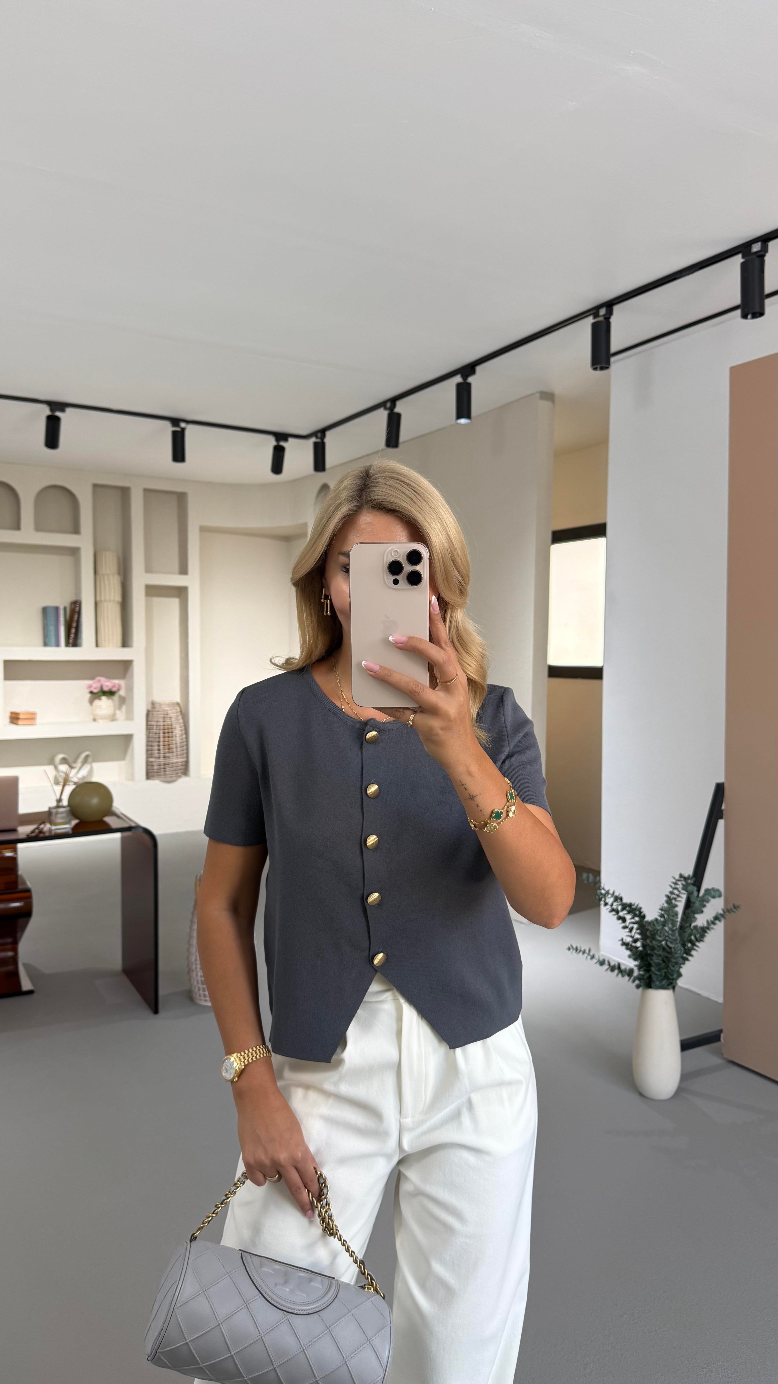 Gold Düğme Detay Kısa Kol Antrasit Triko Hırka (HRK-0076-ANT)