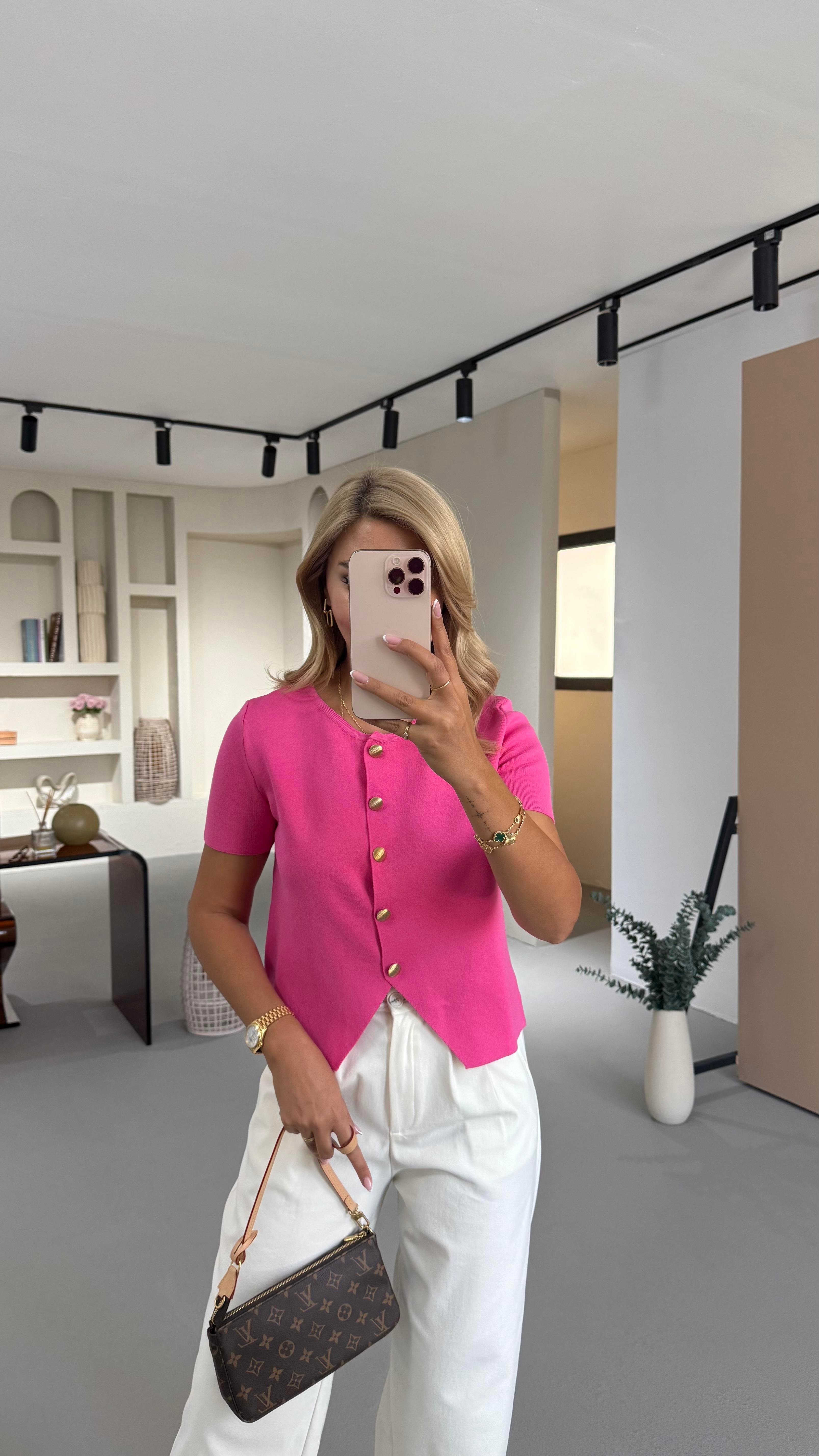 Gold Düğme Detay Kısa Kol Pembe Triko Hırka