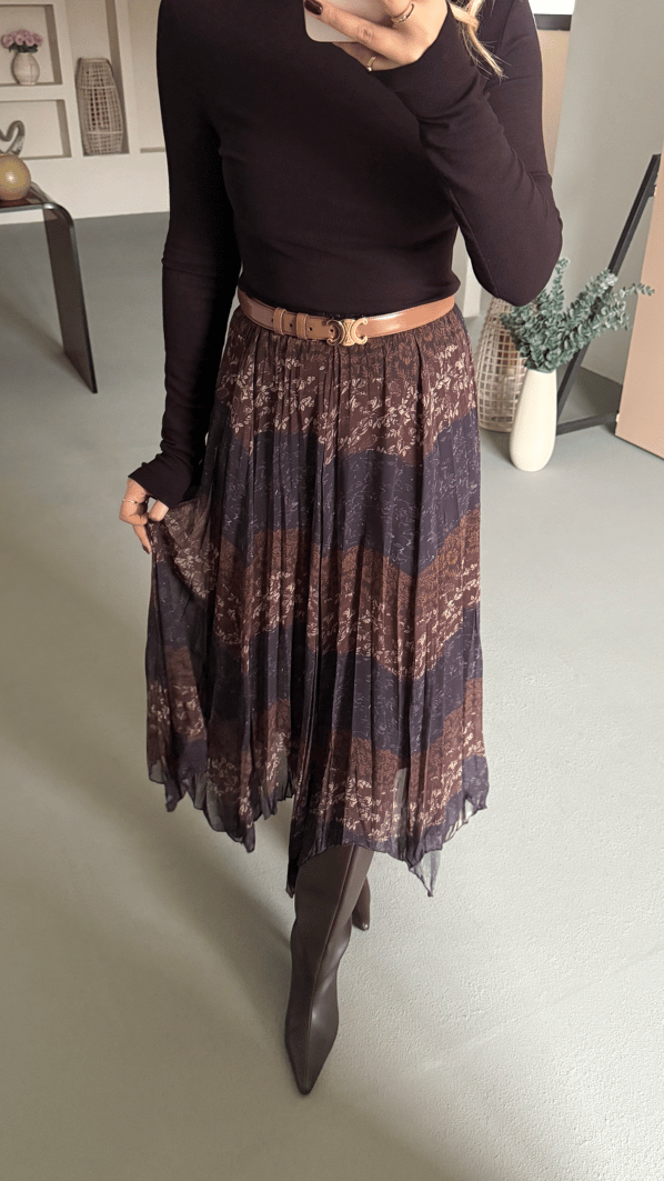 Kahve Lacivert Desen Beli Lastikli Asimetrik Şifon Etek (ETK-0281-KHV.LCV)