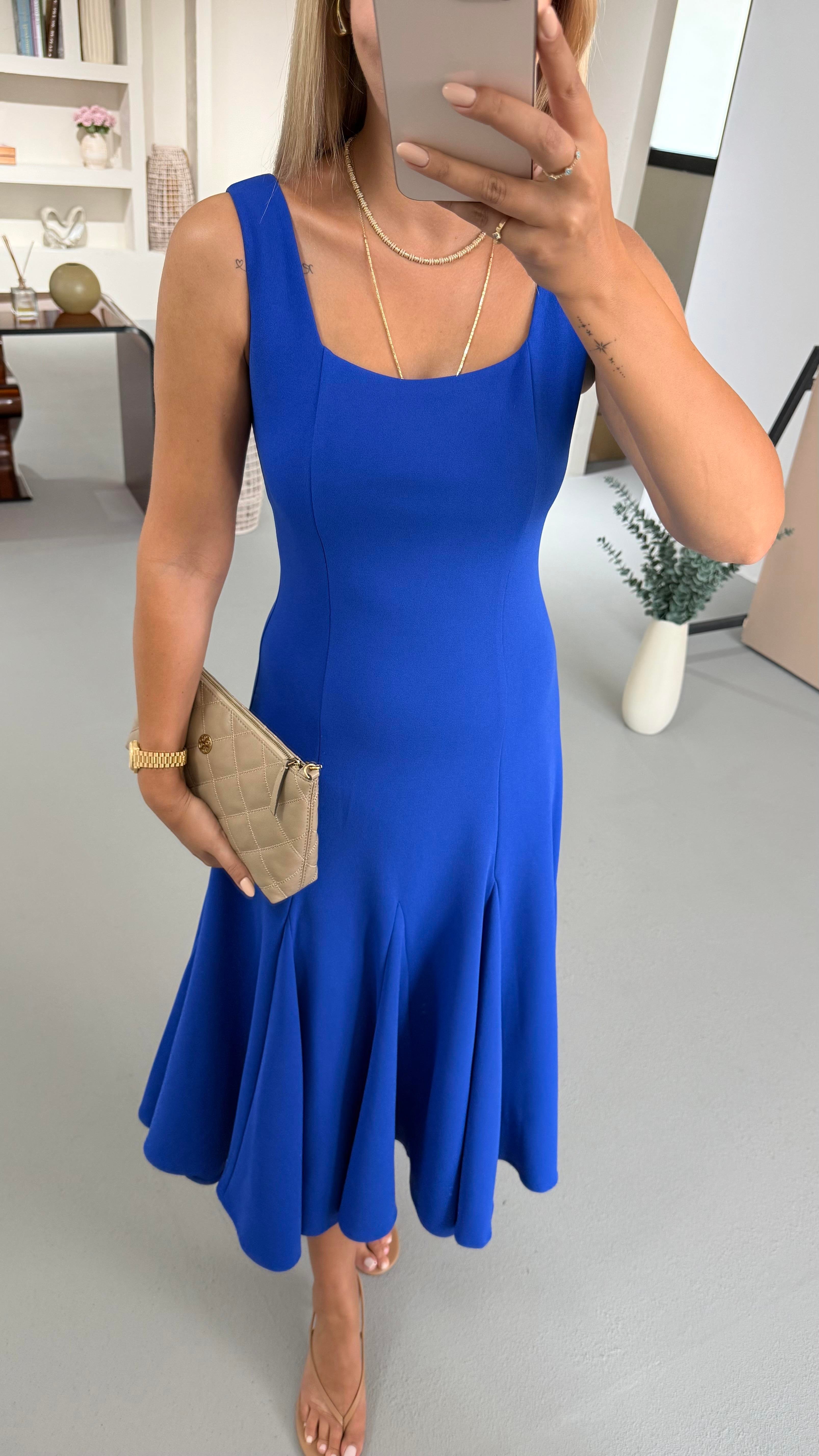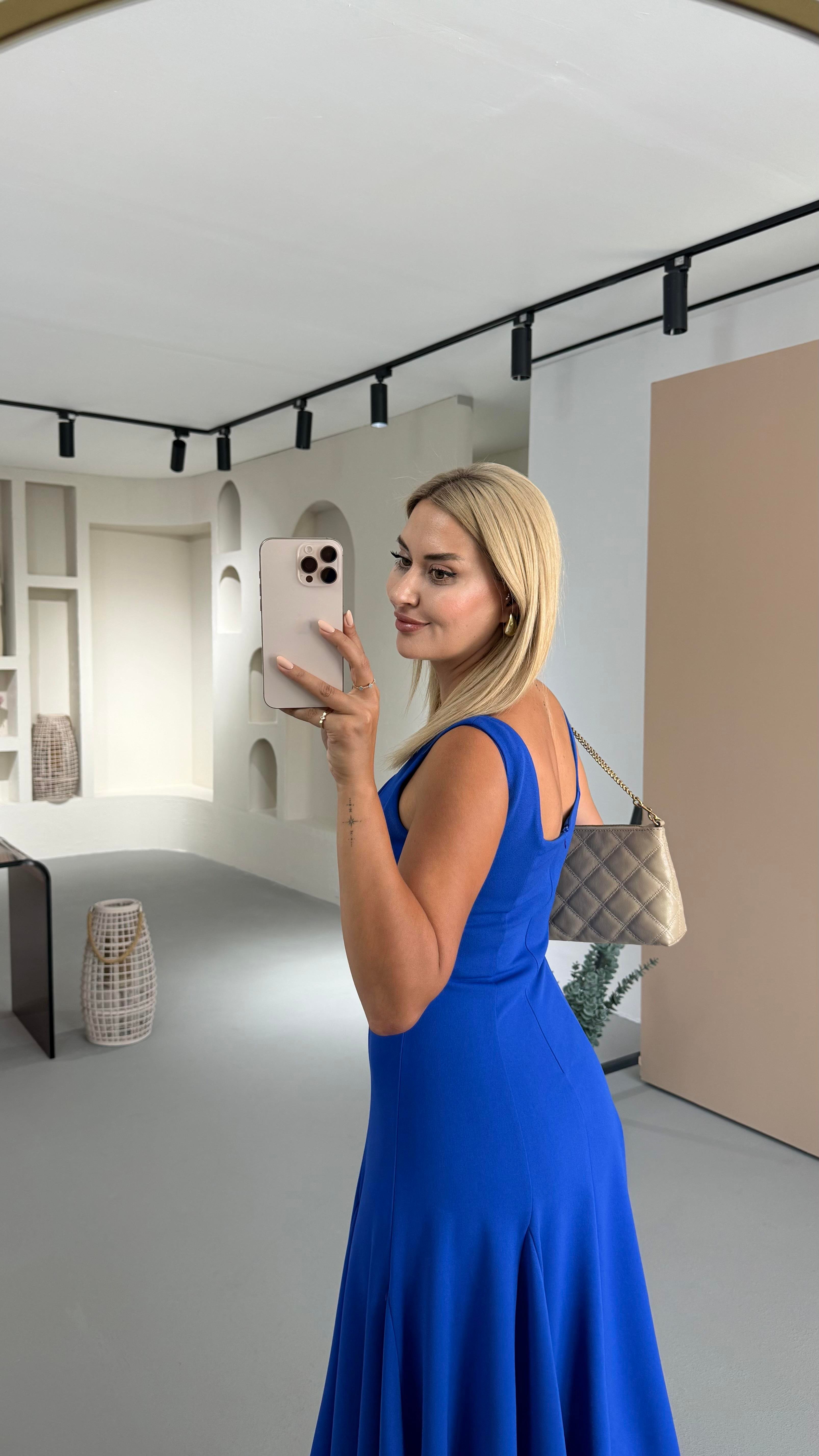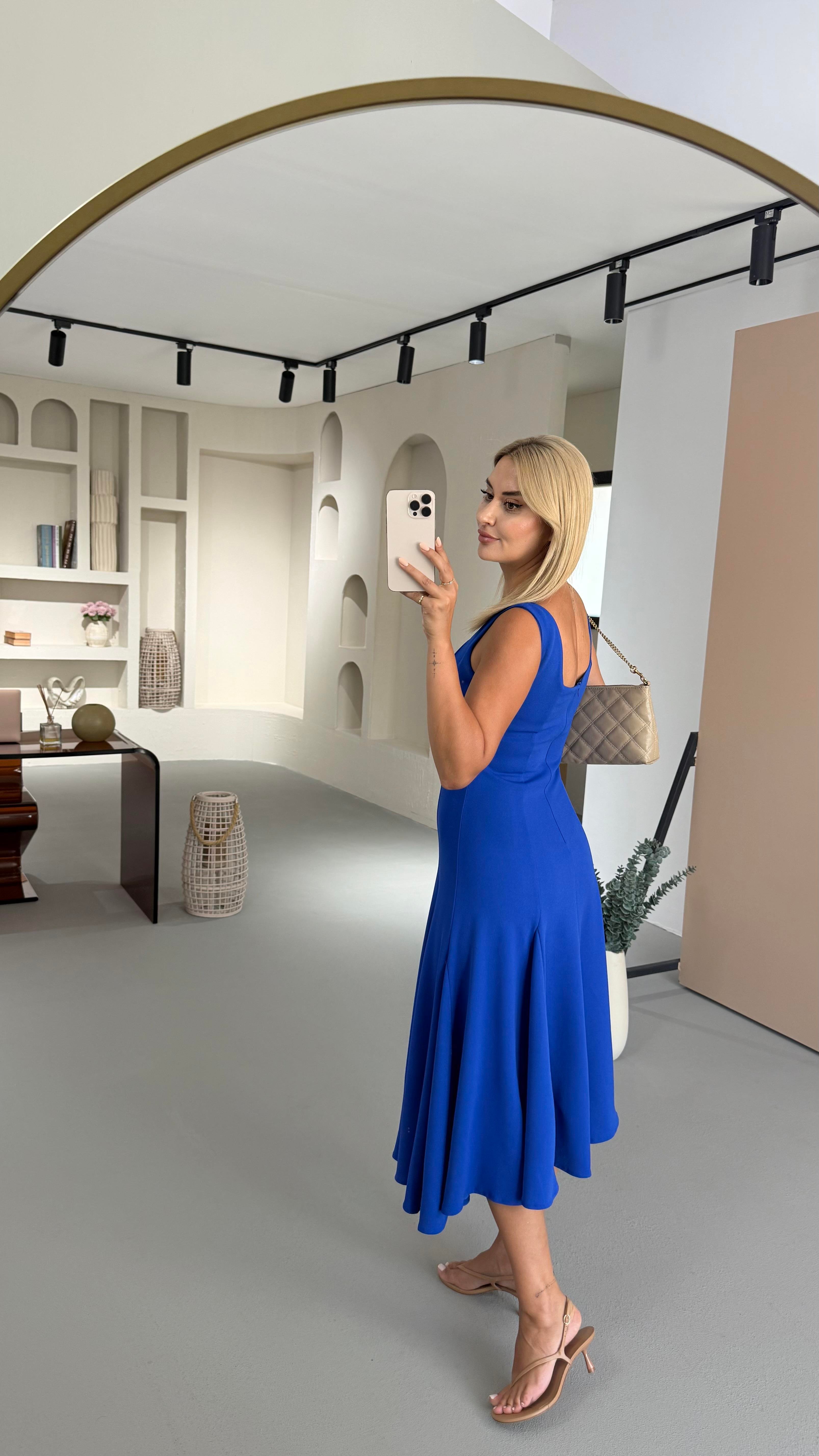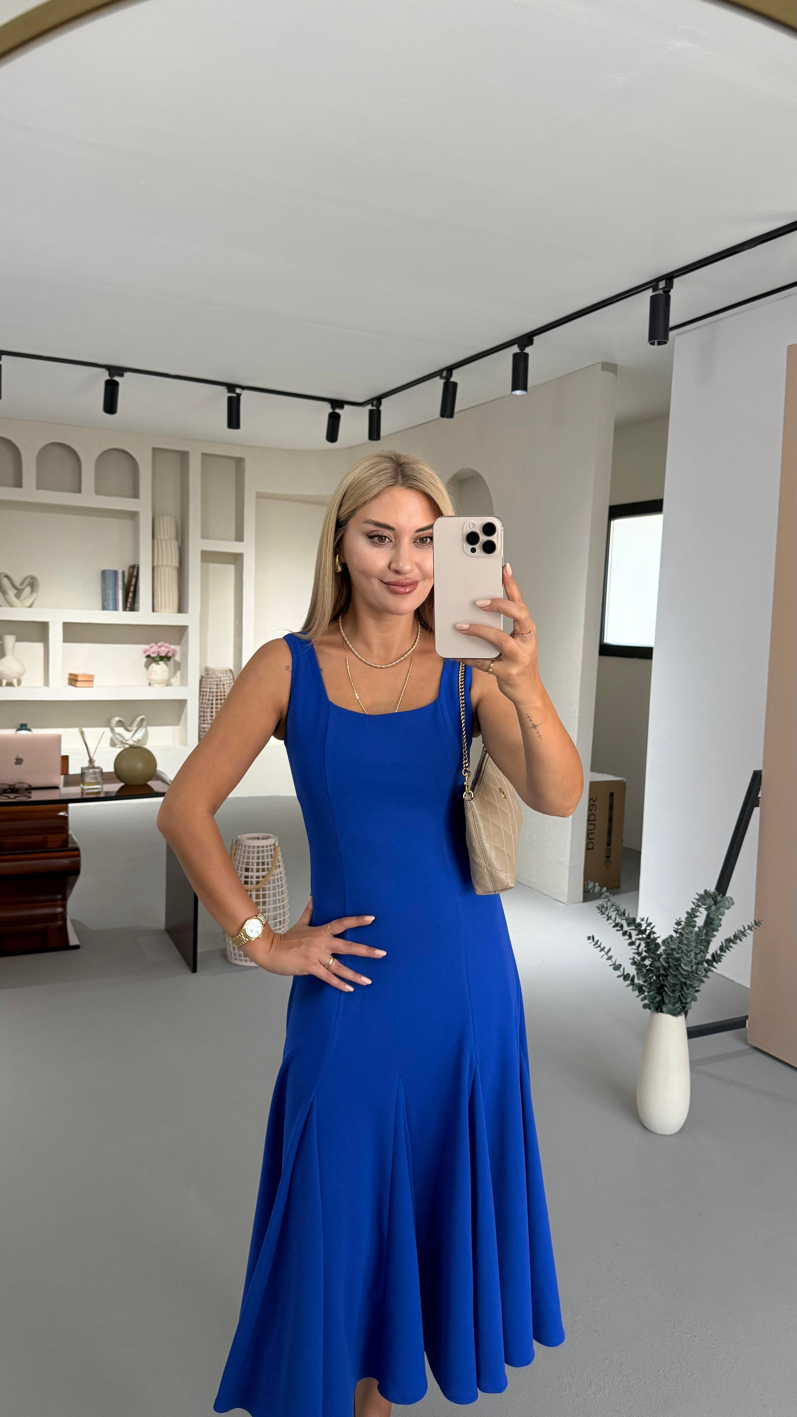 Kare Yaka Godeli Saks Çan Elbise (ELB-0734-SAKS)