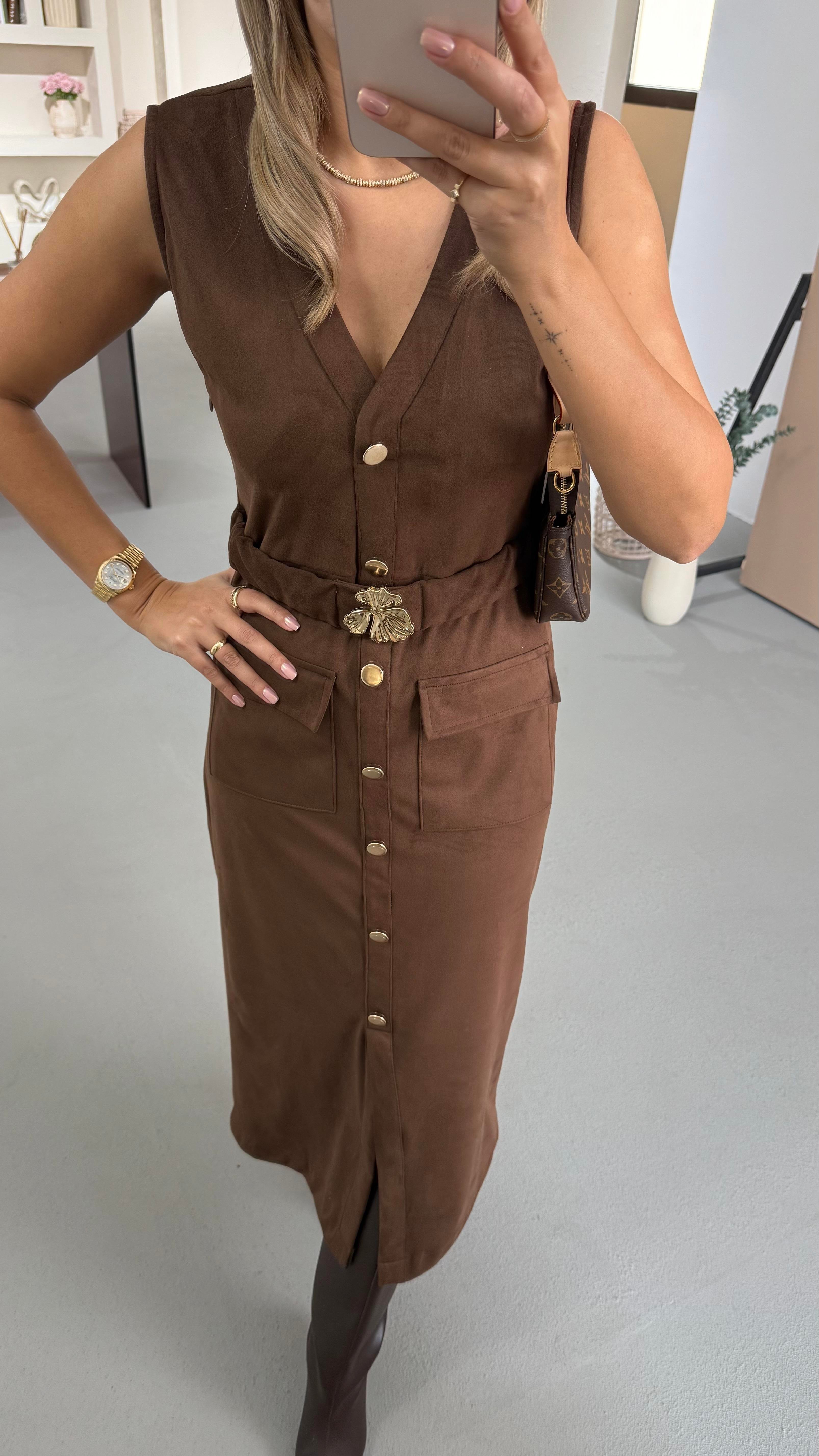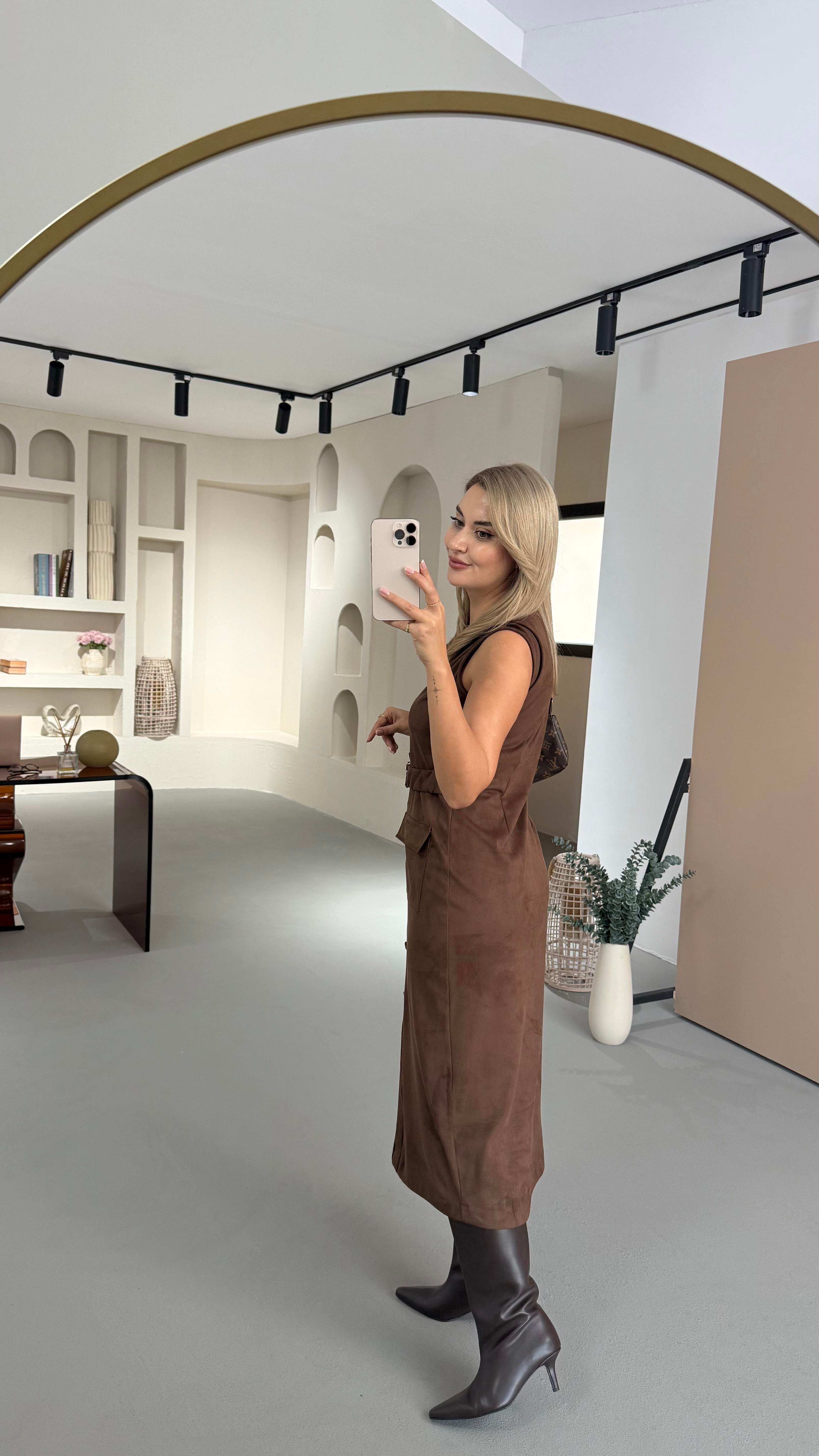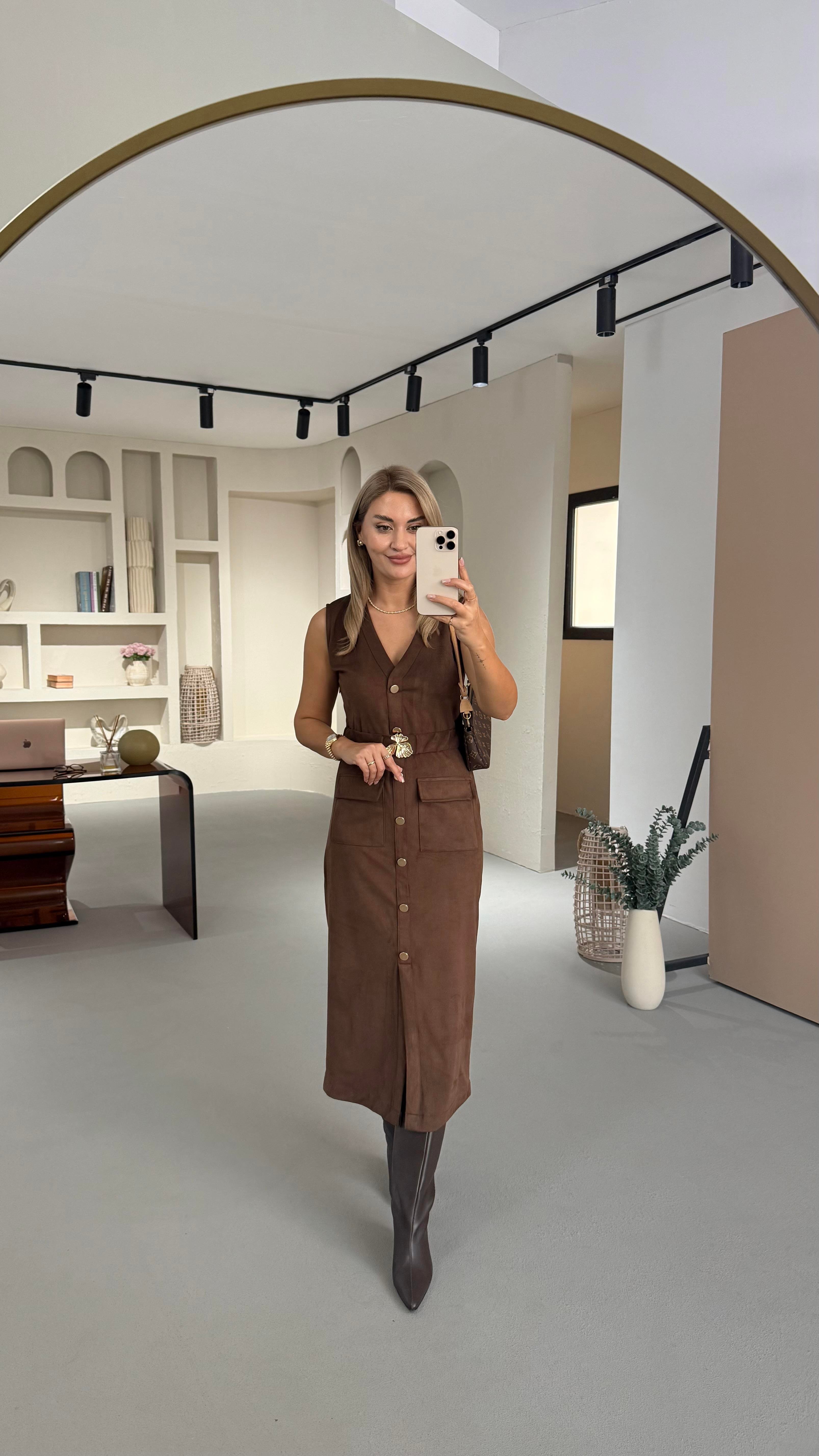 Kemer Aksesuarlı Gold Düğme Detay Kahve Süet Kalem Elbise