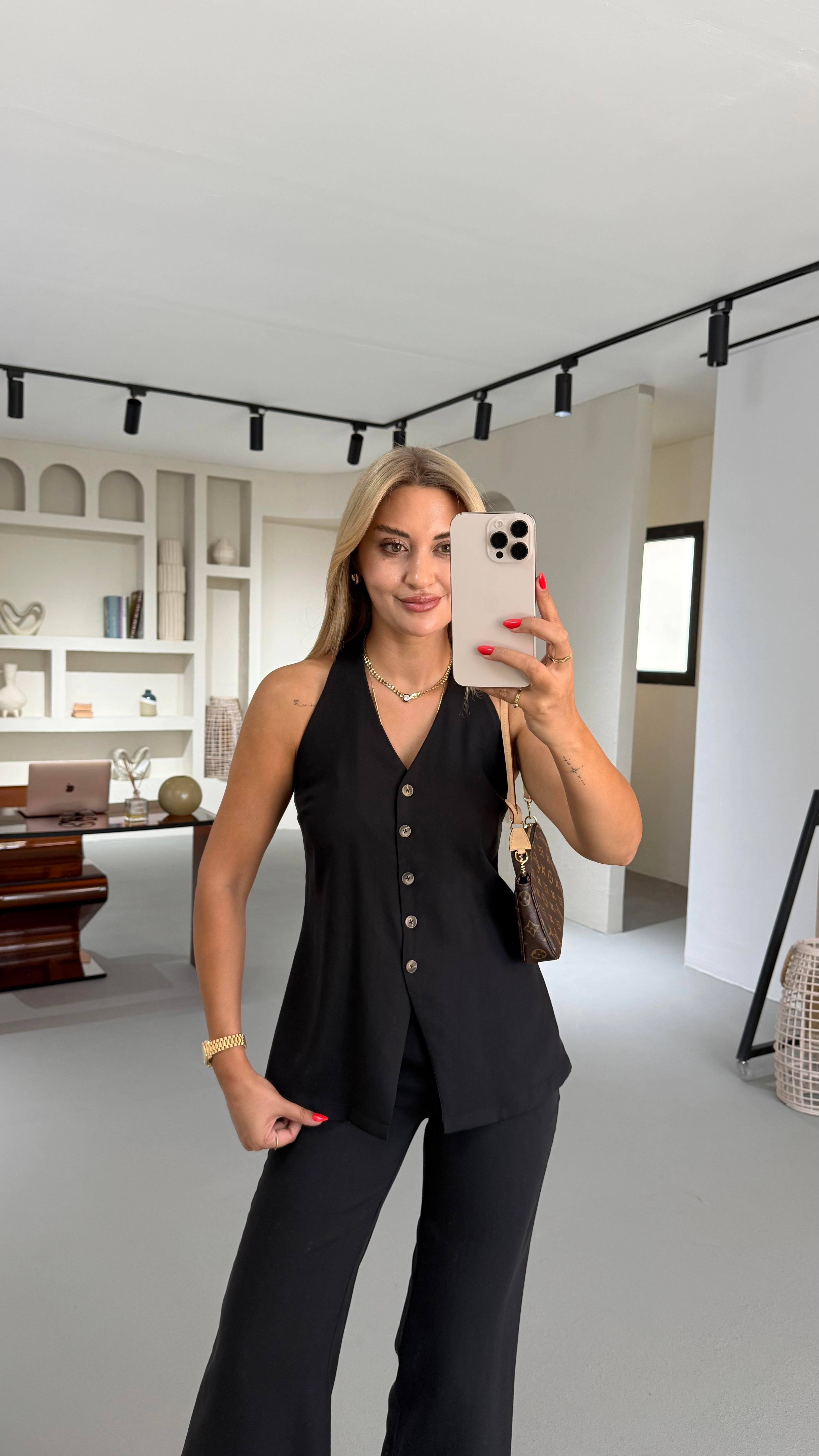 Kemik Düğmeli Sırt Detay Siyah Yelek