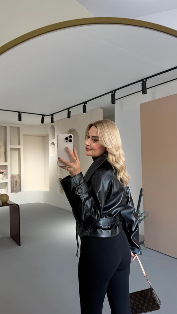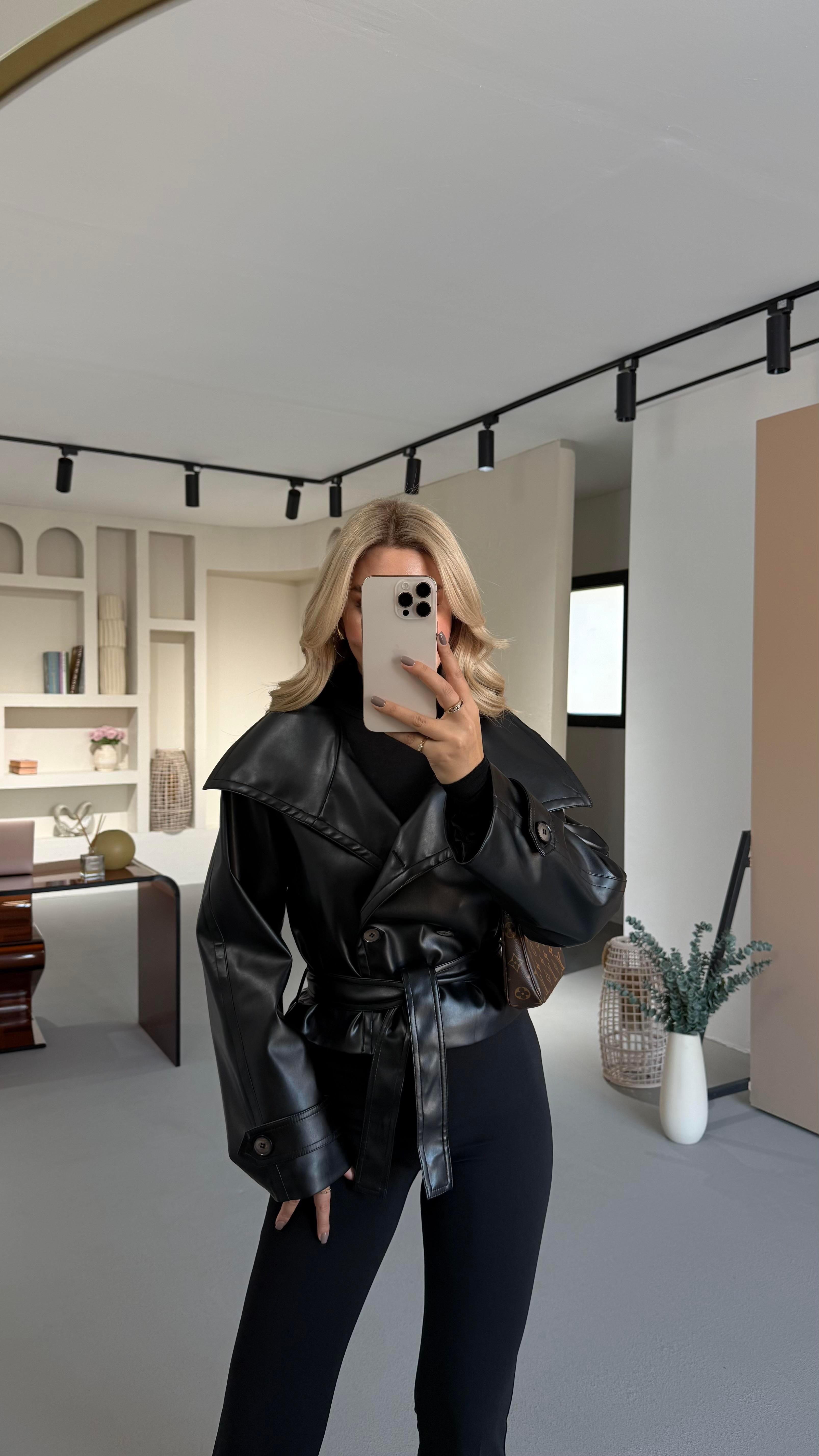 Kruvaze Kapamalı Dik Yaka Kuşaklı Siyah Deri Ceket