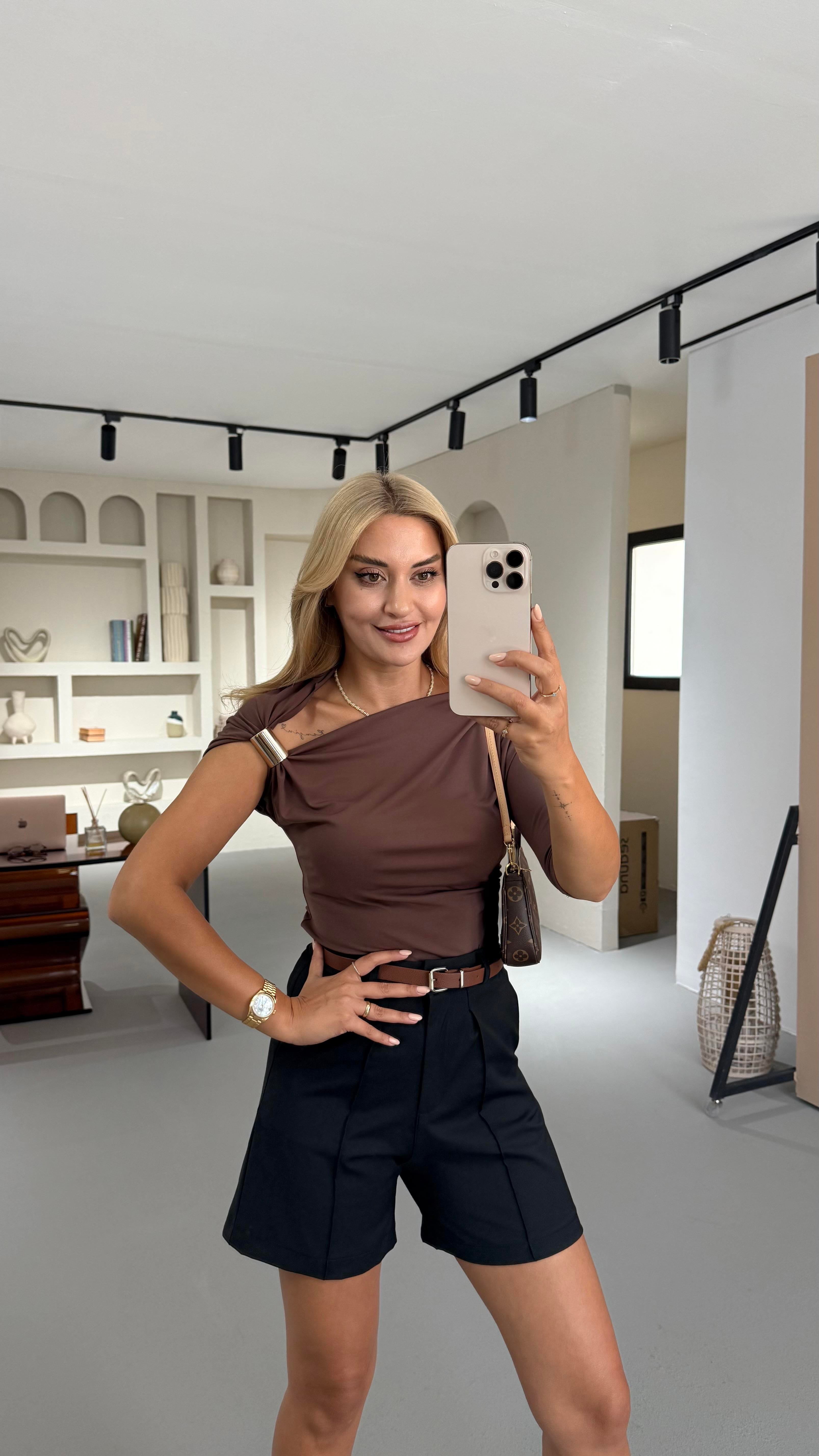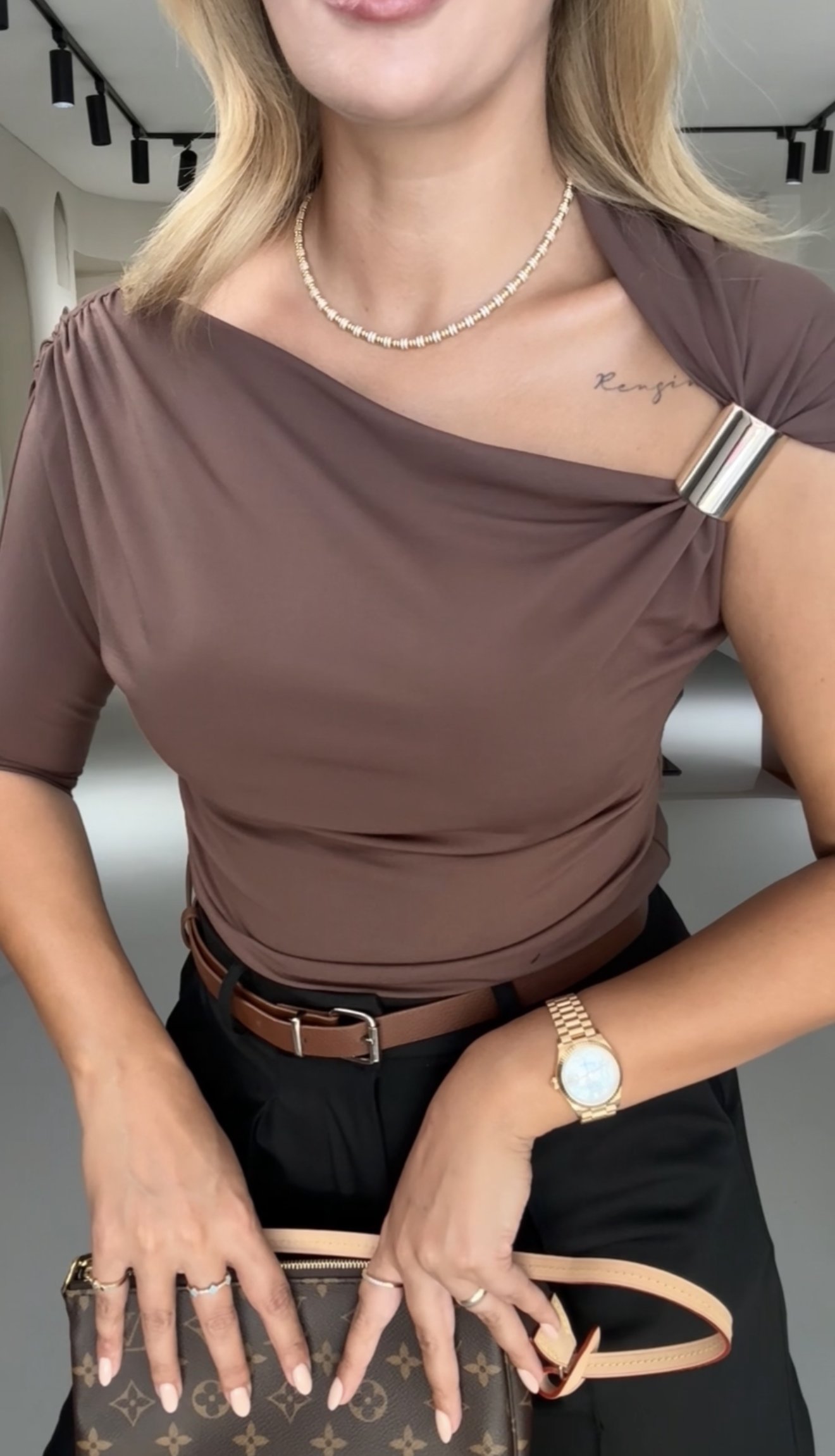 Omuz Aksesuar Detay Drapeli Kahve Bluz