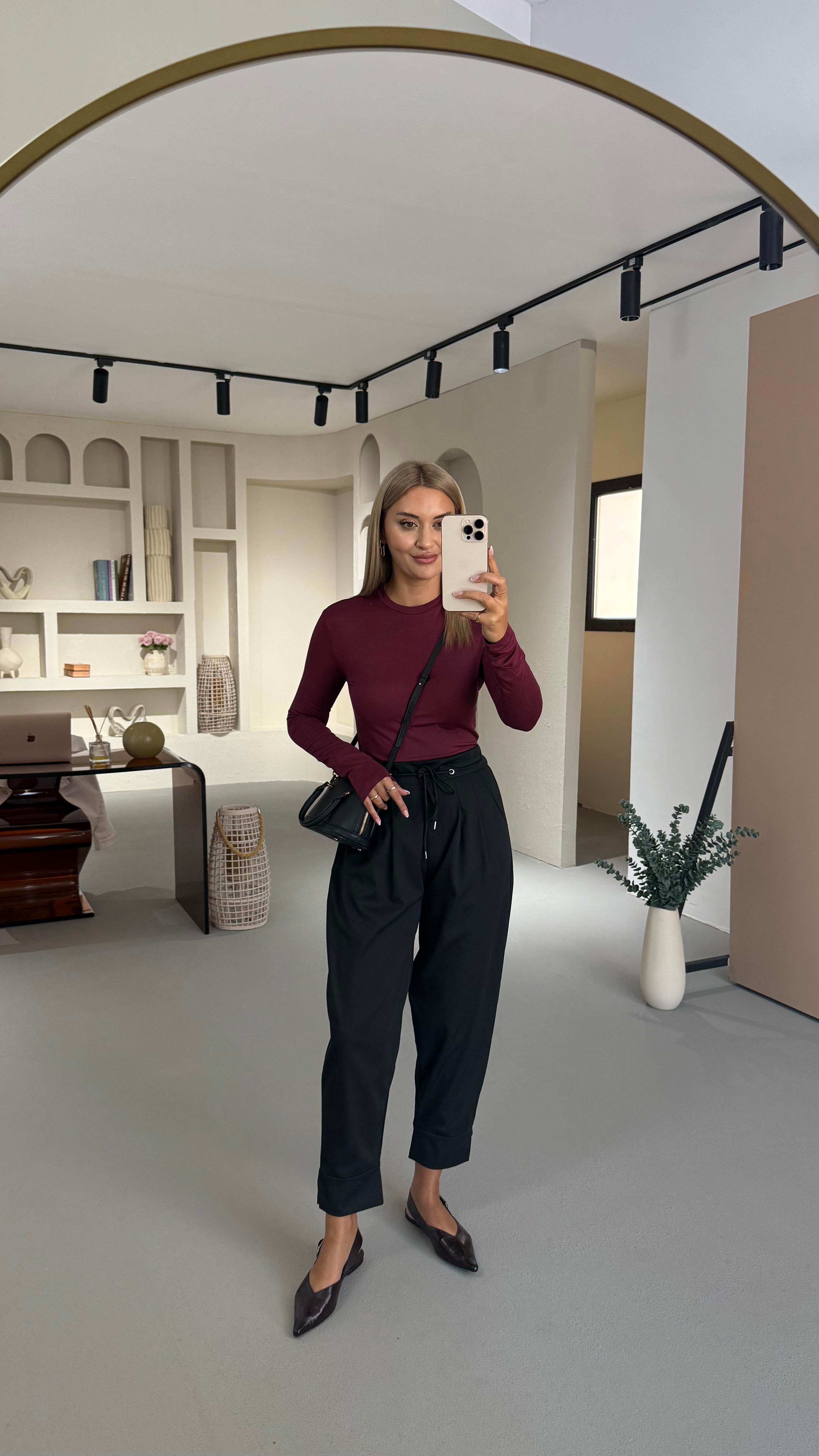 Pilise Detay Beli Lastikli Siyah Havuç Pantolon