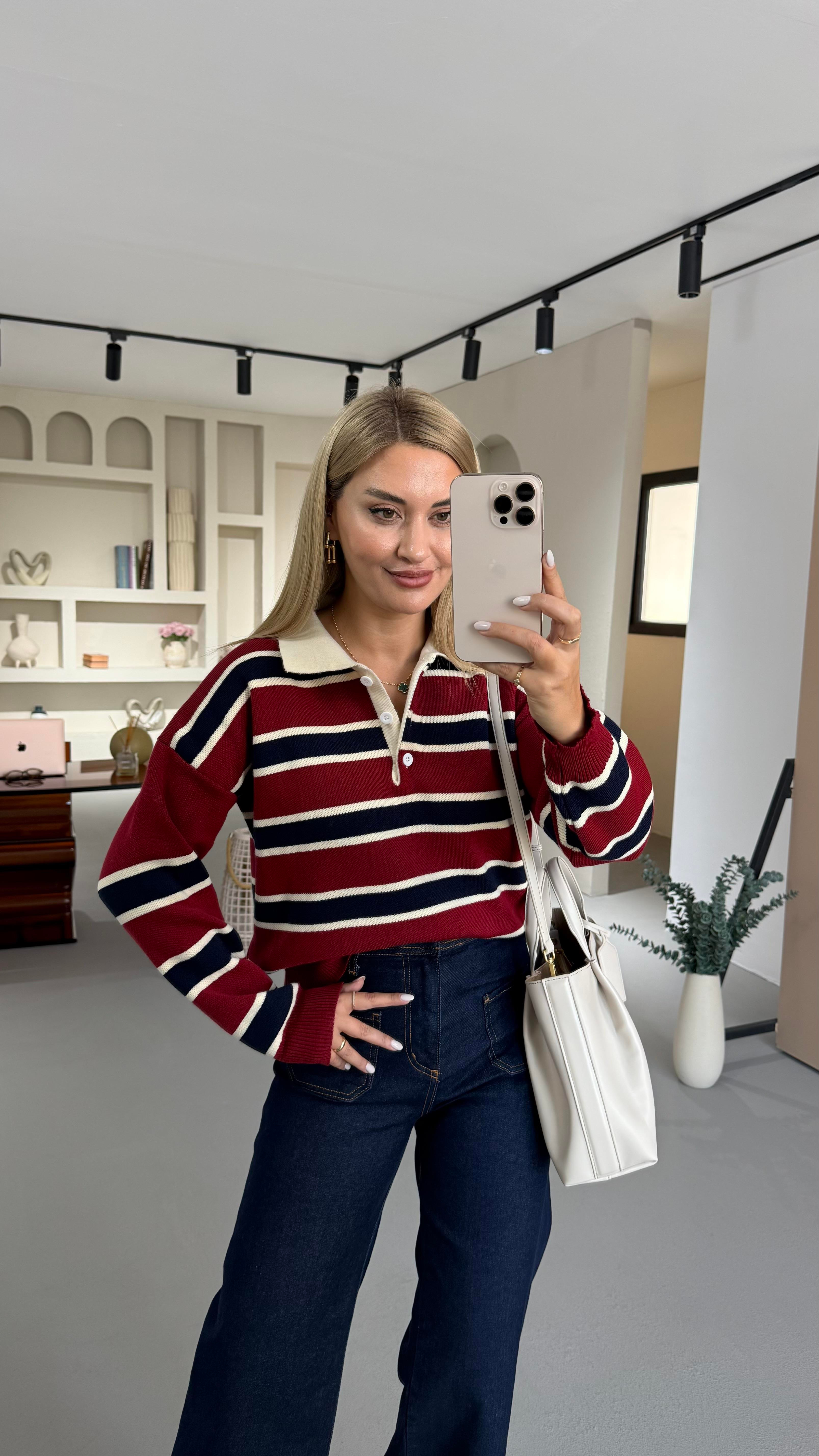 Polo Yaka Çizgili Bordo Çelik Triko Kazak