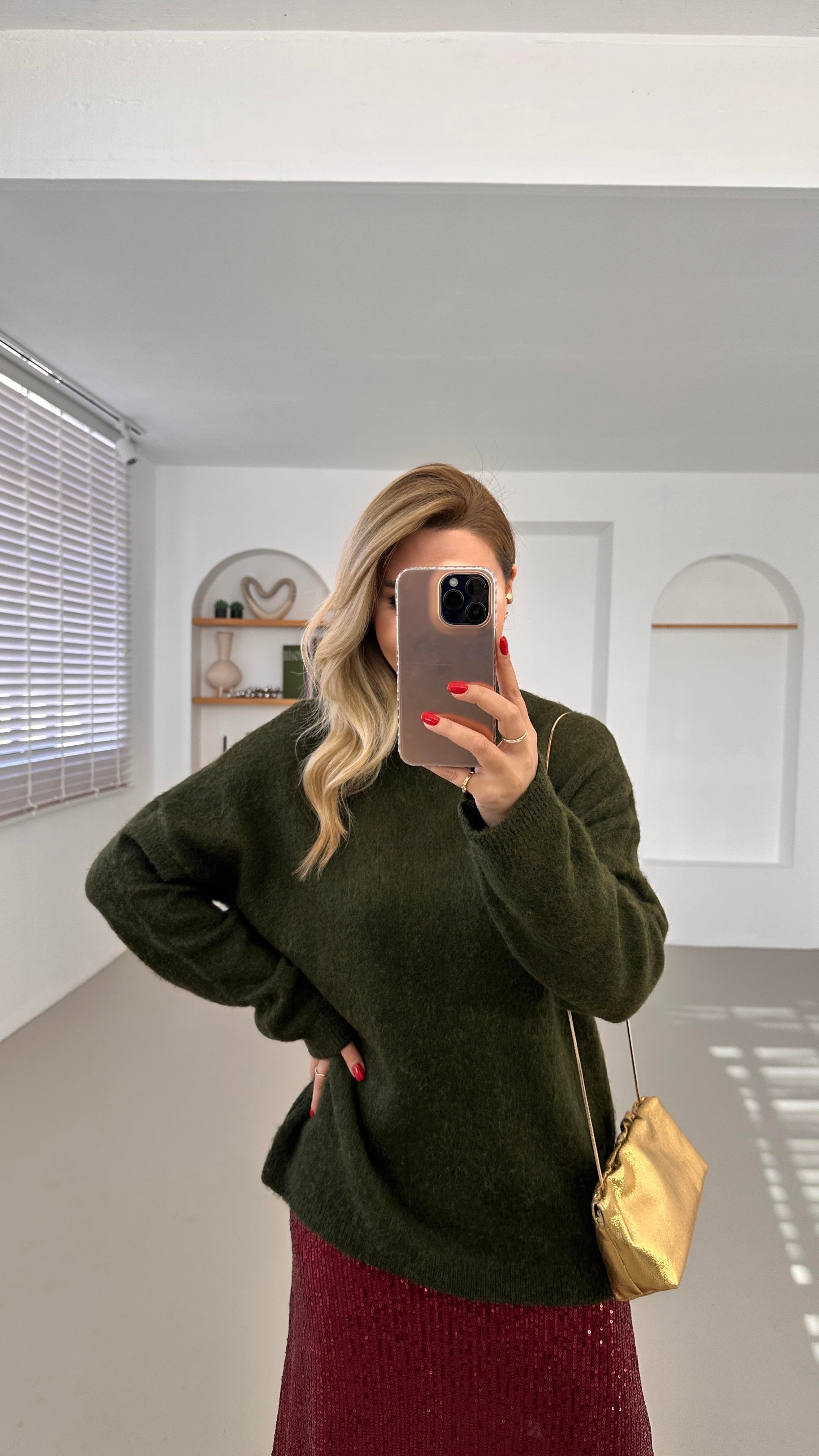 Premium Seri Bisiklet Yaka Oversize Haki Yumoş Kazak (KZK-0115-HAKİ)