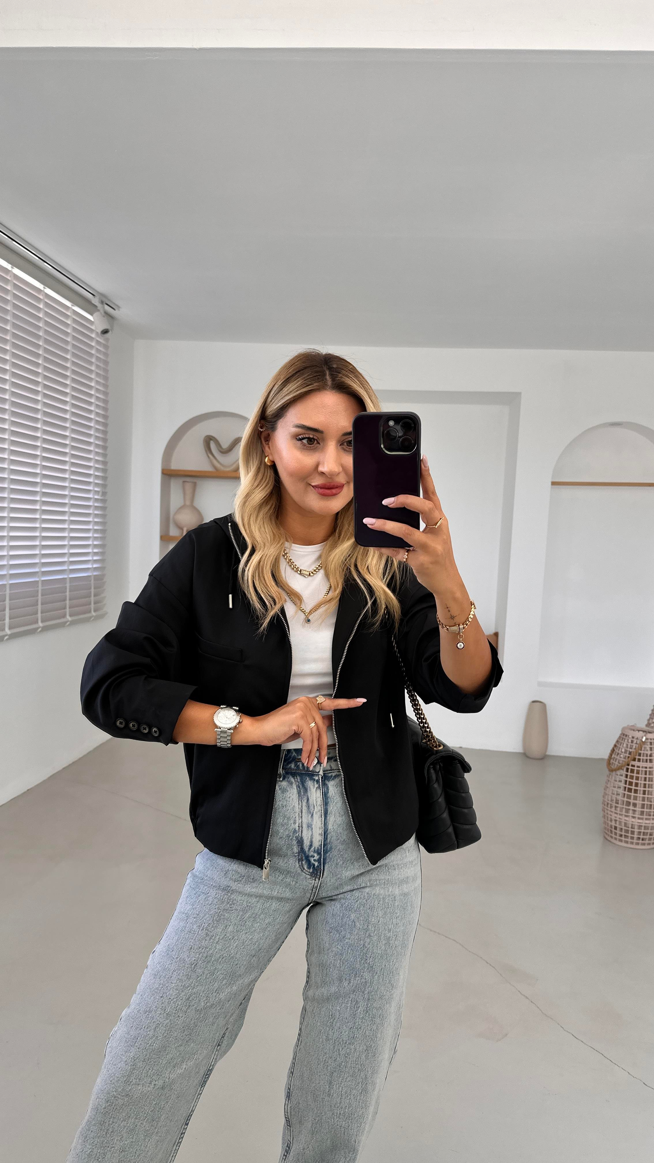 Premium Seri Kapüşonlu Kol Düğme Detay Maskülen Siyah Bomber Ceket