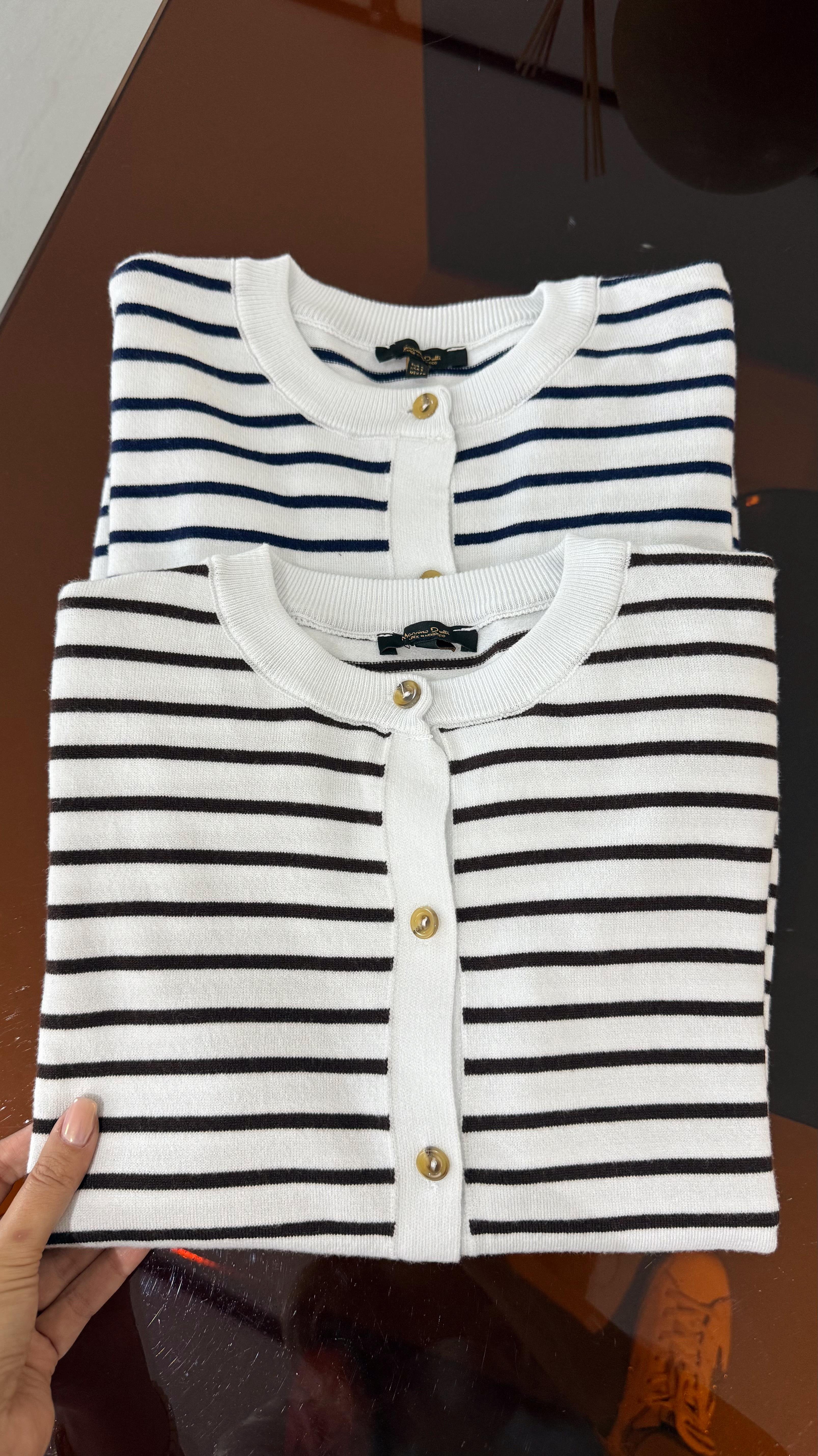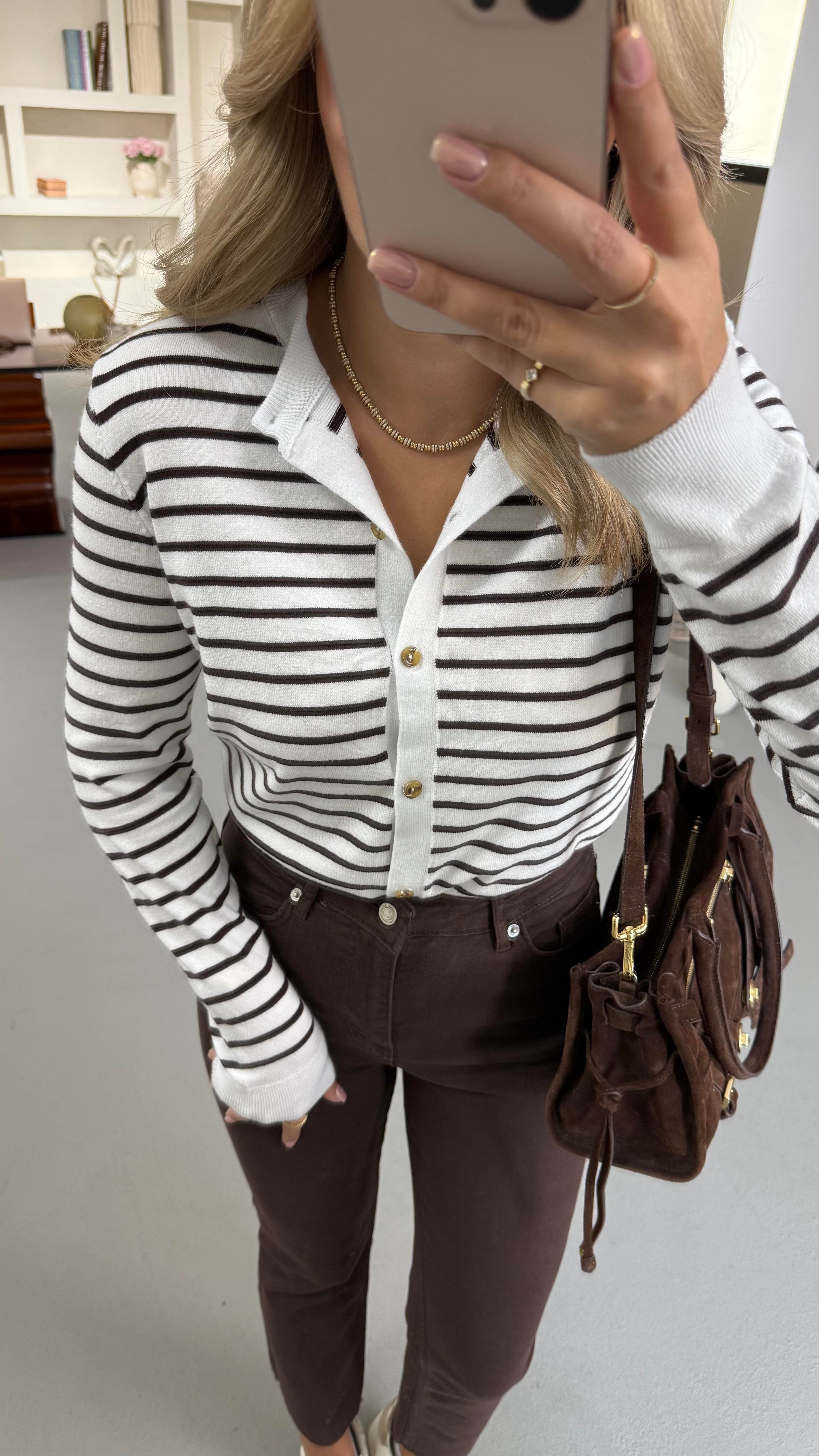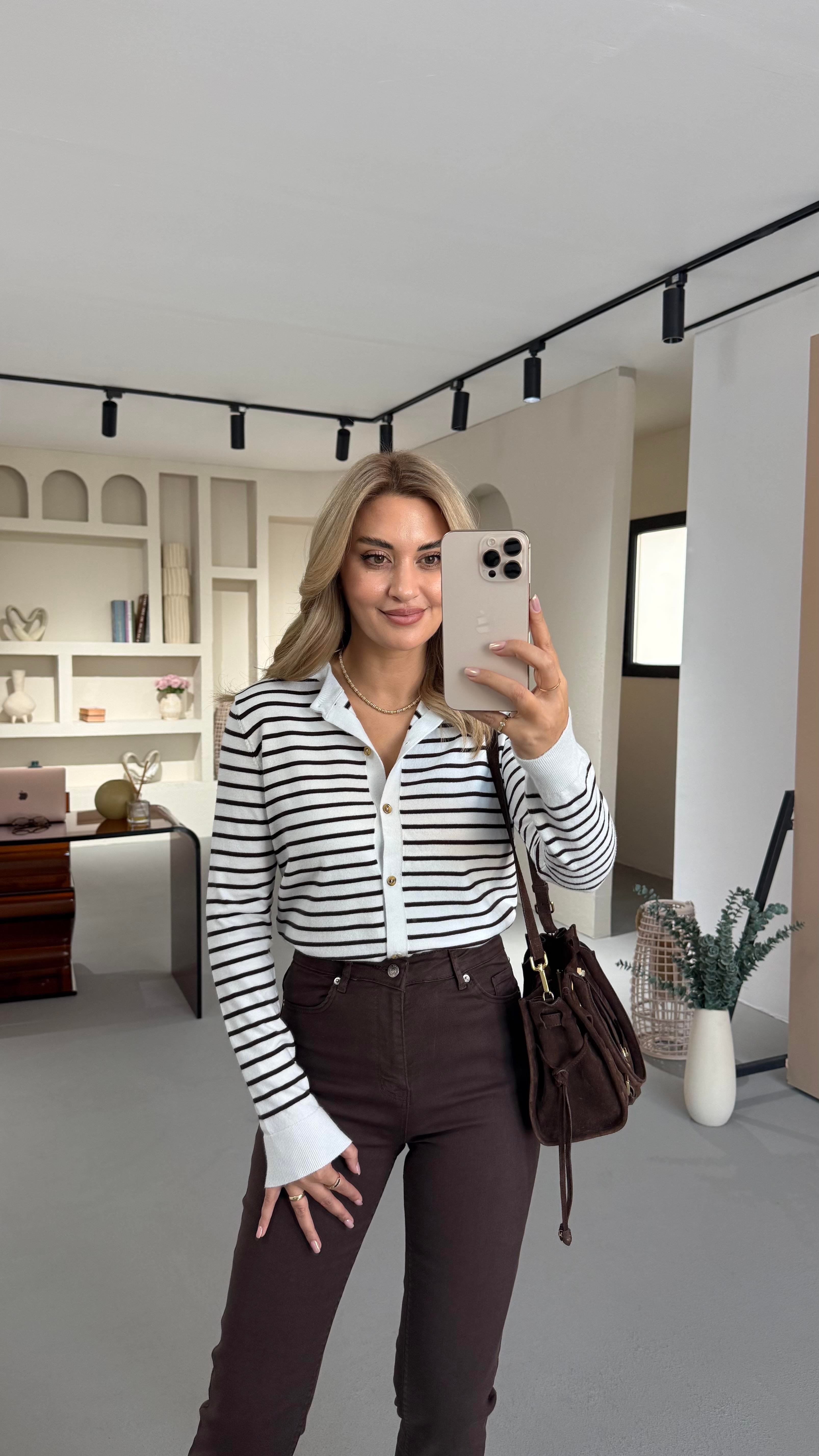 Premium Seri Kemik Düğme Detay Kahve Çizgili Yumoş Hırka