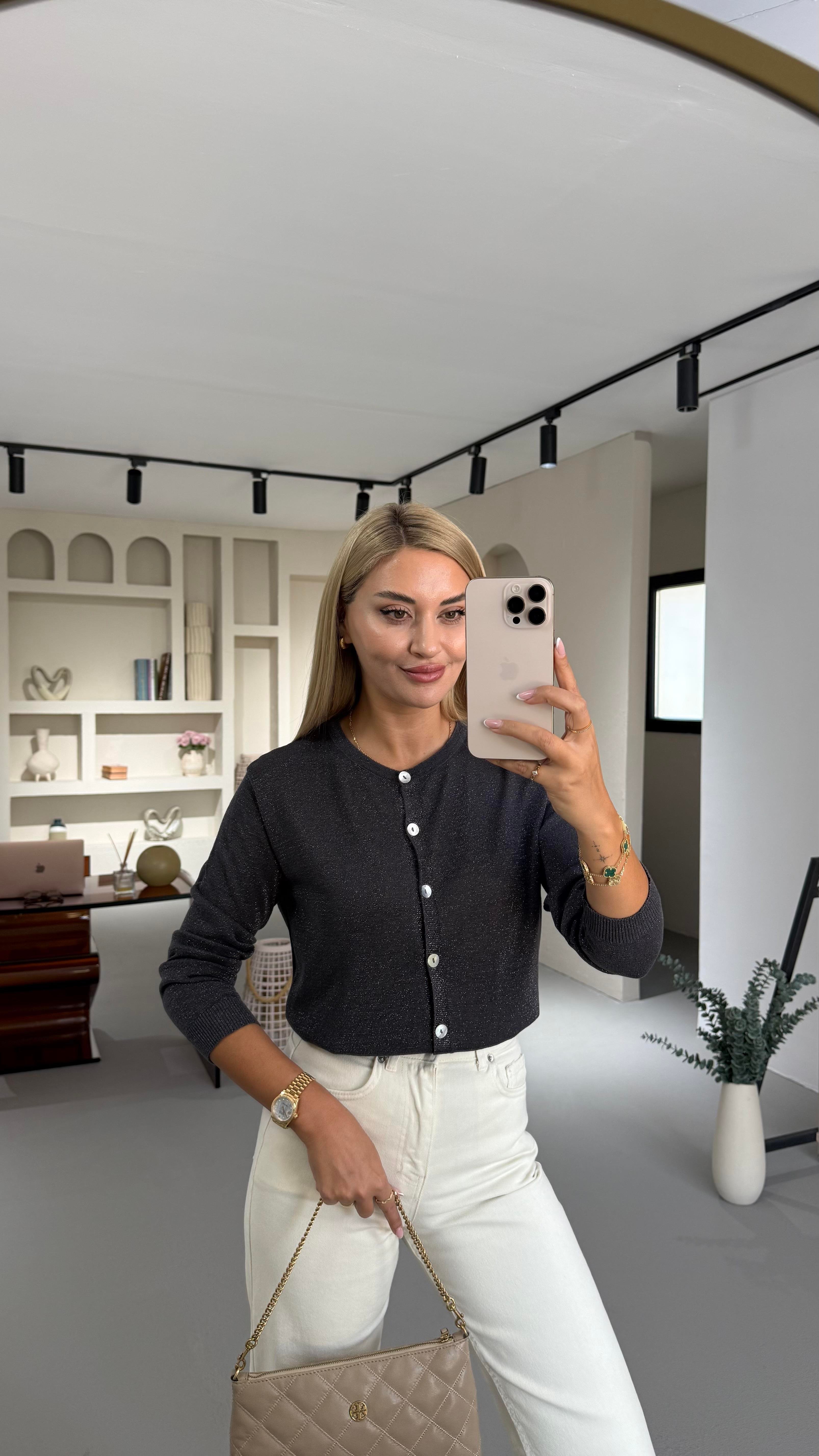 Sedef Düğme Detay Antrasit Simli Hırka (HRK-0077-ANT)
