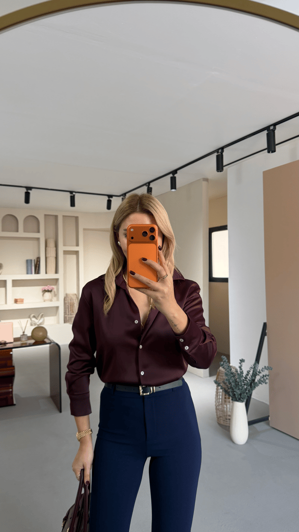 Sedef Düğmeli Mürdüm Saten Gömlek